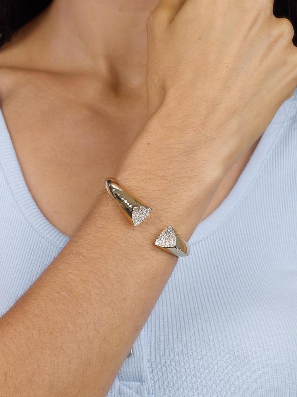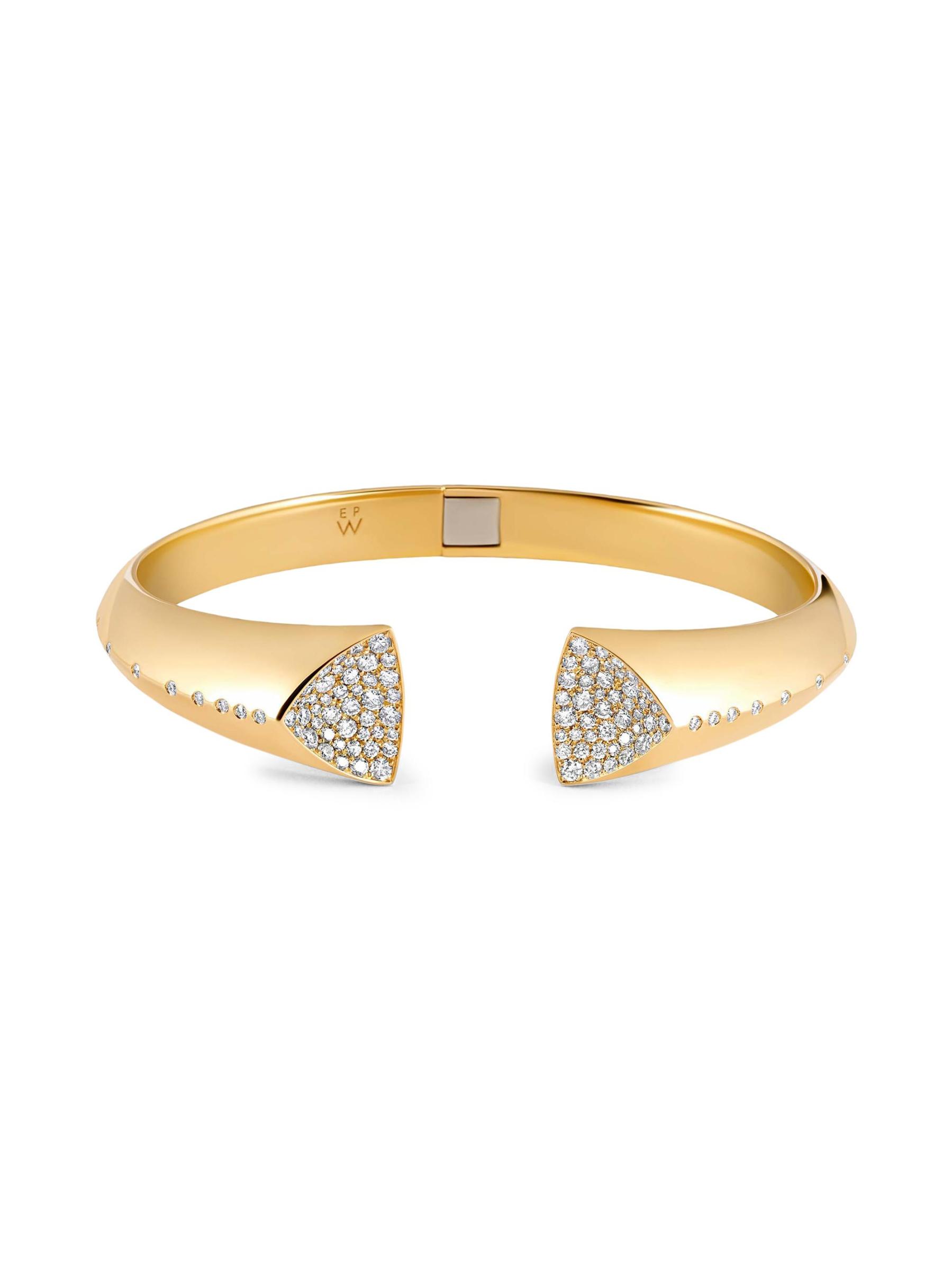 من مجموعة التوقيع. هذا السوار الأنيق المصنوع من الذهب الأصفر عيار 18 قيراطًا مستوحى من الأجزاء الداخلية من الجيود اللامع، وهو مزين بأحجار الماس المرصوفة والمرصعة بشكل متدفق.