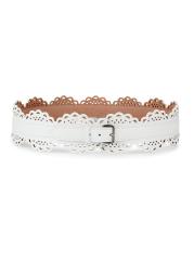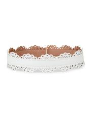 يُبرز حزام الخصر من Alaïa، المصنوع من جلد العجل الإيطالي الناعم، تصميمًا مزينًا بالإسكالوب وفتحات هندسية مستوحاة من الدانتيل.