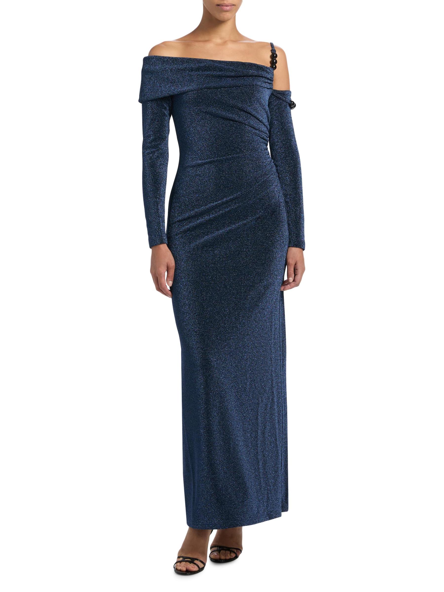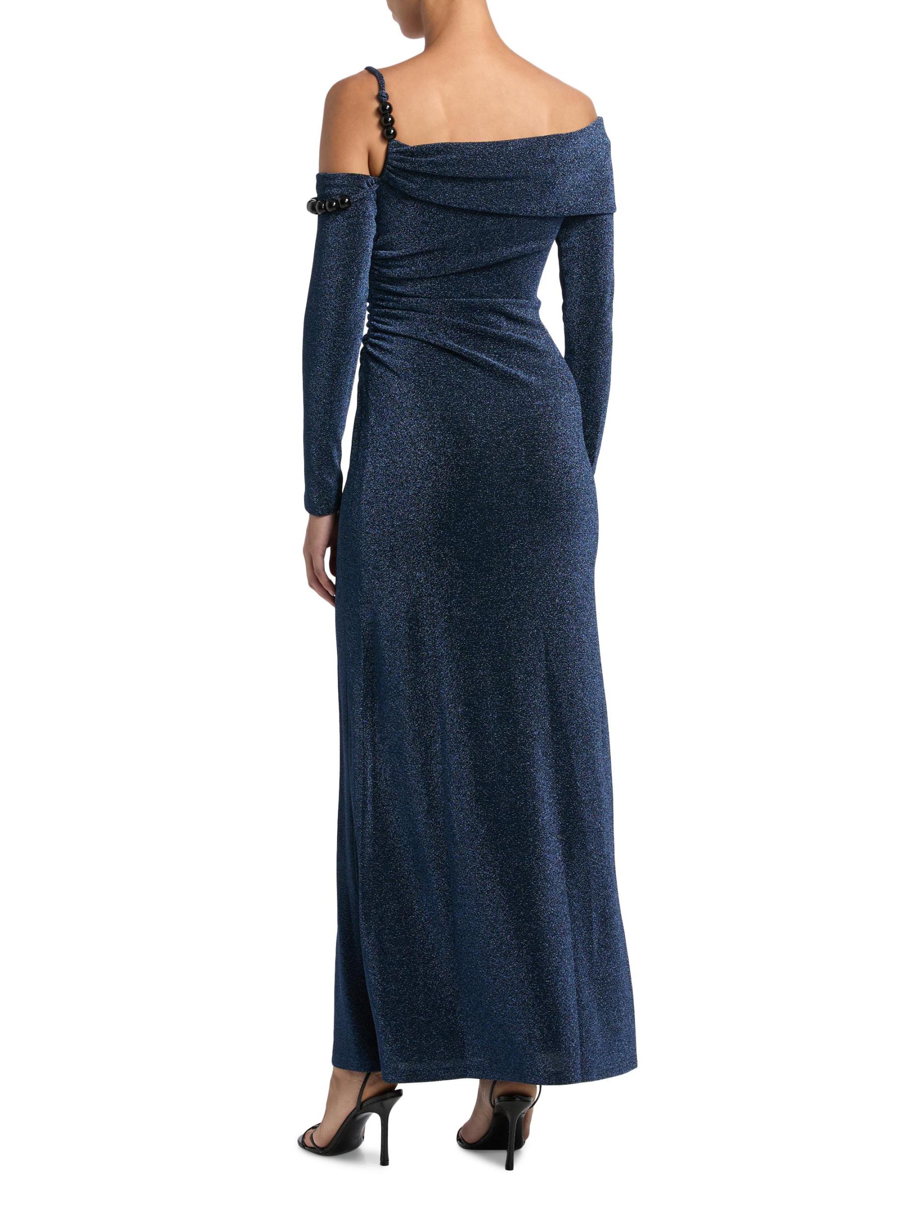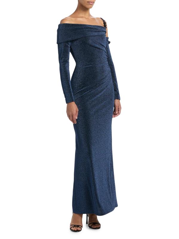 حصري. يتميّز فستان «جيا» من شركة «سيجننت أوثر»، المصنوع من قماش معدني قابل للتمدد، بتقويرة مكشوفة الكتفين مزينة بأحزمة مزيّنة بالخرز على الكتف الأيسر والجزء العلوي من الذراع، وتفاصيل مُجمّعة عند الخصر الأيسر.