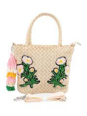 حقيبة Bari Lynn مصنوعة من الرافيا ومزينة بالزهور المطرزة المزينة بالخرز والشراشيب القابلة للإزالة.مقابض علوية مزدوجة إغلاق بسحّاب علوي جيب داخلي بسحّاب مستوردة