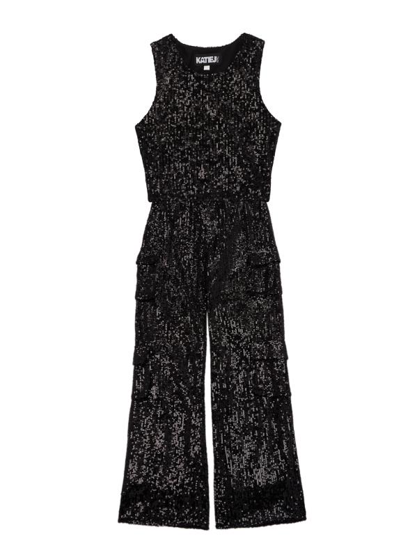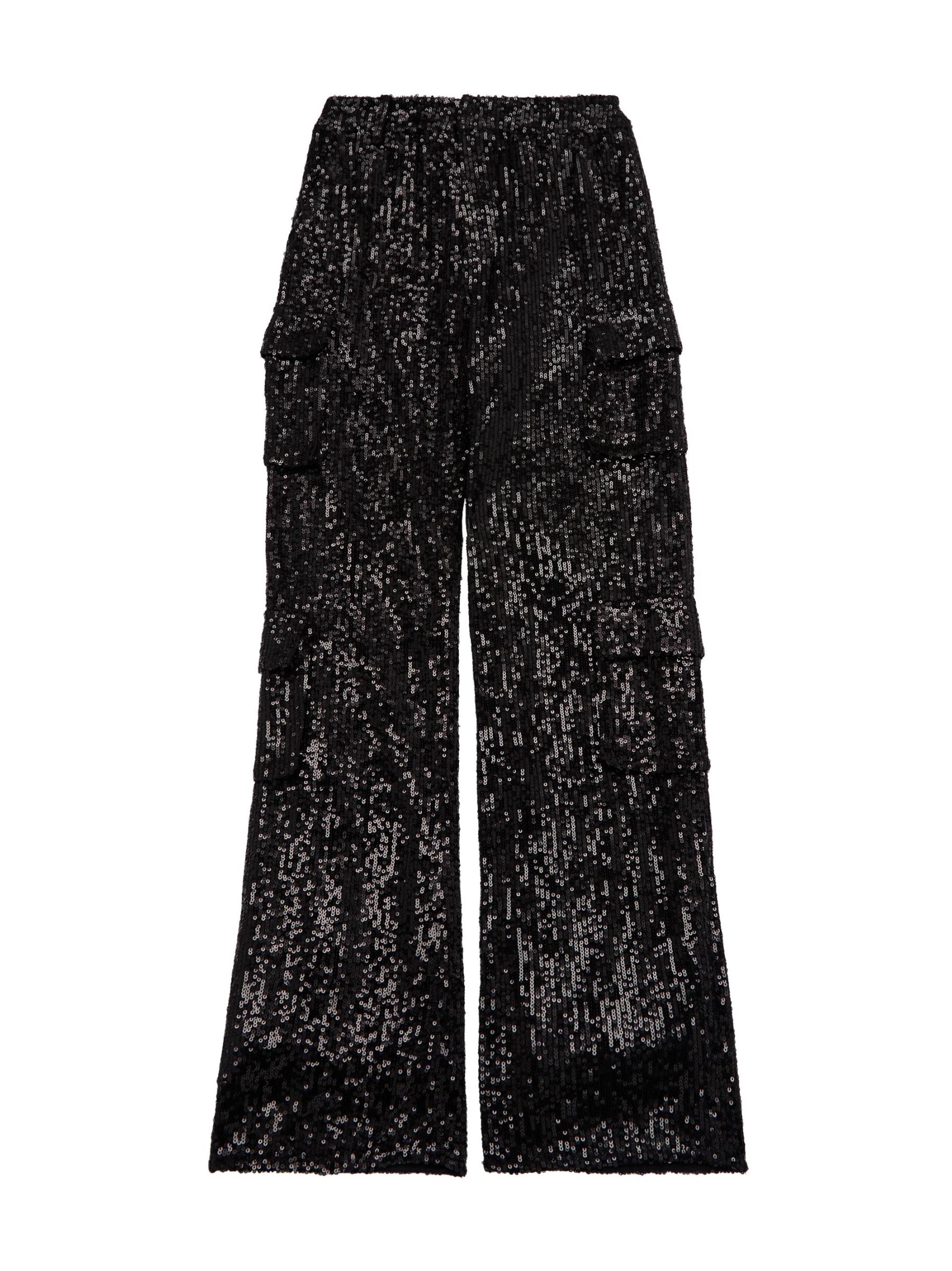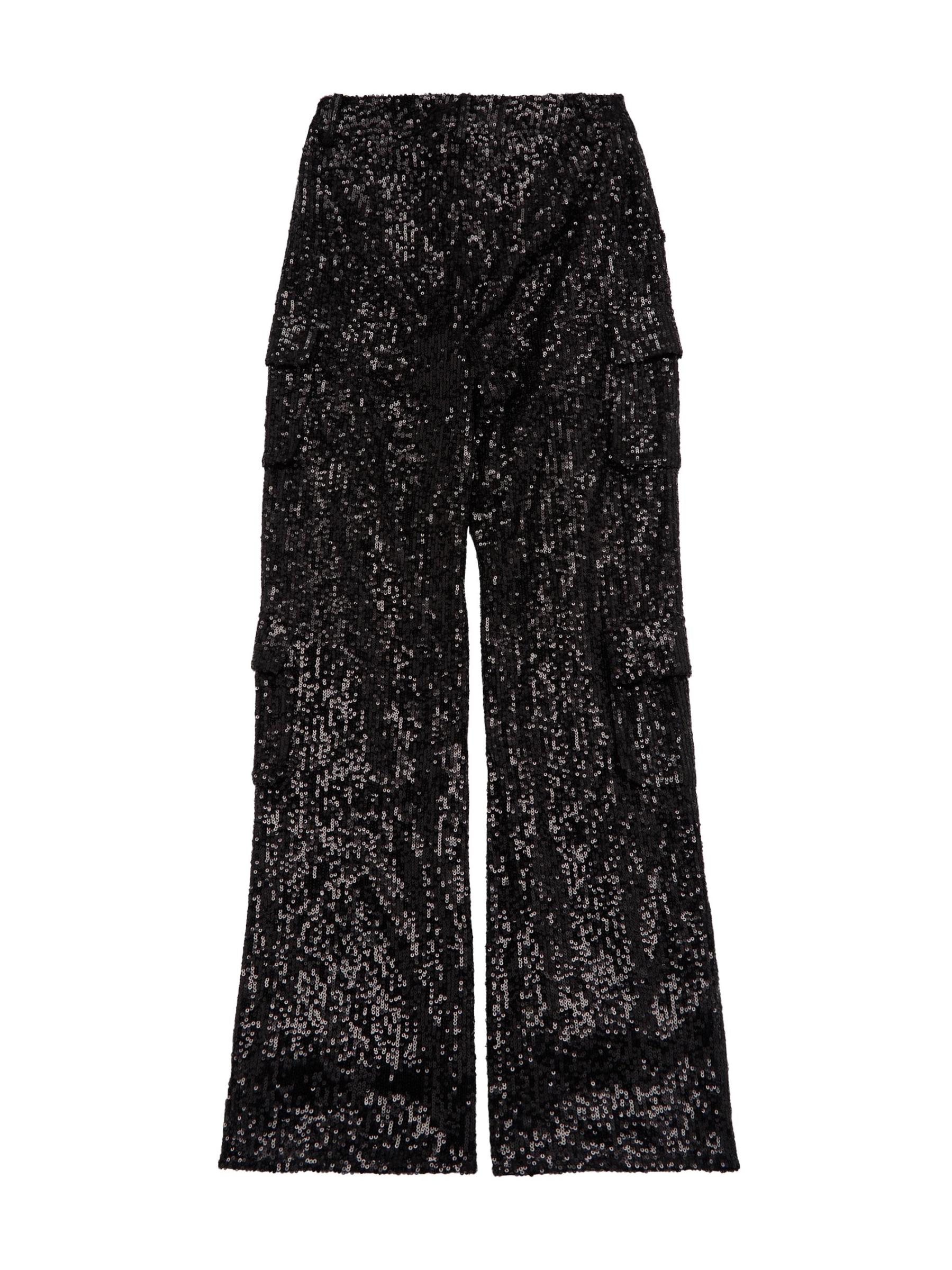 يتميز بنطال Levi Cargo من KatieJ NYC، المغطى بالكامل بالترتر، بتفاصيل متعددة الجيوب.