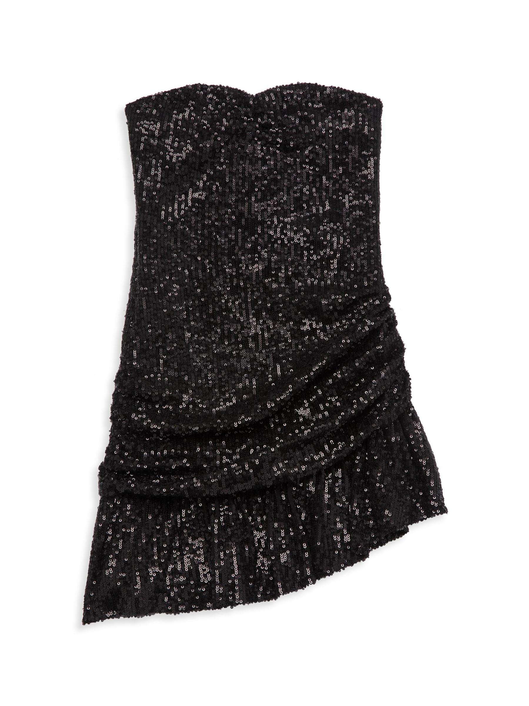 يتميز فستان KatieJ NYC بدون حمالات بتقويرة رومنسية مقروصة وحافة مكشكشة غير متماثلة. تصميم مطرز مبهر يضيف لمسة من الأناقة إلى هذا المظهر.