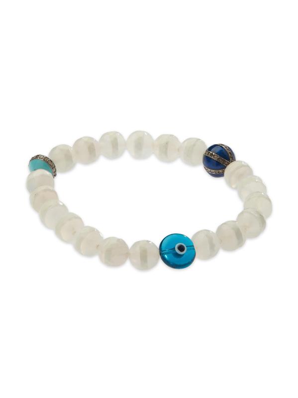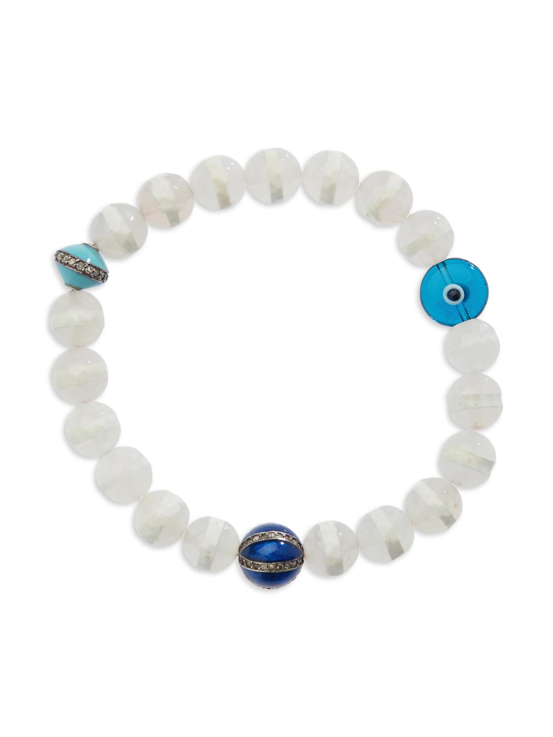 من مجموعة Globetrotter. مستوحى من رحلات المصمم ونهجه الإبداعي في التصميم، تم تزيين هذا السوار المطاطي من إليانا ماكري بخرز العقيق التبتي المخطط والأحجار الكريمة وشبه الكريمة النابضة بالحياة.ألماس رمادي، 0.62 tcw العقيق التبتي الأحجار الكريمة شبه الكريمة الفضة الإسترلينية سهل الارتداء مستوردة