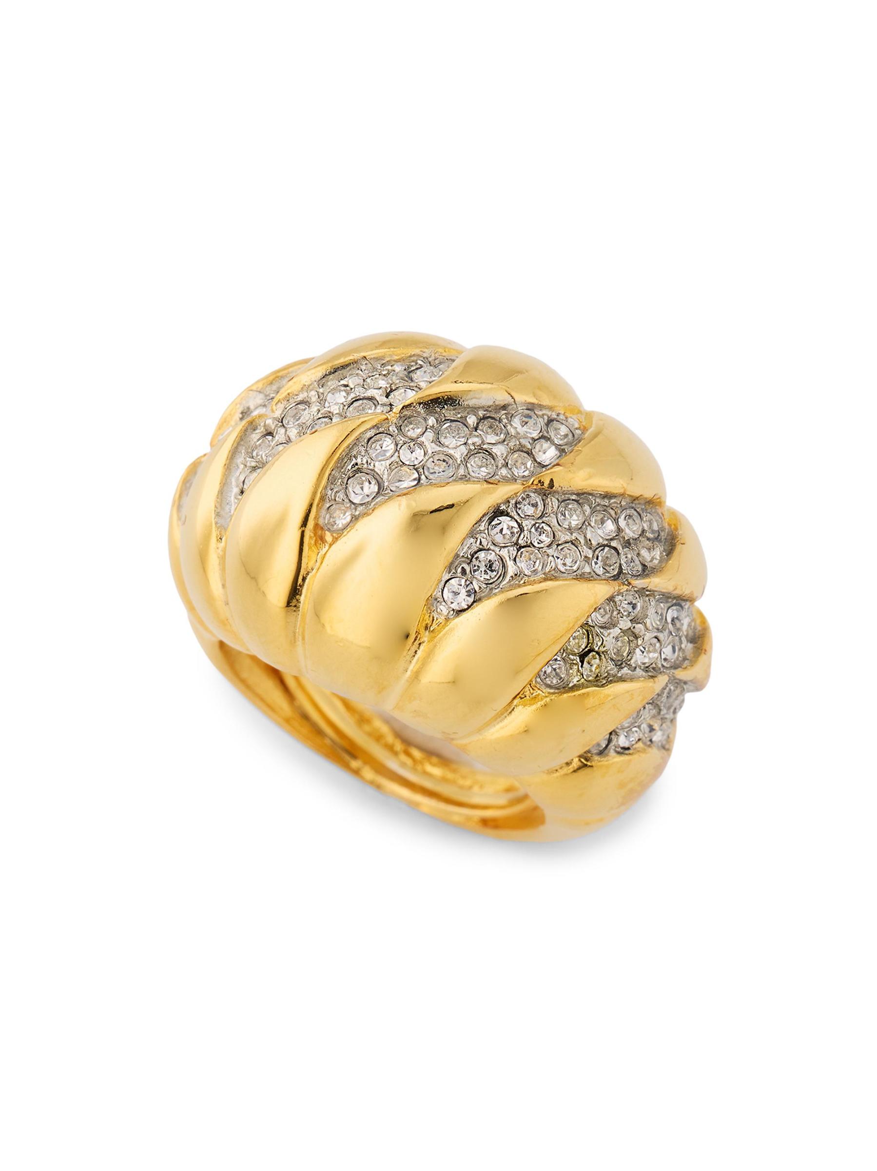 من مجموعة غولكوندا. يُظهر خاتم Wave Dome القابل للتعديل من Kenneth Jay Lane بلورات مرصعة على شريط ذهبي متموج.بلورات زجاجية نحاس صُنع في الولايات المتحدة الأمريكية