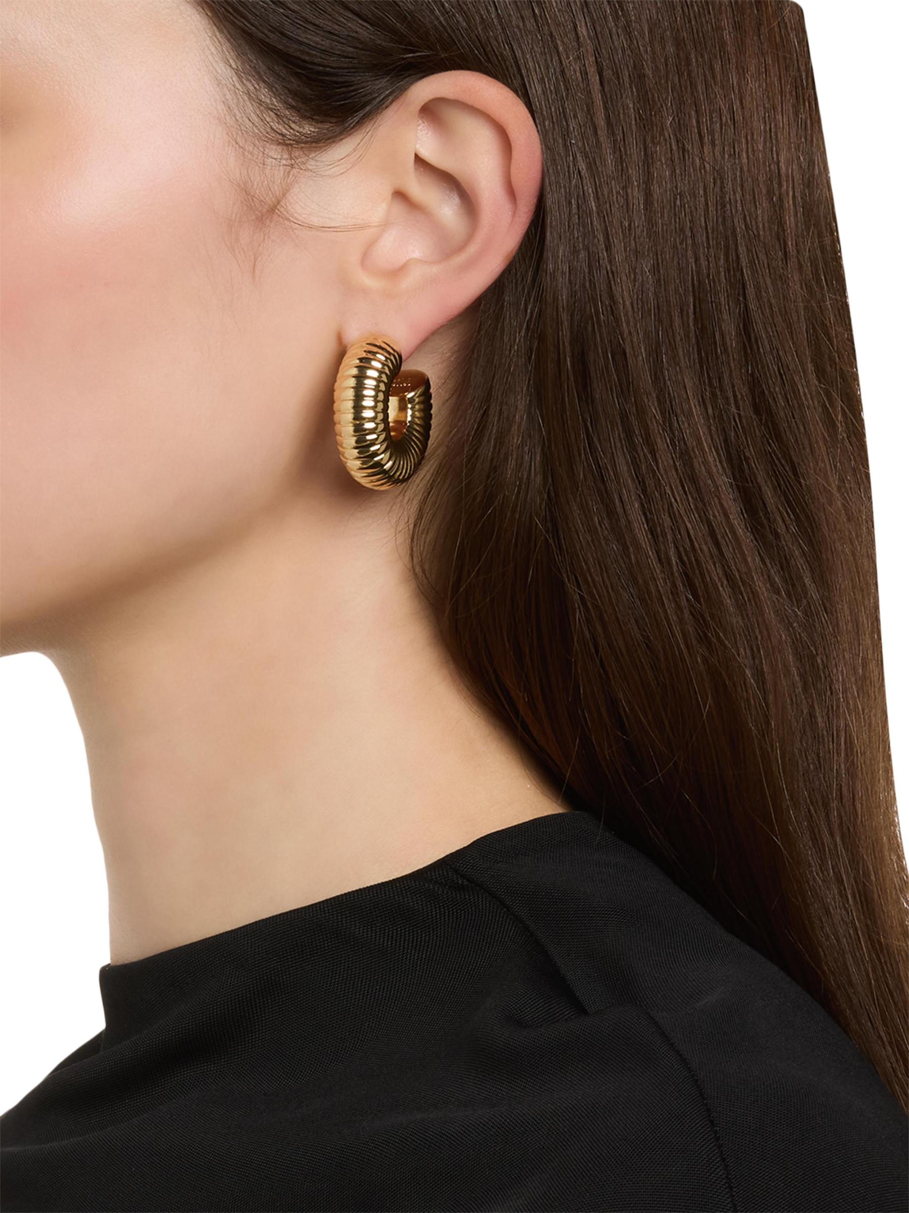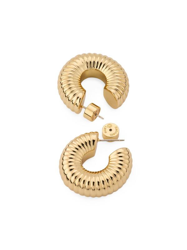تتميّز أقراط Kenneth Jay Lane الحلقية المصنوعة من المعدن الذهبي بنسيج مخدد ولامع، بتصميم سميك.