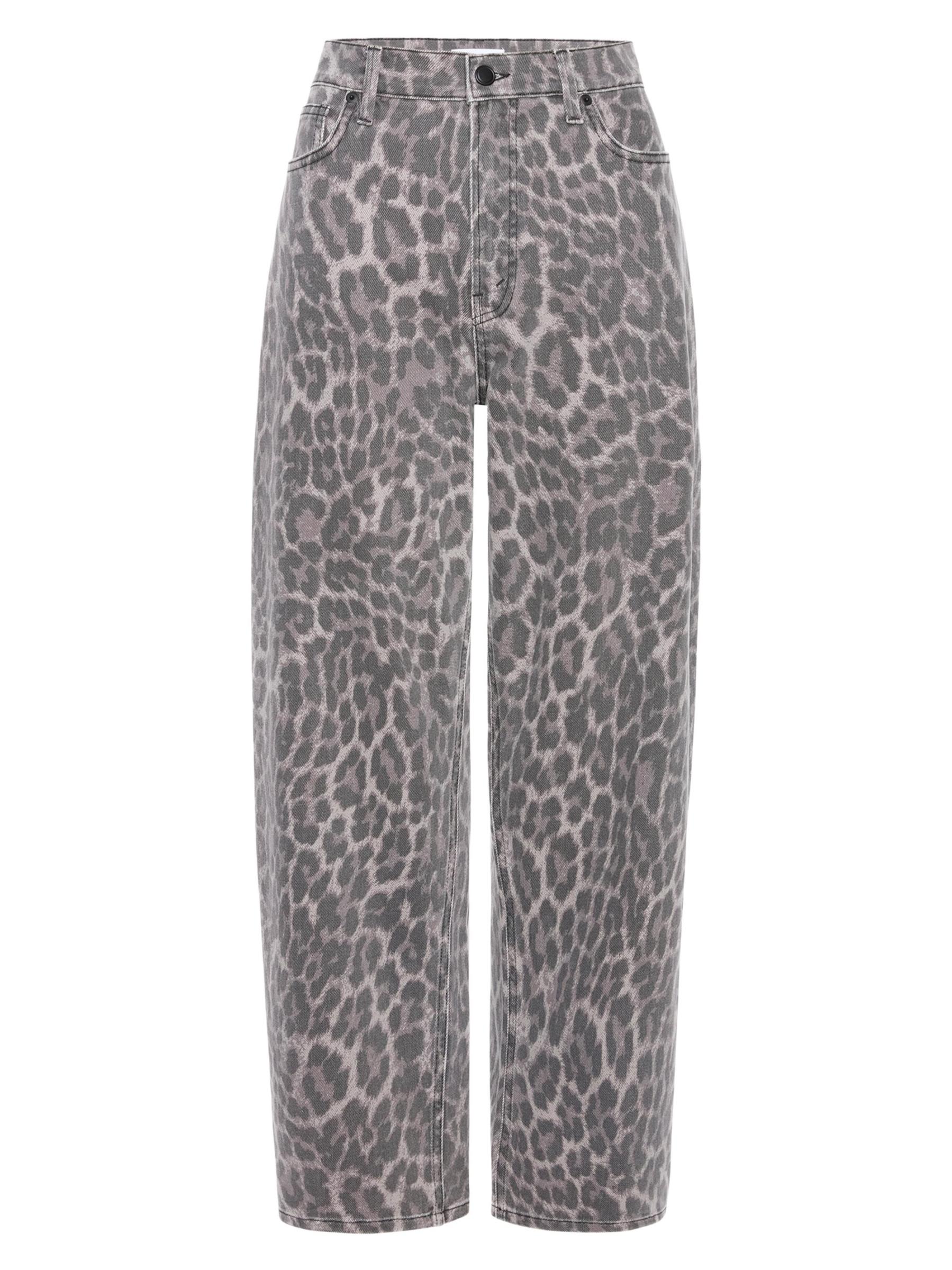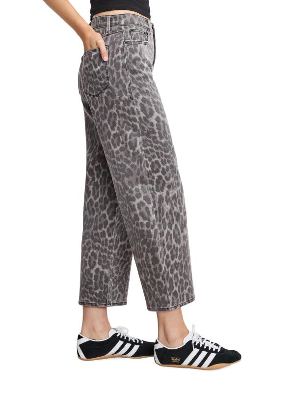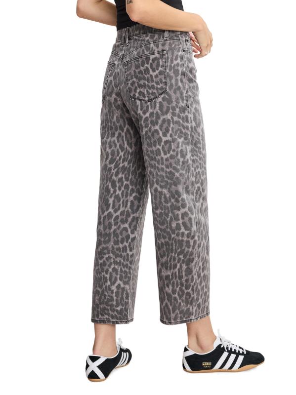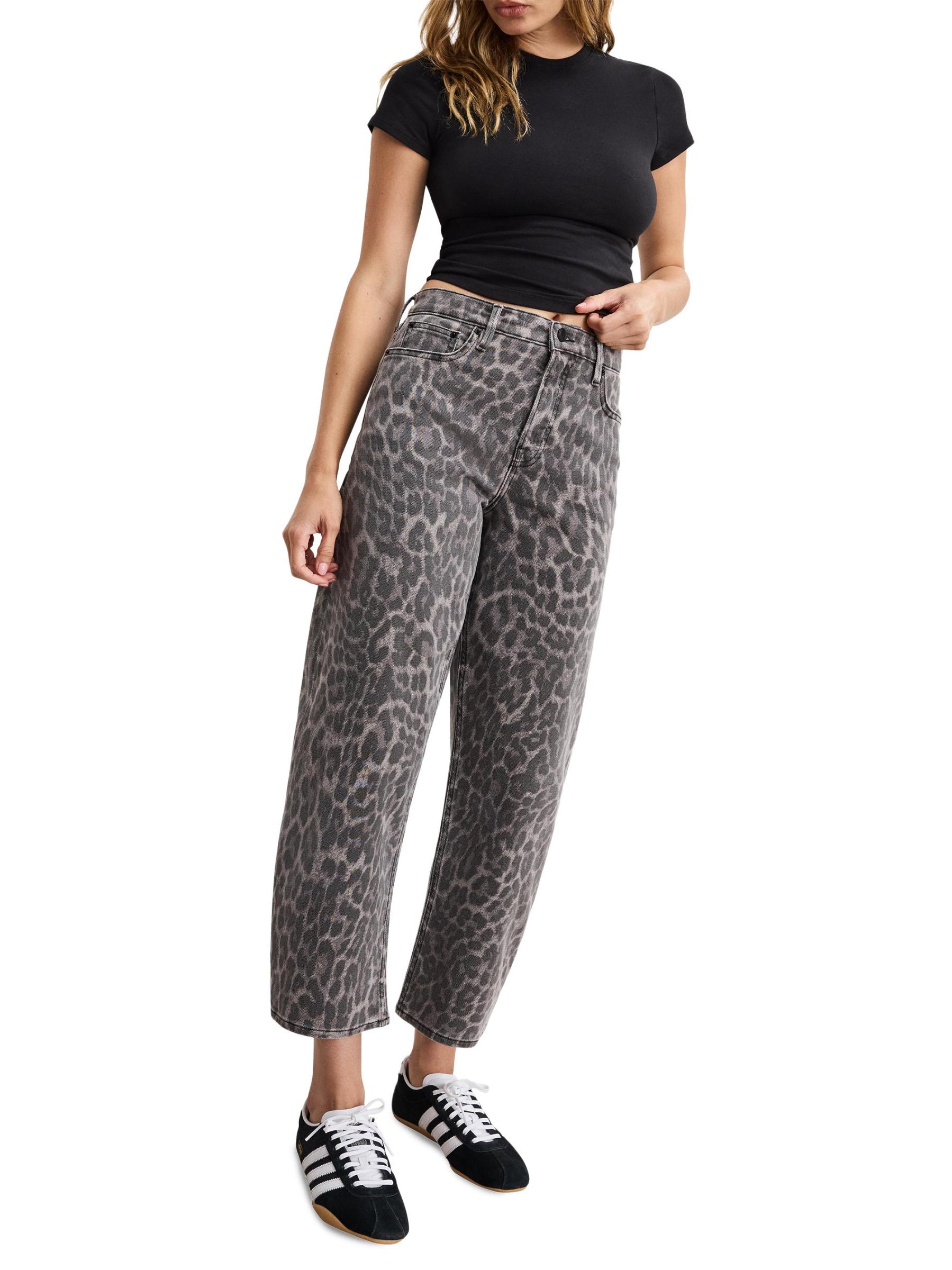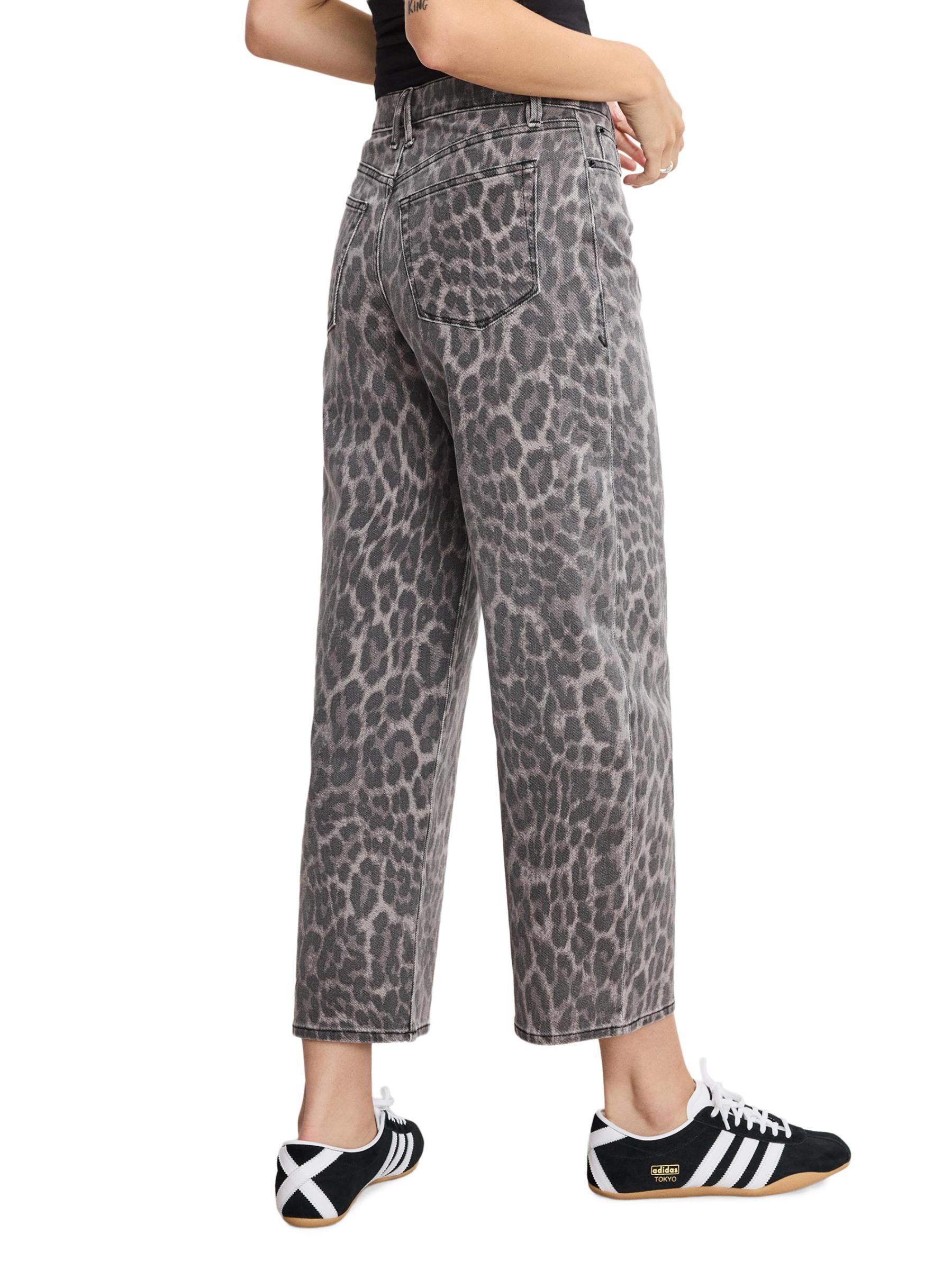 يتميز بنطال جينز Good Standard الأسطواني من Good American بنمط كلاسيكي بخمسة جيوب ونقش جلد الفهد الباهت وقصّة متوسطة الارتفاع.