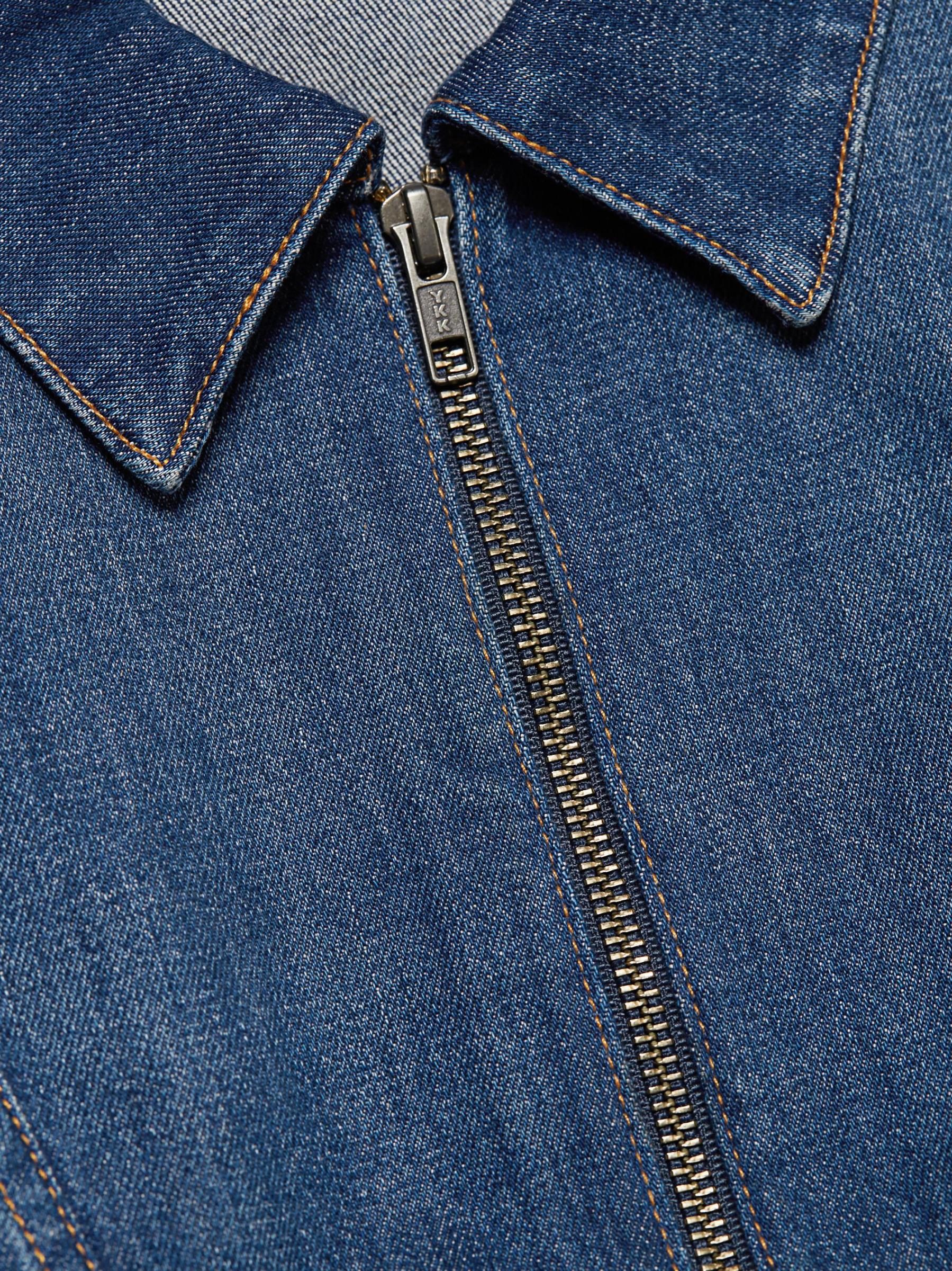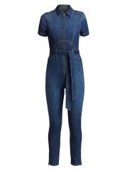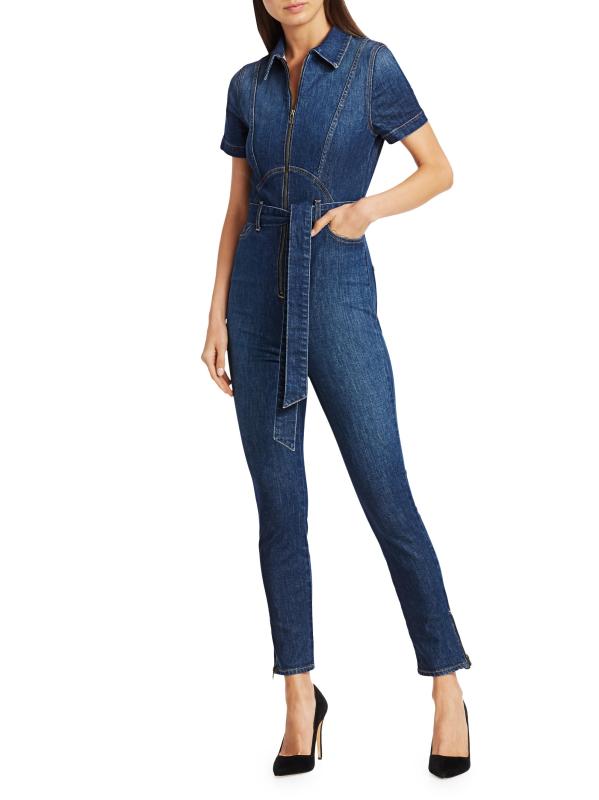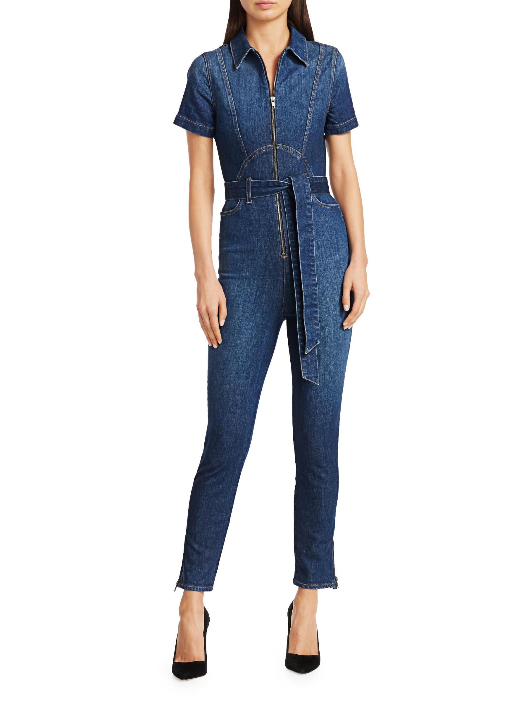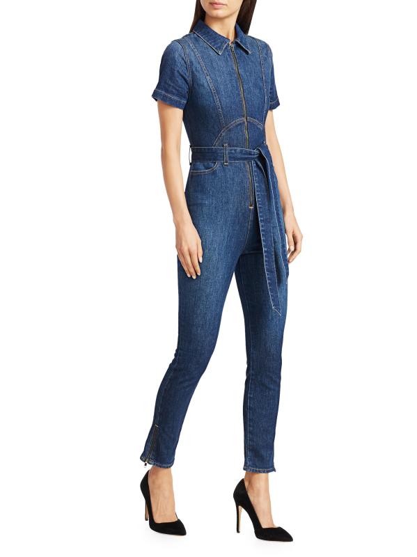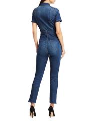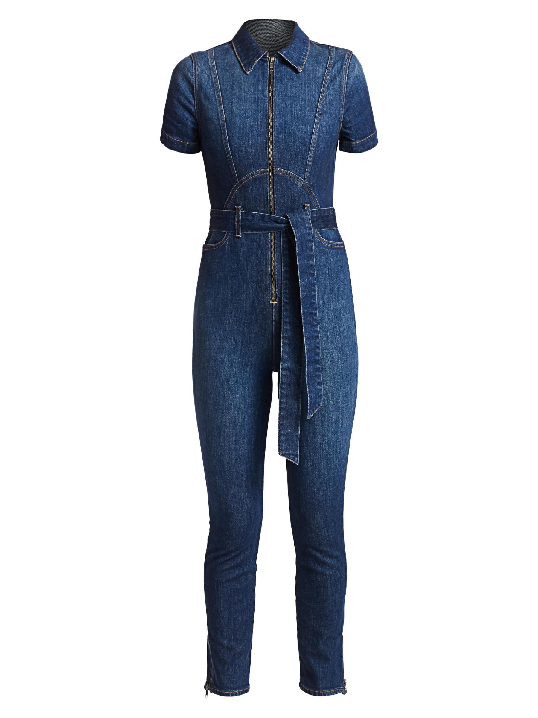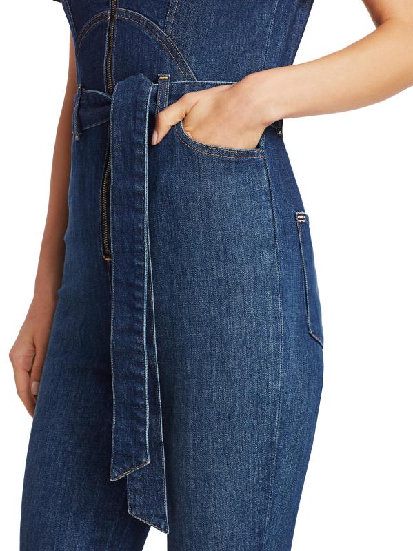 ارتدِ جمبسوت الدنيم الذي لا غنى عن اقتنائه مع ساق نحيفة وصدّار بسحّاب مناسب للشكل.ياقة مدببة أكمام قصيرة إغلاق بسحّاب أمامي خصر مربوط ذاتيًا جيوب جانبية عند الخصر ساق نحيفة أساور بسحّاب مُبطّن بالكامل قطن/إيلاستين يُغسل في الغسالة صُنع في الولايات المتحدة الأمريكية