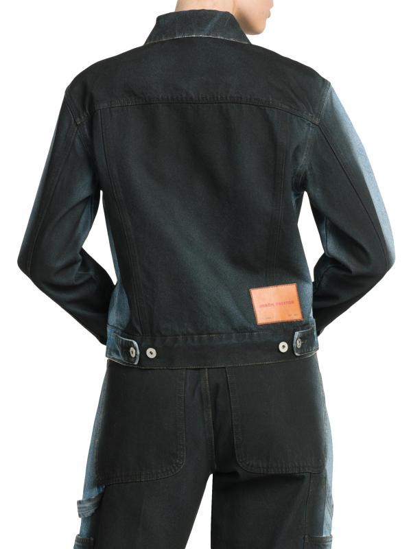 جاكيت Heron Preston مصنوع من قماش الدنيم القطني المتدرج. تتميز هذه القطعة الخالدة بياقة مدببة وأجزاء صلبة فضية اللون وجيبين مرقعين على الصدر.