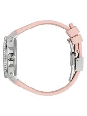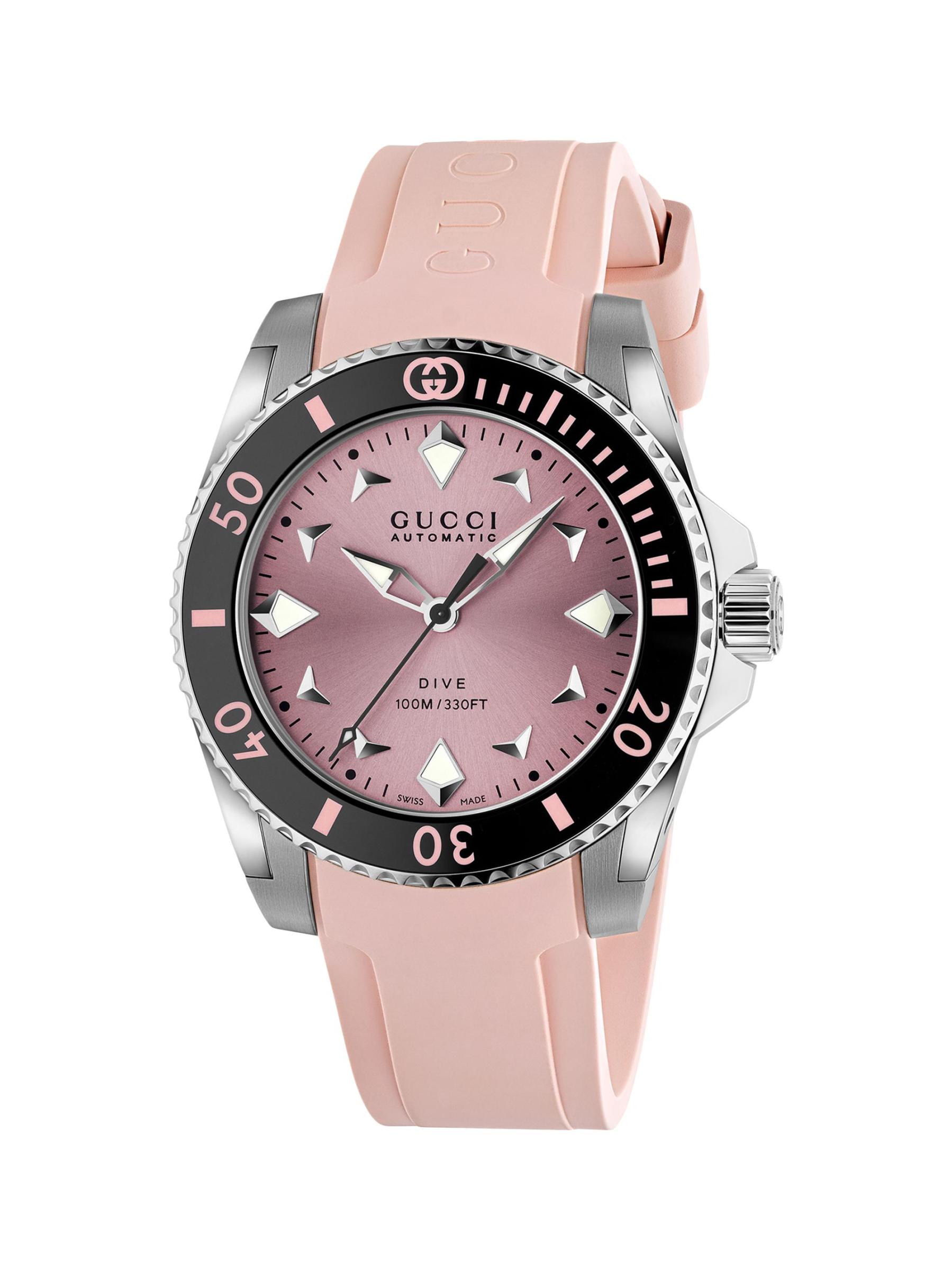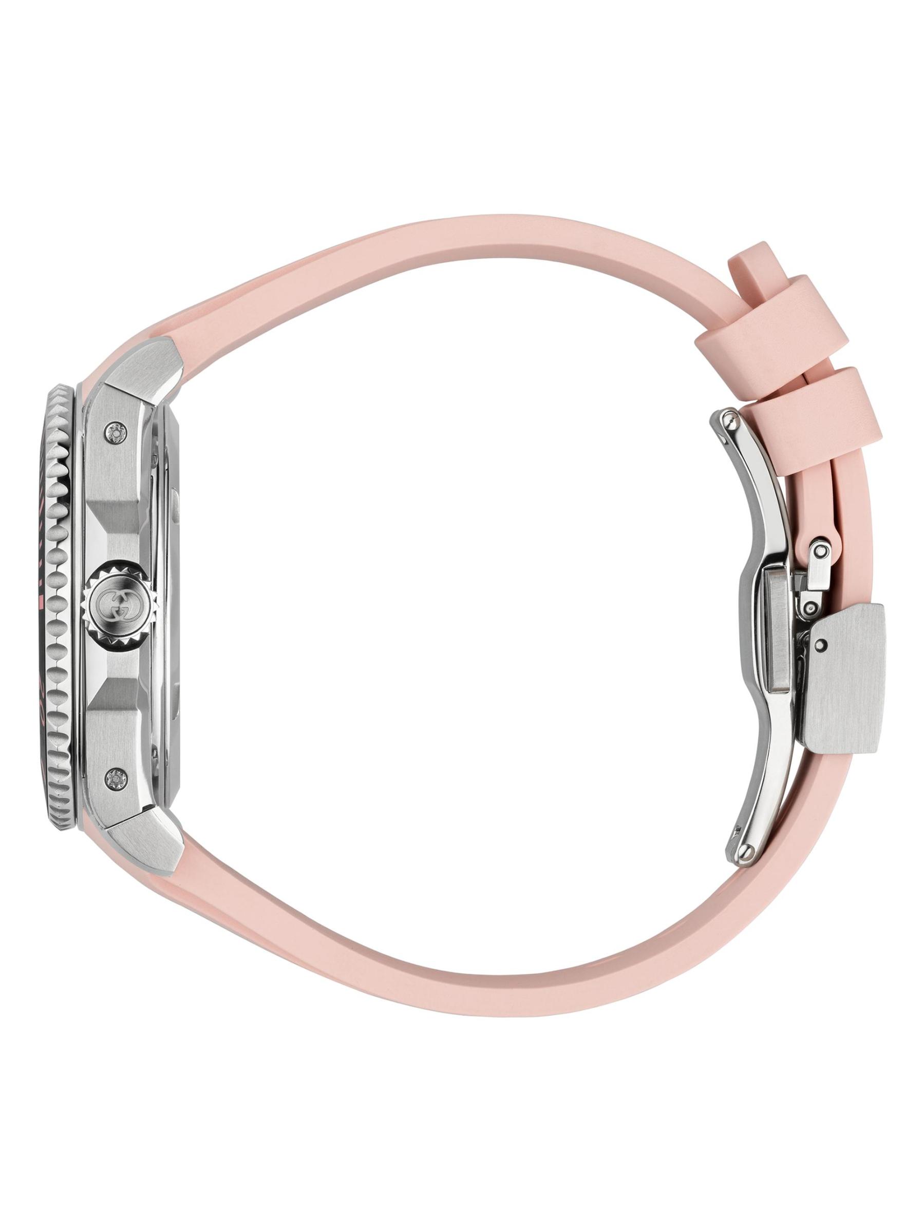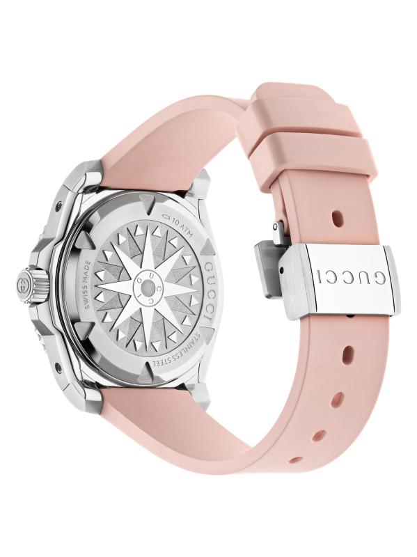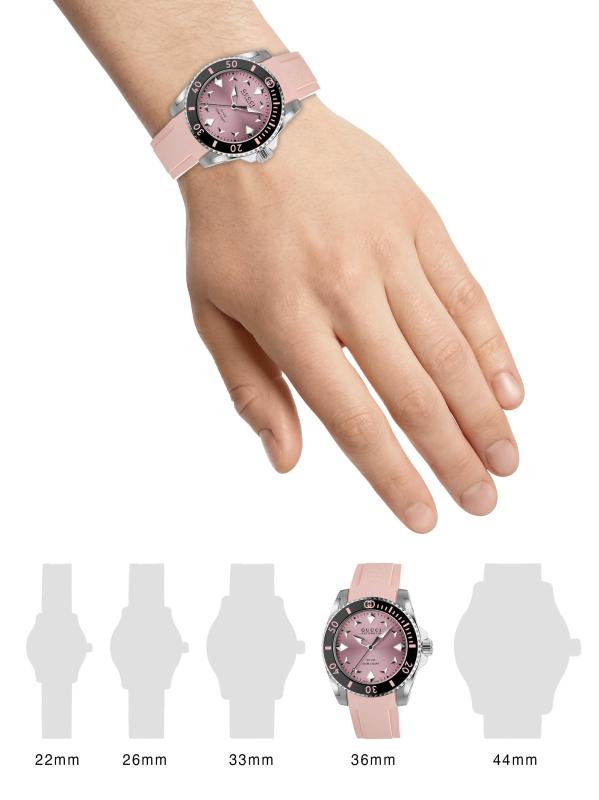 من مجموعة غوتشي للغوص. تتميّز ساعة غوتشي هذه، المُزوّدة بحزام مطاطي منقوش عليه الشعار، بإطار دائري من الفولاذ المقاوم للصدأ، ومينا بلون وردي مزين بأشعة الشمس، وإطار من السيراميك الأسود.