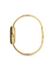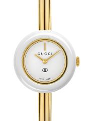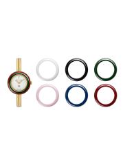 من مجموعة غوتشي بلاي. تتميز هذه الساعة الأنيقة من غوتشي، المصنوعة من الفولاذ المقاوم للصدأ باللون الذهبي، بهيكل دائري ومينا أبيض وسبعة حواف خزفية قابلة للتبديل لتصميم متعدد الاستخدامات.