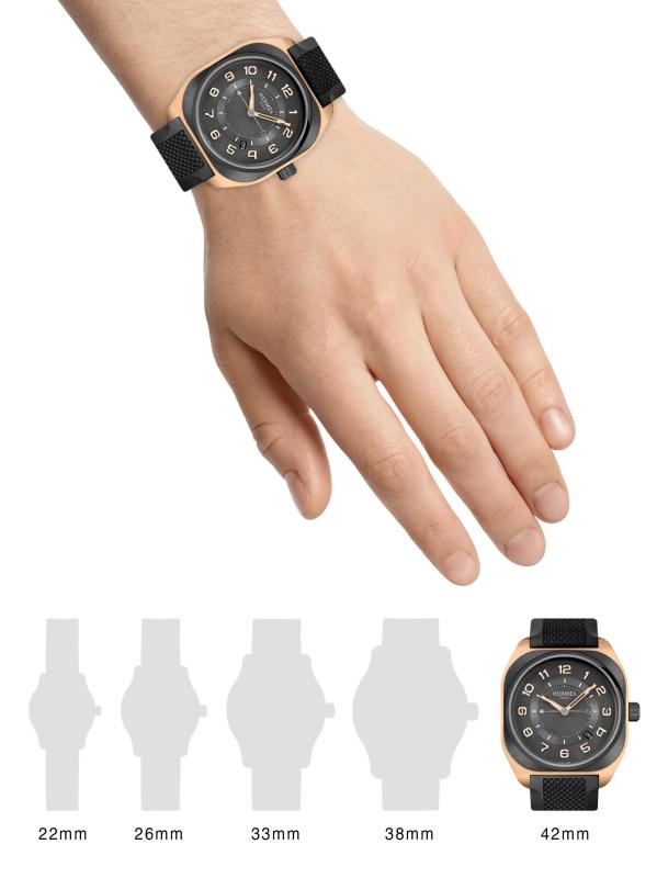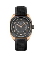 من مجموعة H08. صُممت هذه الساعة من HERMÈS بمظهر عملي، وهي مصنوعة من الذهب الوردي عيار 18 قيراطًا والتيتانيوم. تم تثبيت العلبة ذات الشكل المربع بحزام مطاطي مزخرف.حركة هيرميس للتصنيع H1837 إطار من السيراميك المصقول بالساتان مع حواف مصقولة بالمرآة كريستال ياقوتي مضاد للتوهج تاج أسود من التيتانيوم مينا مطلي بالذهب الأسود وملون باللون الأسود أرقام عربية مطبّقة مطلية بالروديوم مطلية بمادة Super-LumiNova® شاشة عرض التاريخ بين الساعة 4 والساعة 5 علبة من الذهب الوردي عيار 18 قيراطًا حزام مطاطي أسود مشبك قابل للنشر صُنع في سويسرا