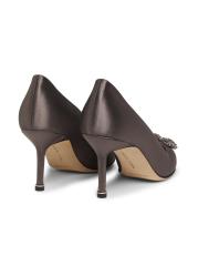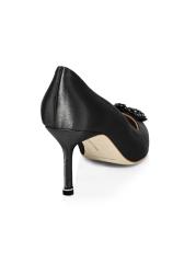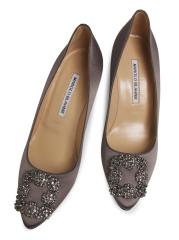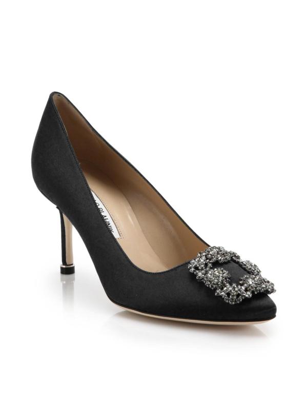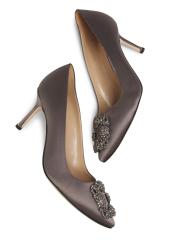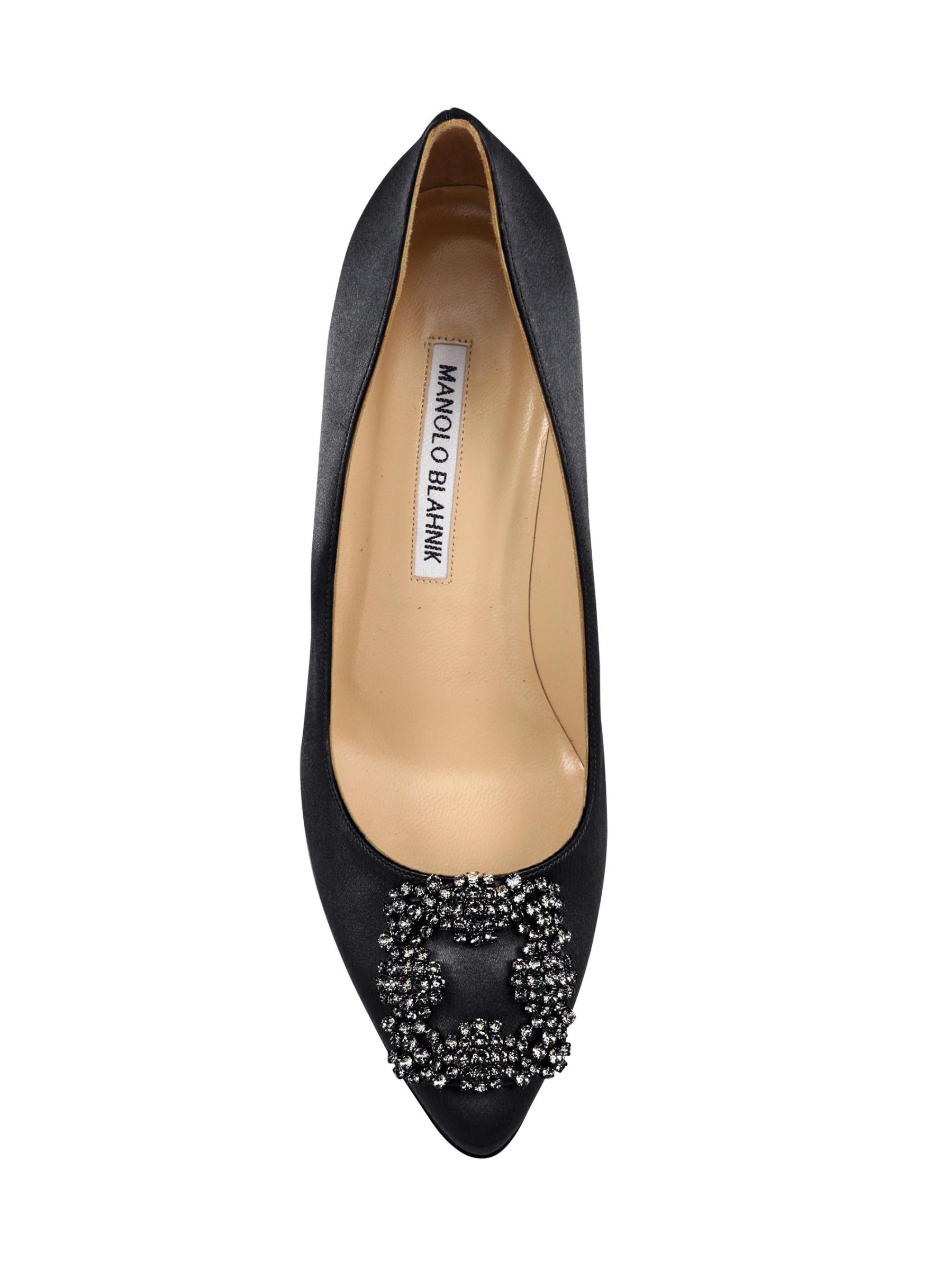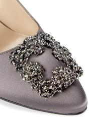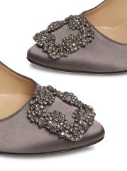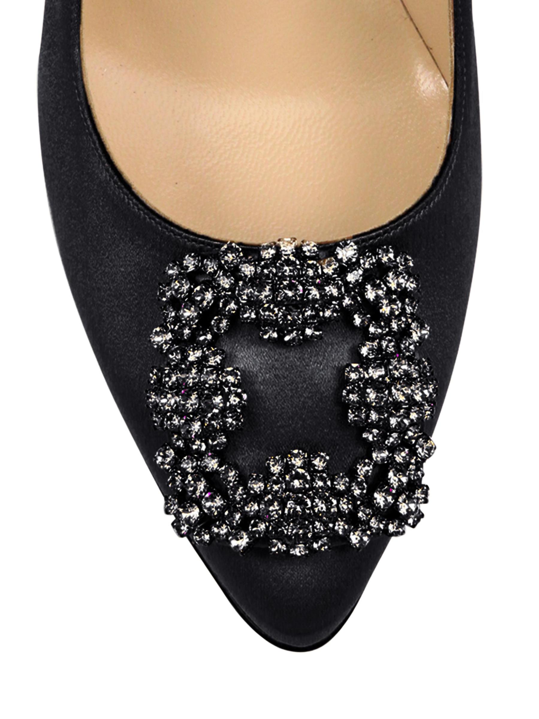 حذاء Hangisi من Manolo Blahnik مصنوع من الساتان اللامع ويتوّج بإبزيم مربع من الكريستال اللامع.