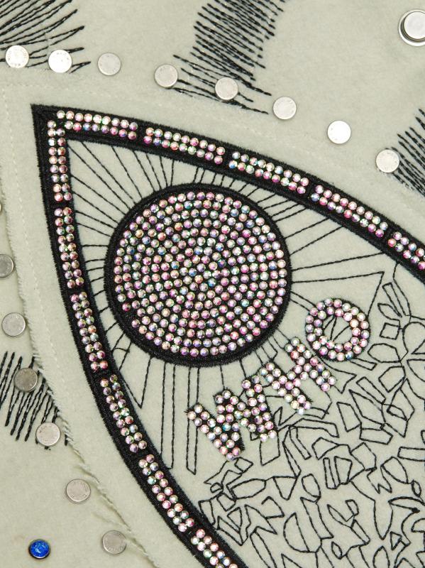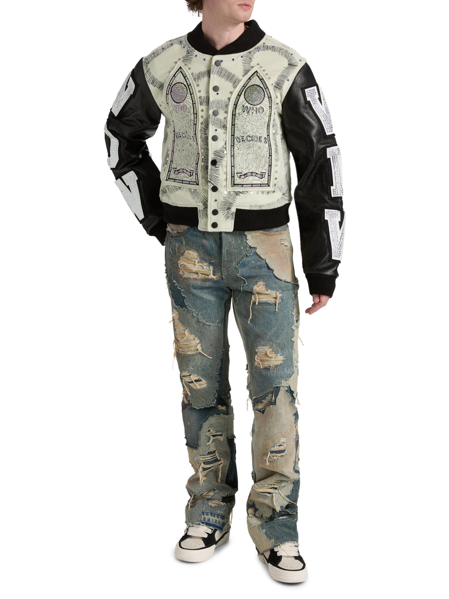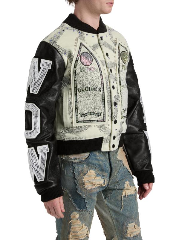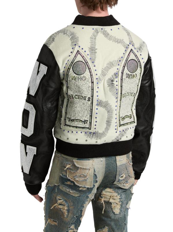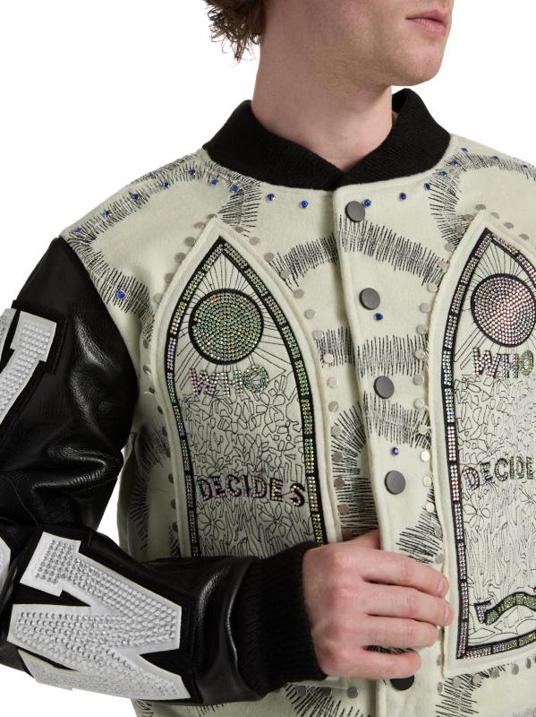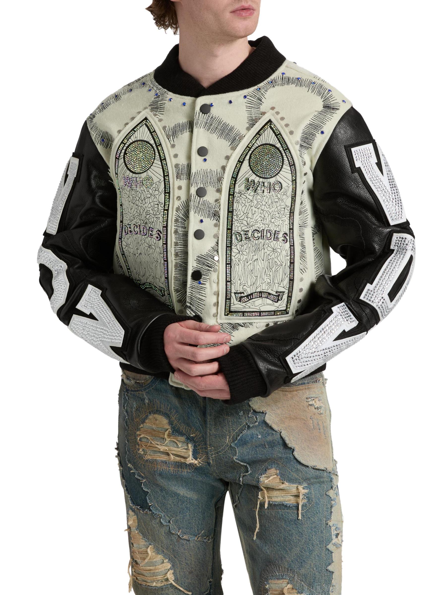 جاكيت هاردوير كاثيدرال فارسيتي هذا من Who Decides War مصنوع من الصوف بأكمام جلدية. يتميز هذا الطراز برقع شعار النافذة المصنوعة من الزجاج الملون والمطرز بالكريستال والحروف المرقعة على الأكمام.
