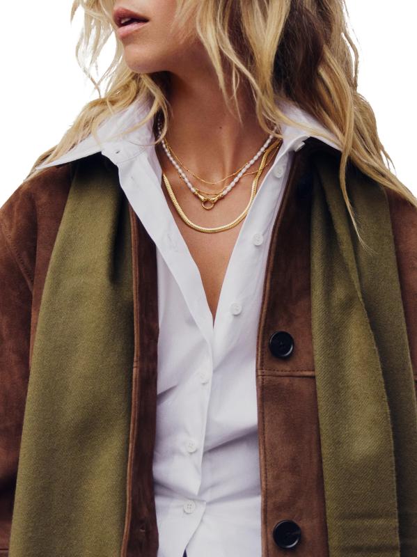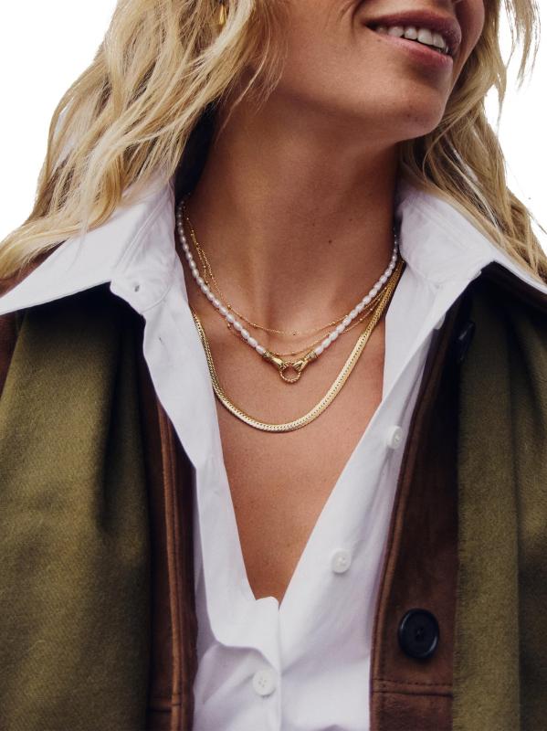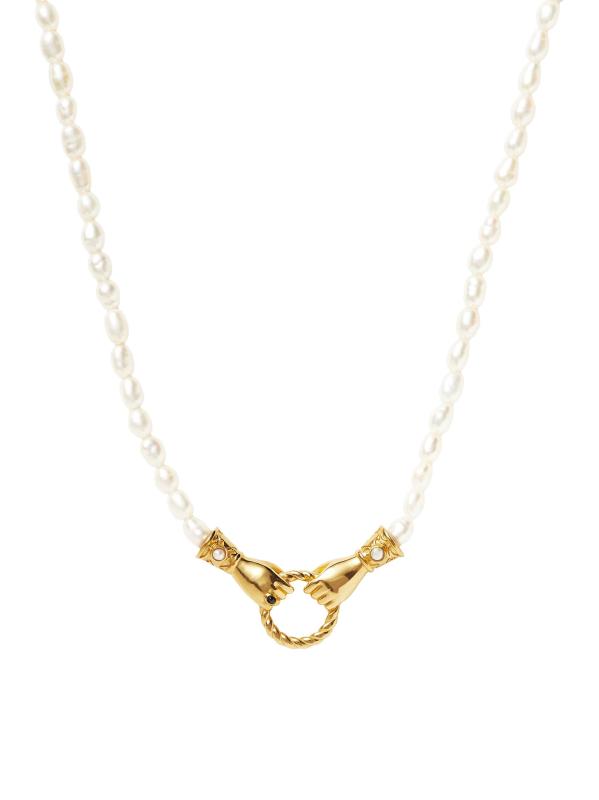 من مجموعة هاريس ريد إكس ميسوما. تتميز هذه القلادة المصنوعة من لؤلؤ المياه العذبة المستزرعة من هاريس ريد من ميسوما بقلادة مكونة من يدين مستوحاة من الطراز الجورجي، تحمل كل منهما خاتمًا ملتوًا مطليًا بالذهب عيار 18 قيراطًا. القطعة المصممة بشكل معقد مزينة بكبوشون لؤلؤ المياه العذبة المستزرع باللون الأبيض وأحجار العقيق الأسود.