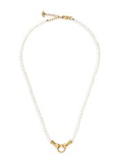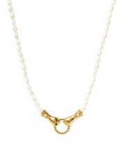 من مجموعة هاريس ريد إكس ميسوما. تتميز هذه القلادة المصنوعة من لؤلؤ المياه العذبة المستزرعة من هاريس ريد من ميسوما بقلادة مكونة من يدين مستوحاة من الطراز الجورجي، تحمل كل منهما خاتمًا ملتوًا مطليًا بالذهب عيار 18 قيراطًا. القطعة المصممة بشكل معقد مزينة بكبوشون لؤلؤ المياه العذبة المستزرع باللون الأبيض وأحجار العقيق الأسود.العقيق الأسود لآلئ بذور المياه العذبة المستزرعة نحاس مطلي بالذهب عيار 18 قيراطًا مشبك لوبستر مستوردة
