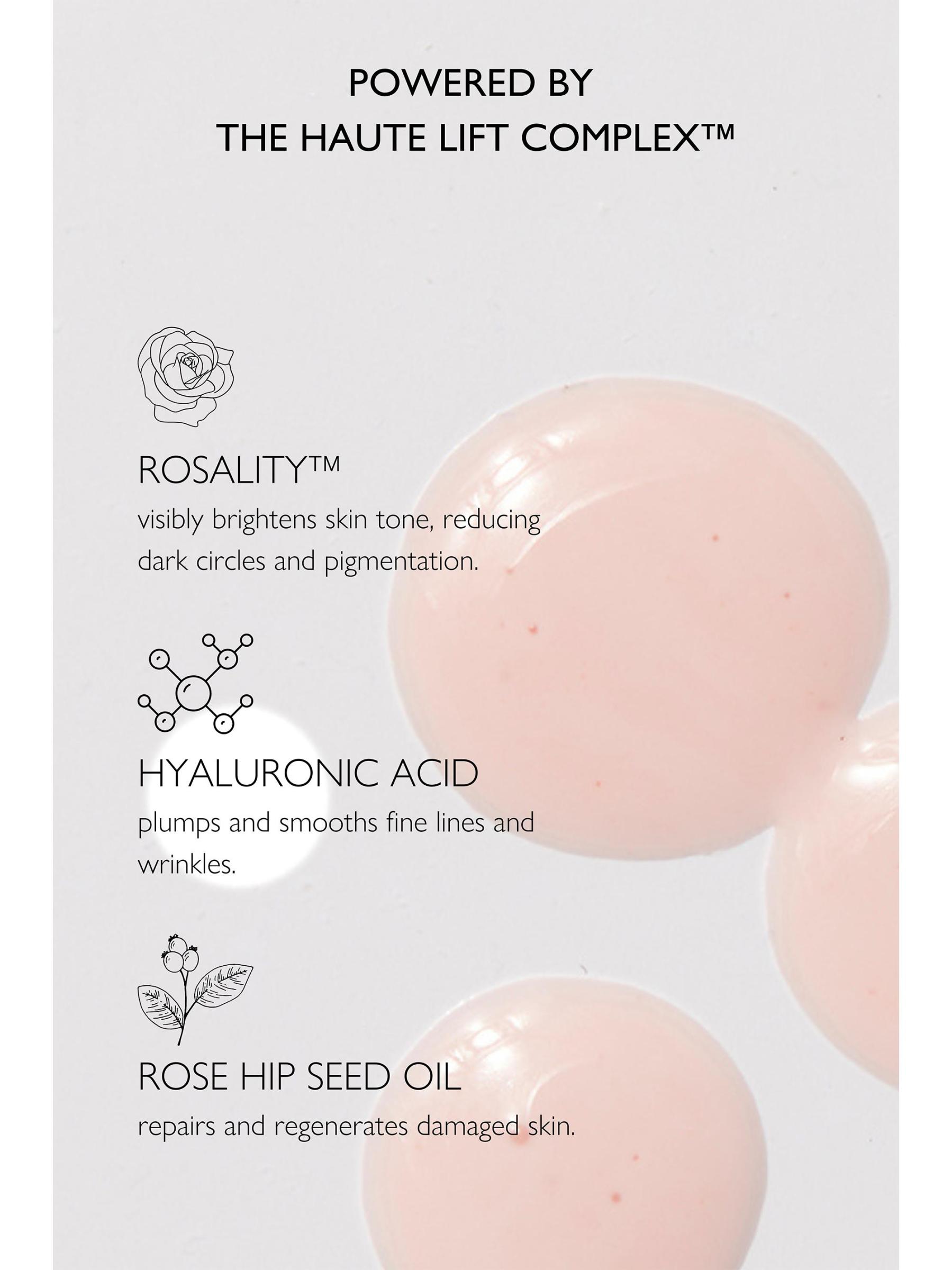 يعمل هذا الكريم على ملء التجاعيد على الفور، وتفتيح البشرة، وترطيبها بعمق لمدة 72 ساعة، ويترك البشرة متوهجة وندية طوال اليوم. يعمل حمض الهيالورونيك والأرجيرلين على تعزيز الكولاجين ومرونة الجلد بينما يعمل زيت الورد الدمشقي وزيت بذور ثمر الورد على تحسين التصبغ وتغذية البشرة. يعمل مستخلص إديلويس على شد الرقبة وخط الفك وشدها وشدها. يتميز هذا المنتج بقوامه اللامع الخفيف والغني برائحة الورد الإنجليزي للحصول على بشرة مهدئة وملطفة.