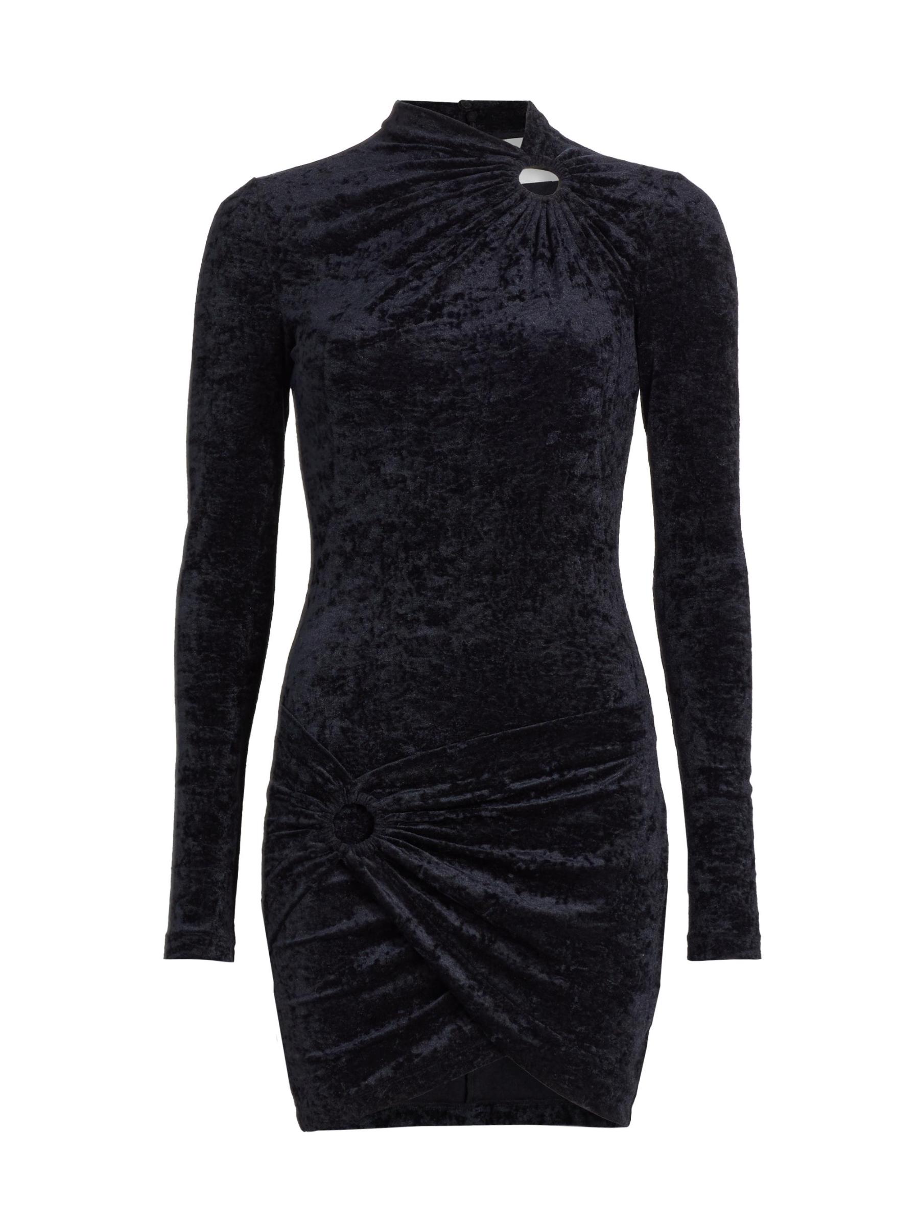 يتميز فستان هافانا الصغير من إيزابيل مارانت إيتويل، الذي تم تشطيبه بالمخمل المسحوق، بتصميم ملتوي مع لمسة ملفوفة وحلقات على شكل حرف O.