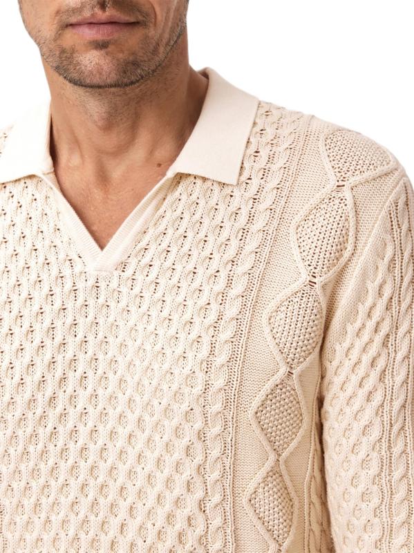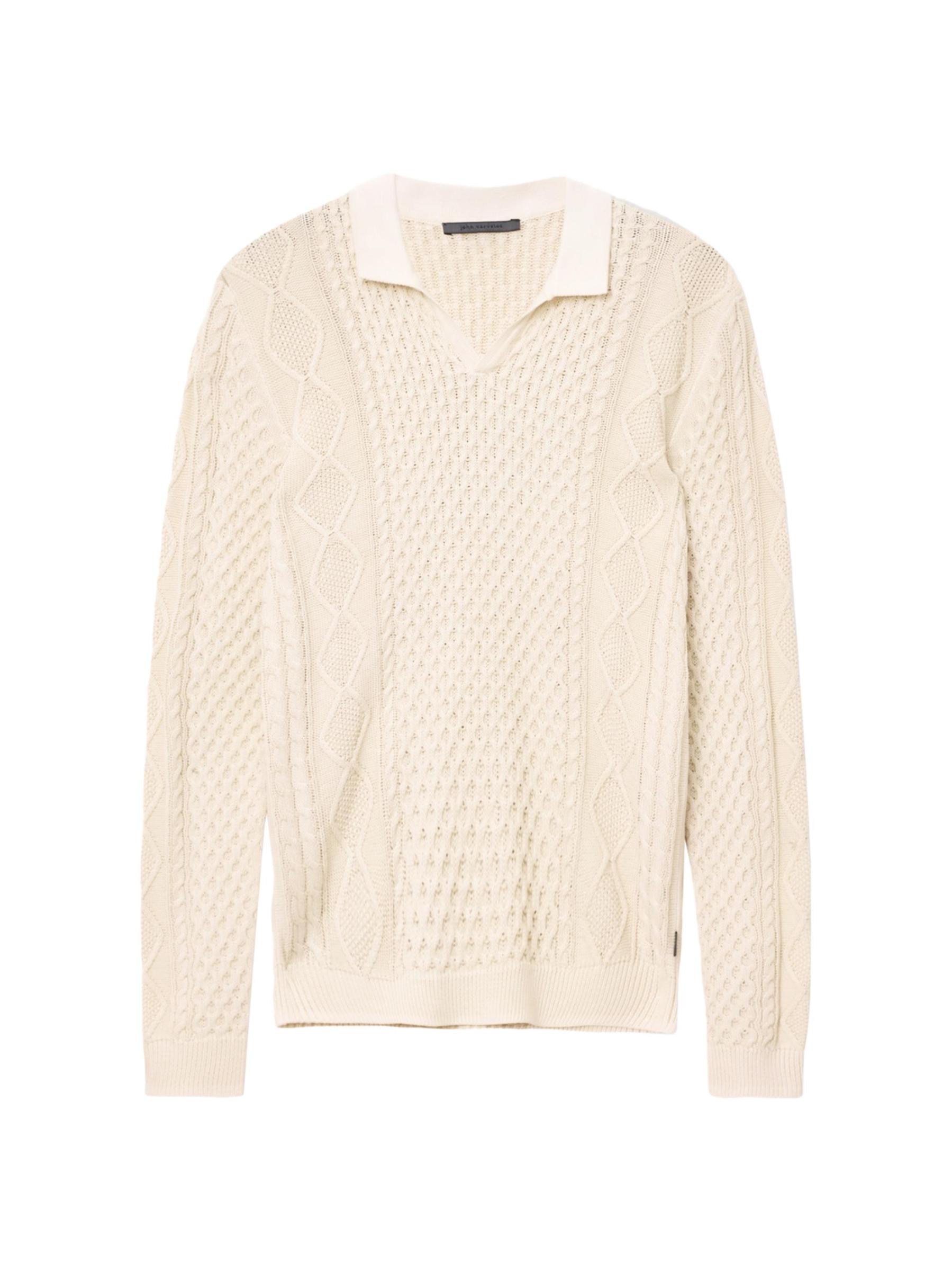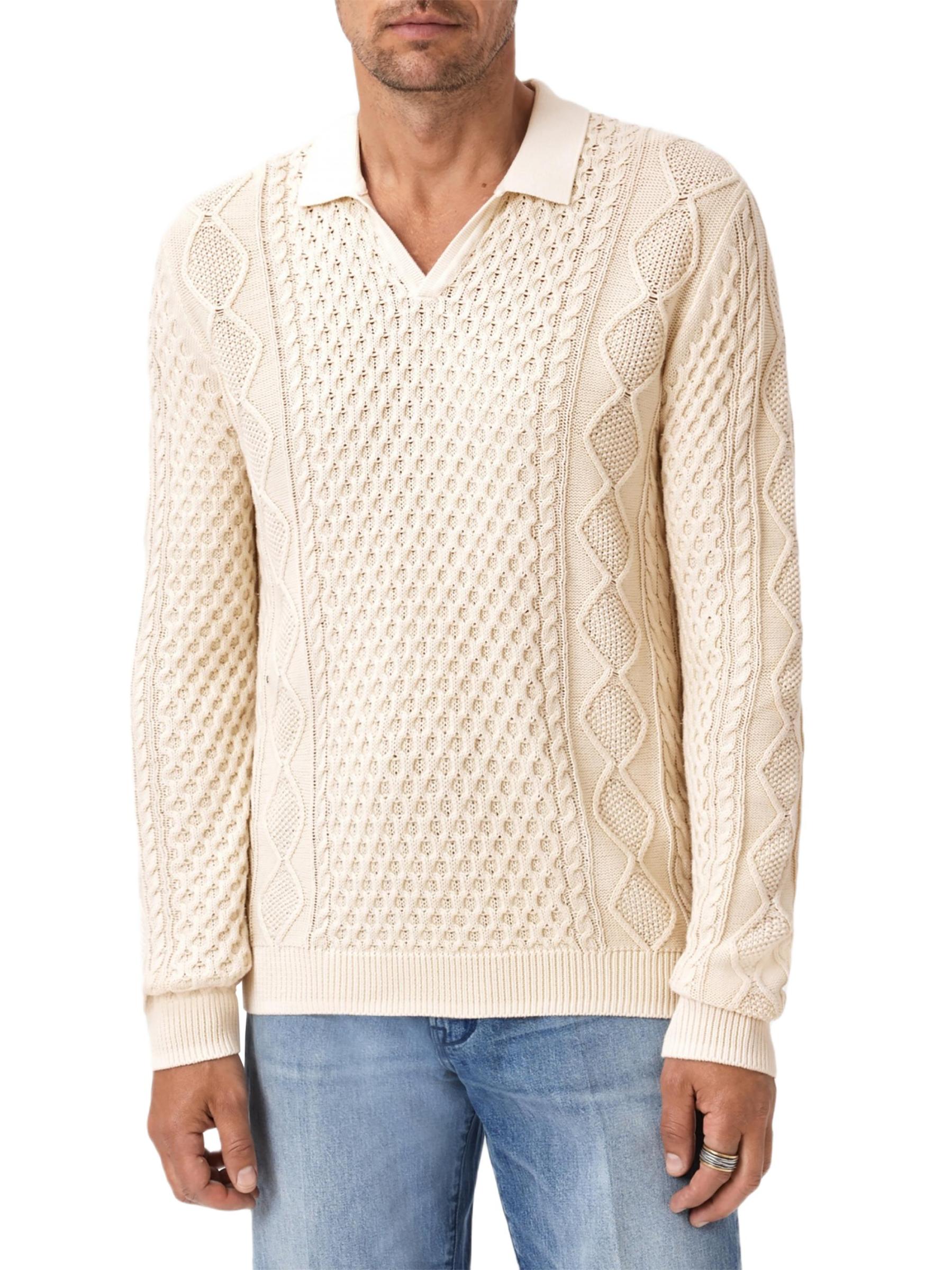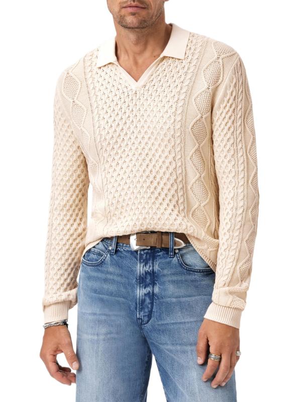 تتميز سترة بولو Haynes هذه من John Varvatos بمزيج فريد من خيوط العسل والماس والكابلات. هذه القطعة ذات الأكمام الطويلة مصنوعة من القطن المرسيري ومصممة بياقة جوني.