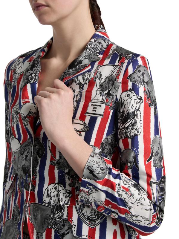 صُنع هذا المعطف الرياضي من Thom Browne من نسيج الحرير بطبعة هيكتور بالكامل على خطوط ثلاثية الألوان، ويتميز بتصميم مُصمم خصيصًا مع فتحات ذراع عالية وأكمام بطول السوار. تُكمل الجيوب الجانبية المظهر.طية صدر مشقوقة أكمام بطول السوار جيب على الصدر جيوب جانبية قابلة للطي إغلاق بزرين حرير بنسبة 100% البطانة: 100% حرير تنظيف جاف صُنع في إيطاليا
