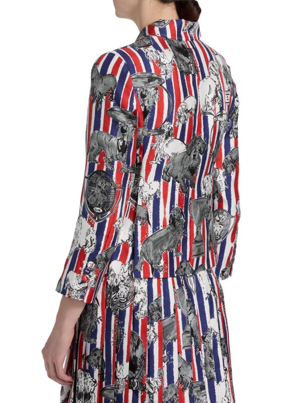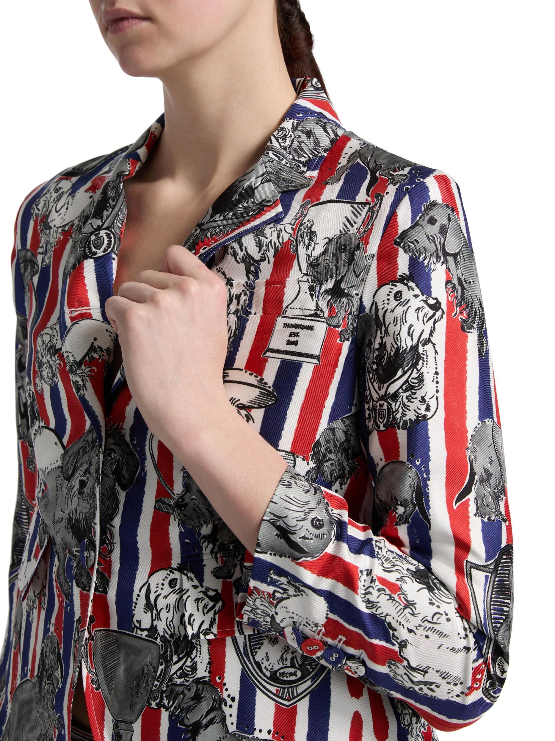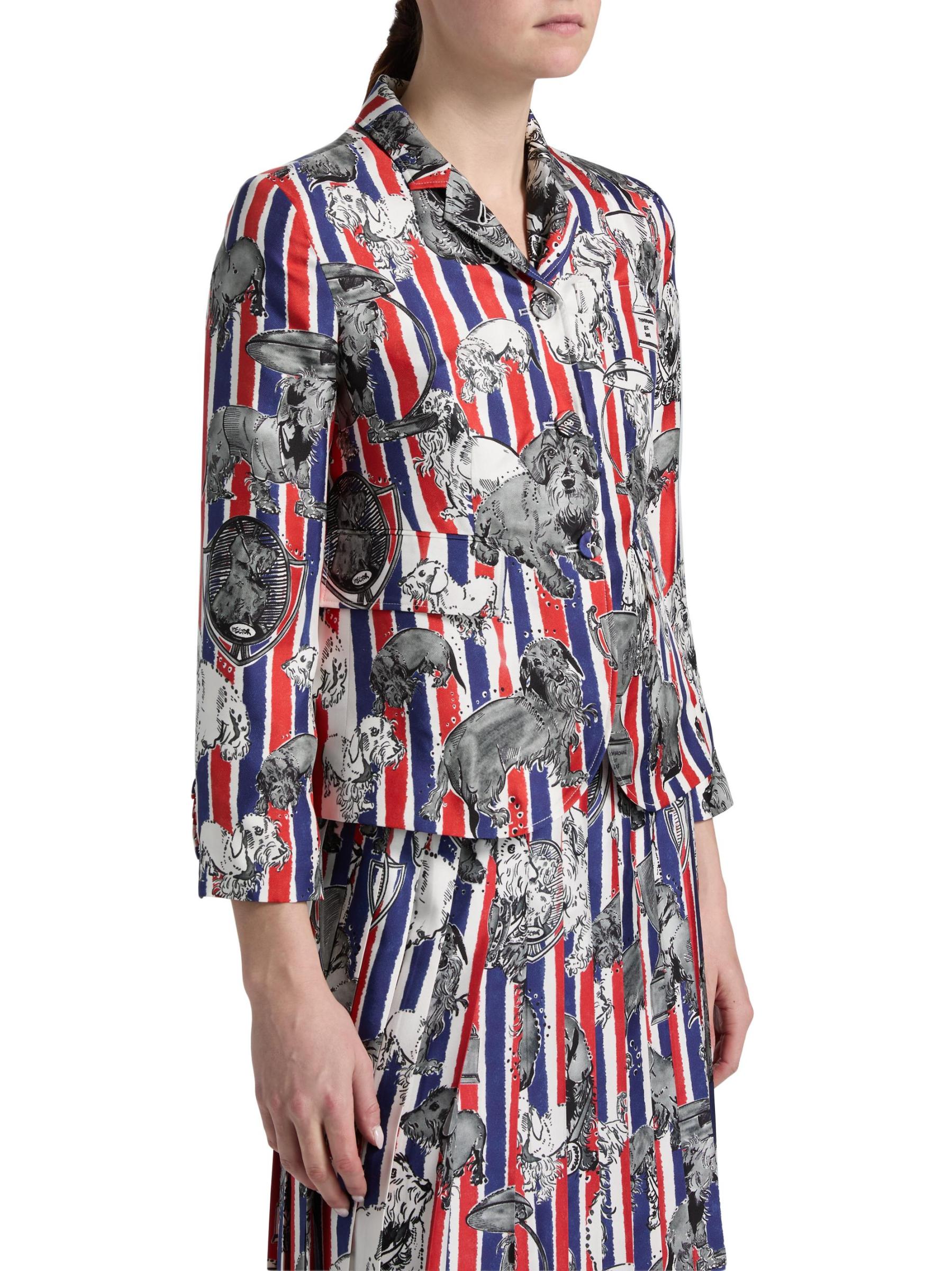 صُنع هذا المعطف الرياضي من Thom Browne من نسيج الحرير بطبعة هيكتور بالكامل على خطوط ثلاثية الألوان، ويتميز بتصميم مُصمم خصيصًا مع فتحات ذراع عالية وأكمام بطول السوار. تُكمل الجيوب الجانبية المظهر.