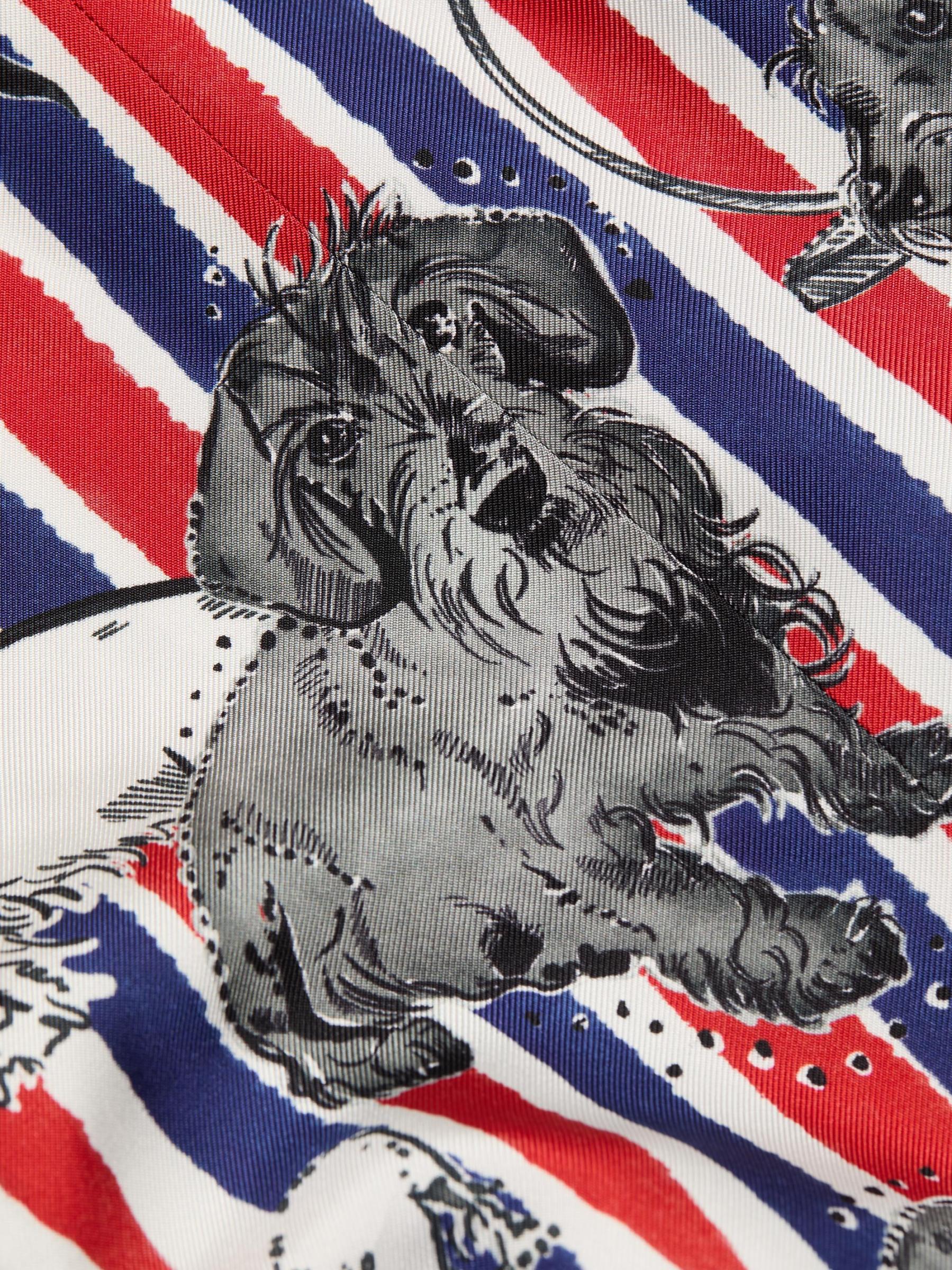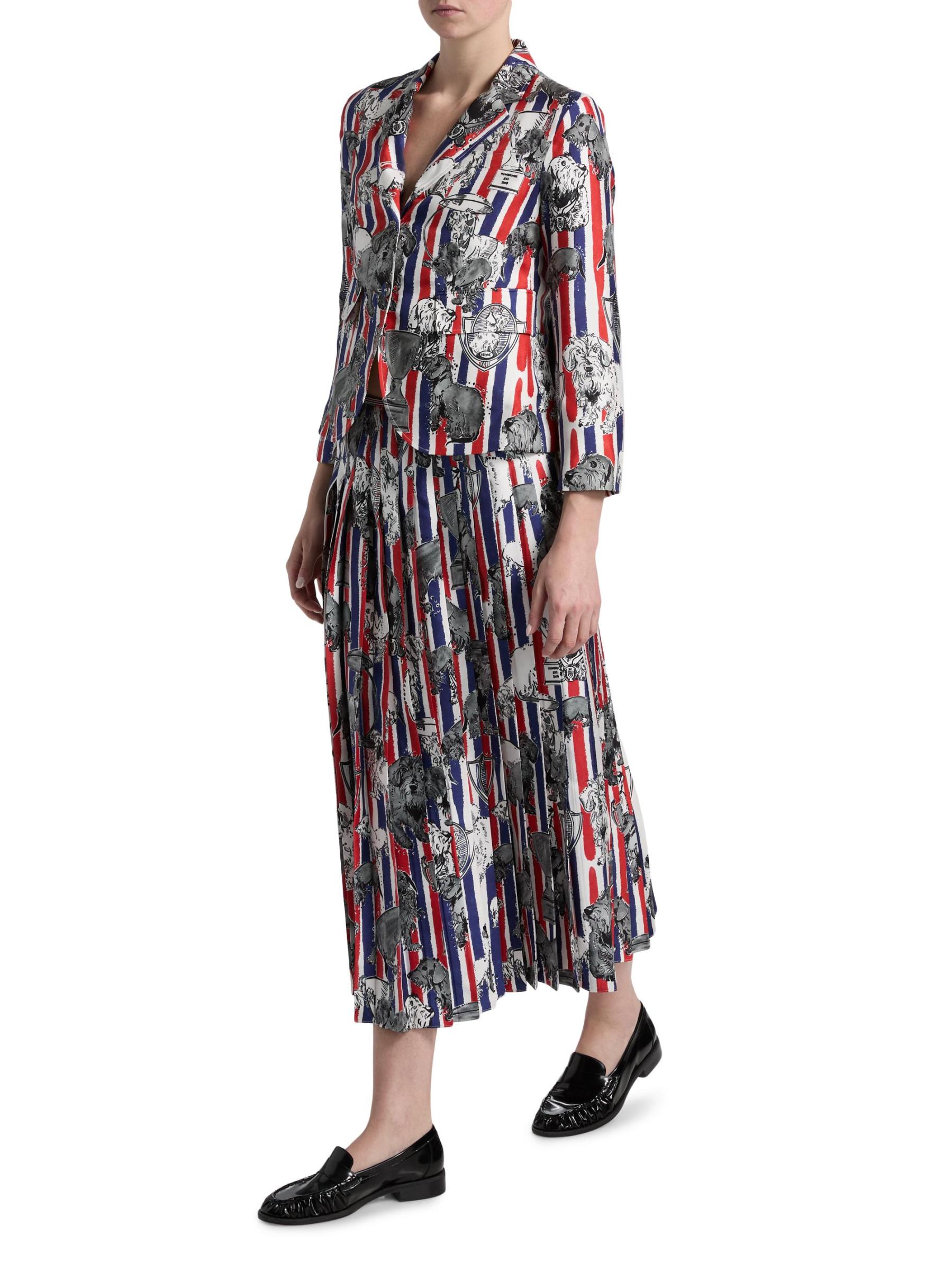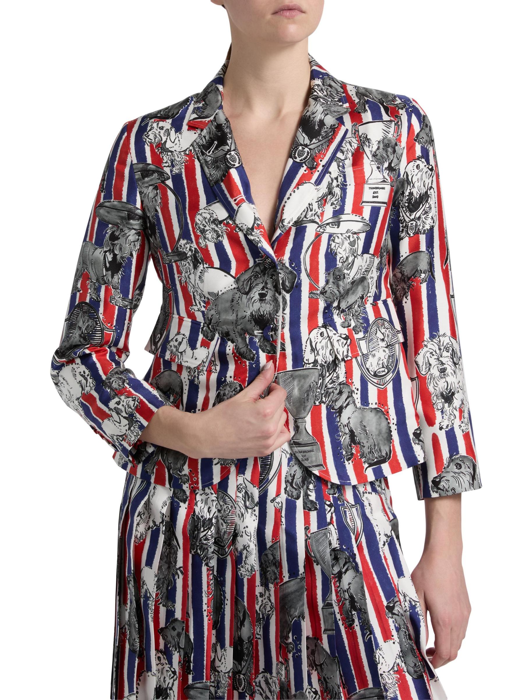صُنع هذا المعطف الرياضي من Thom Browne من نسيج الحرير بطبعة هيكتور بالكامل على خطوط ثلاثية الألوان، ويتميز بتصميم مُصمم خصيصًا مع فتحات ذراع عالية وأكمام بطول السوار. تُكمل الجيوب الجانبية المظهر.