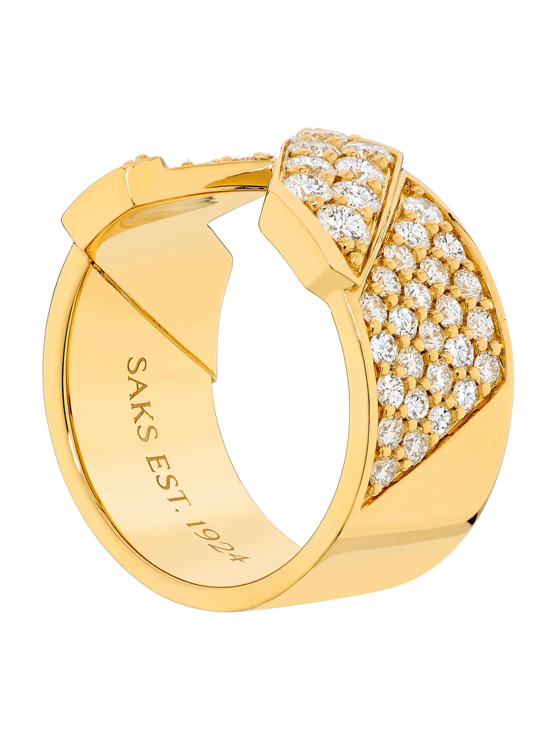 تعكس مجموعة Helix من SAKS EST. 1924 الفن النحتي لواجهة مبنى الجادة الخامسة الأيقونية في ساكس؛ حيث صُنعت أقطارها الرخامية وأشكالها الحلزونية من معادن ثمينة، مع تصميمات مختارة مضاءة بأحجار الماس المرصّعة يدويًا والتي ترسم كل منحنى. نشيد بالحركة الدائمة لمدينة نيويورك، كل قطعة مصممة لتتحرك مع الجسم. تضفي أحجار الماس المرصوفة بريقًا متألقًا على هذا الخاتم المصنوع من الذهب عيار 18 قيراطًا