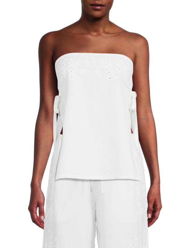 من مجموعة هالو صن شاين. بلوزة سيباستيان بدون حمالات من Ciao Lucia مصنوعة من القطن ومزينة بزهور مطرزة يدويًا وشقوق جانبية.بدون حمالات بدون أكمام تسحب قطن بنسبة 100% تنظيف جاف مستوردة