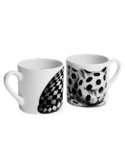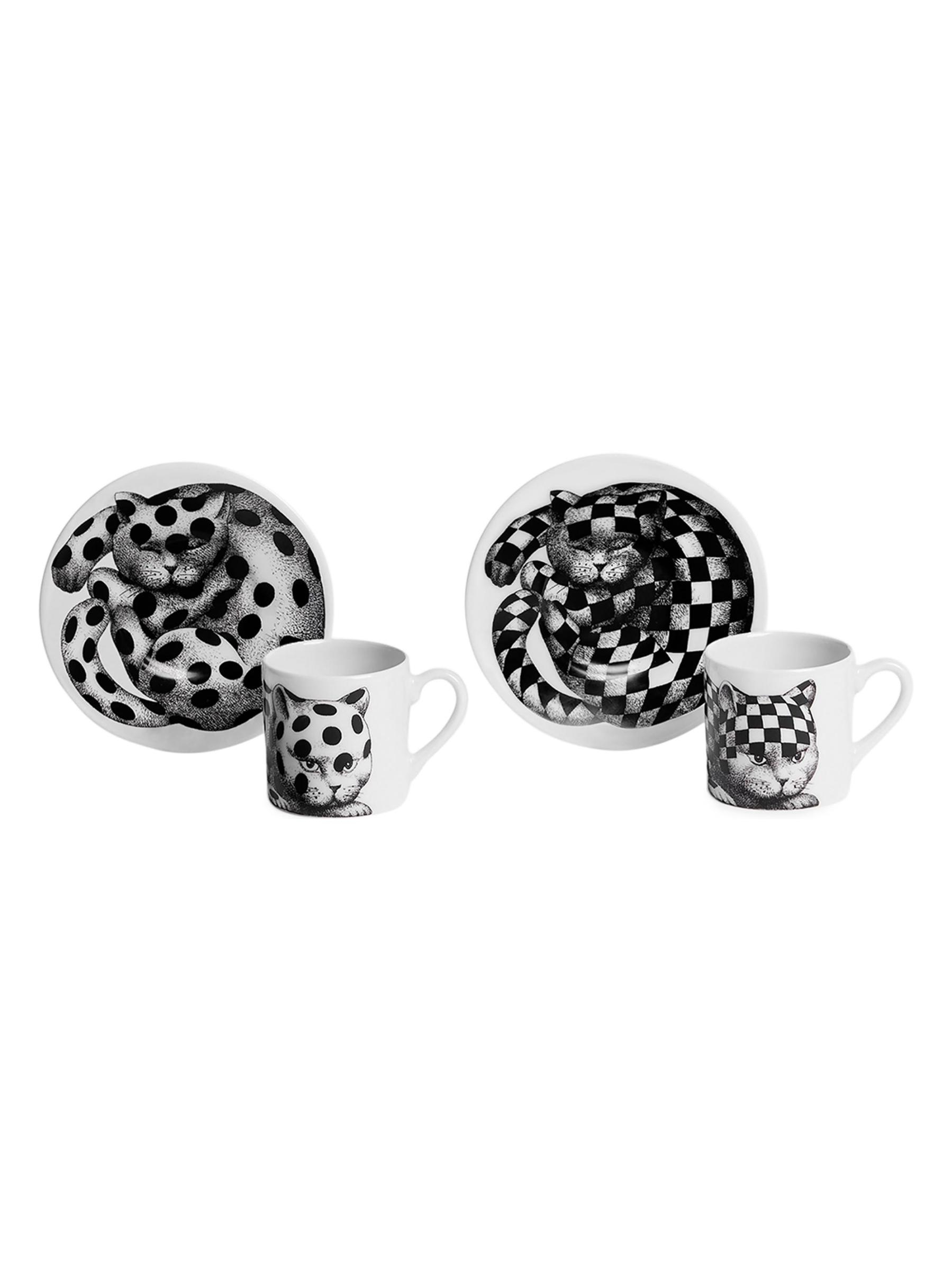 تعد مجموعة High Fidelity من Fornasetti جزءًا من مجموعة تصميمات من الخمسينيات، تعرض القطط، وهي واحدة من الحيوانات المفضلة لدى المؤسس بييرو فورناسيتي. صُنعت مجموعة أكواب وصحون القهوة المكونة من قطعتين في إيطاليا، وهي مصنوعة يدويًا من البورسلين.