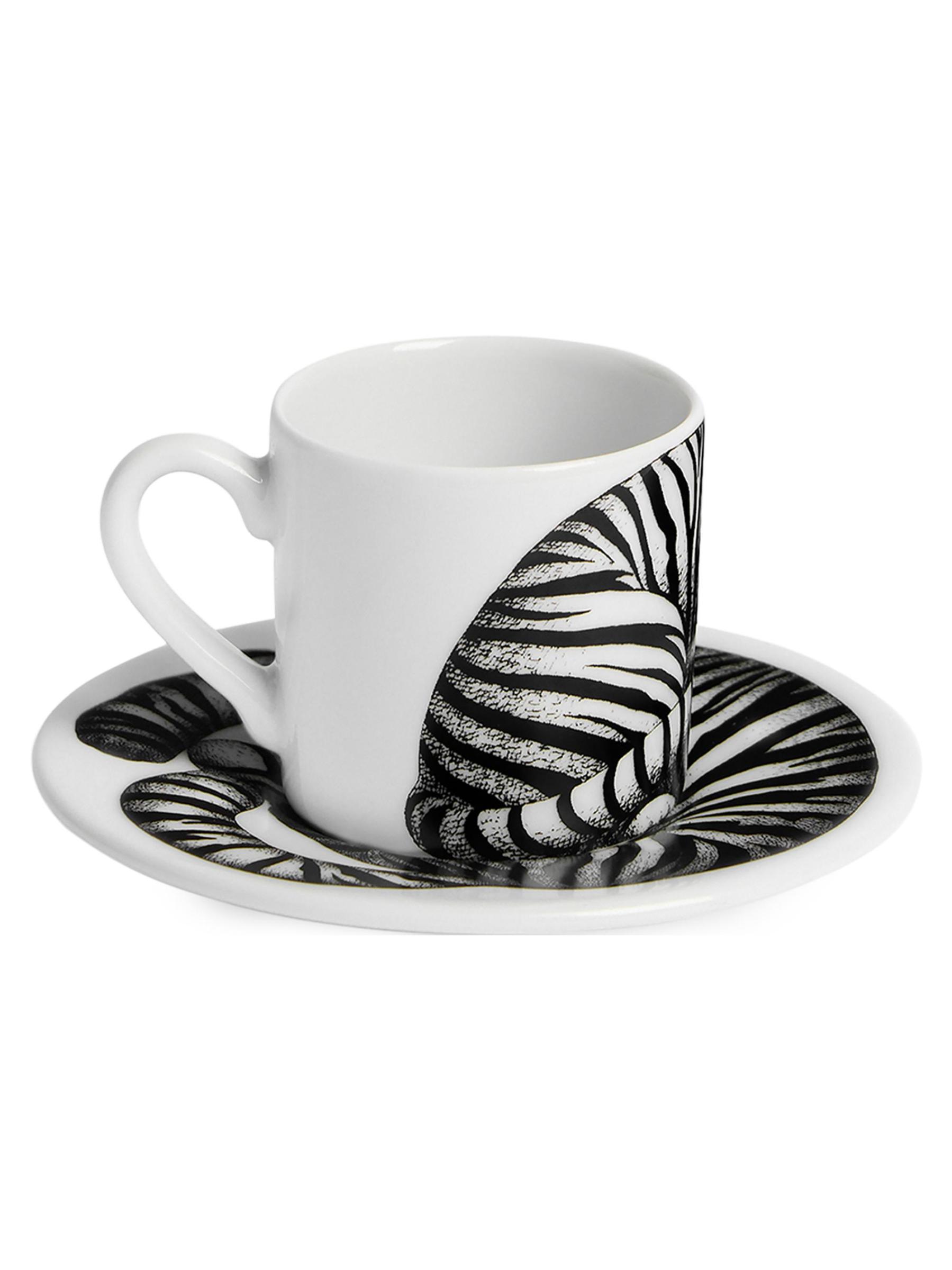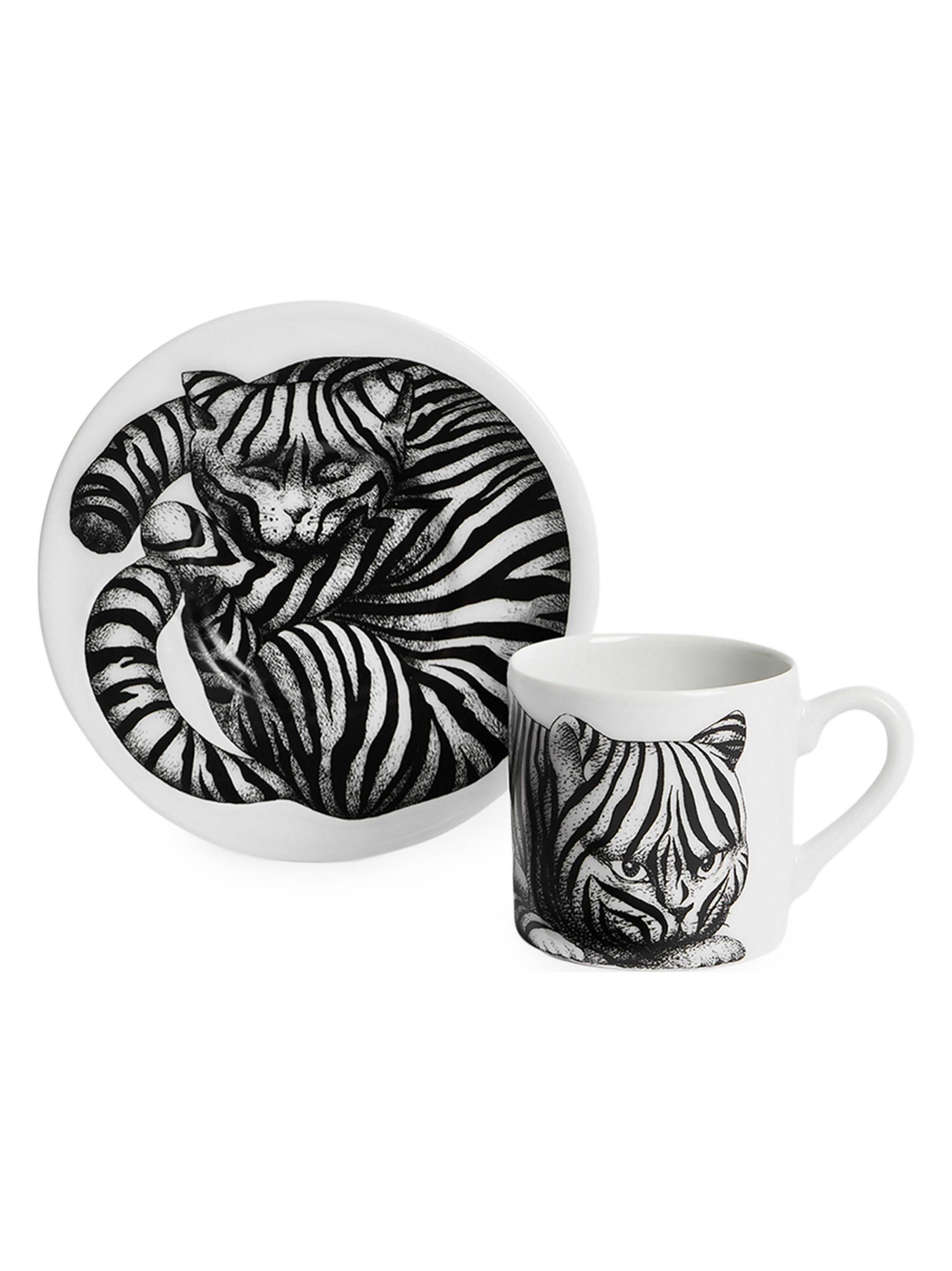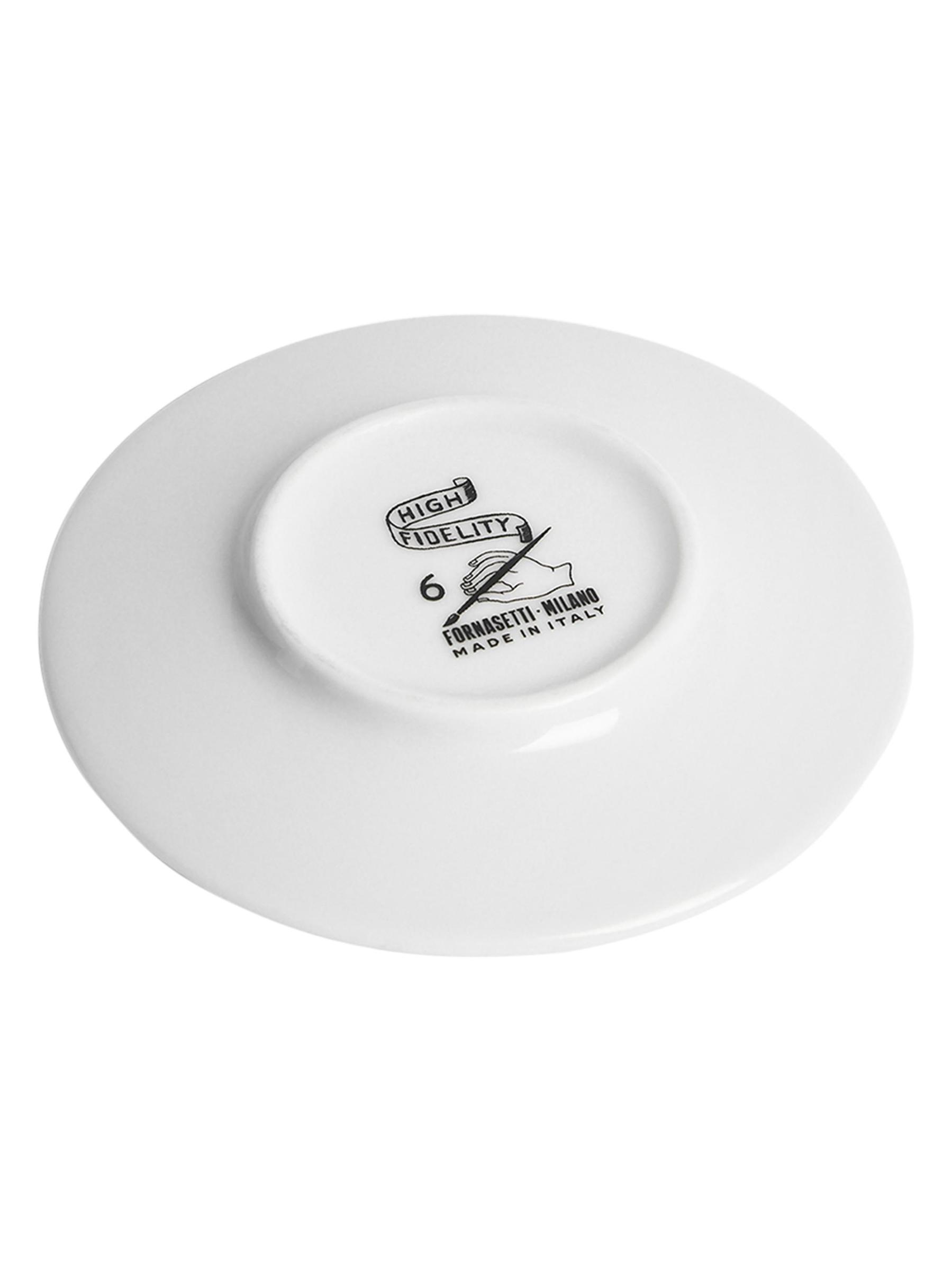 تعد مجموعة High Fidelity من Fornasetti جزءًا من مجموعة تصميمات من الخمسينيات، تعرض القطط، وهي واحدة من الحيوانات المفضلة لدى المؤسس بييرو فورناسيتي. مجموعة أكواب وصحون القهوة هذه المصنوعة في إيطاليا مصنوعة يدويًا من البورسلين.