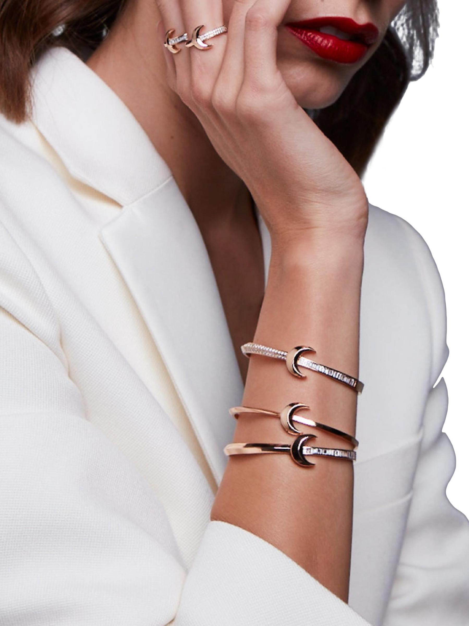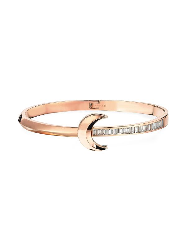من مجموعة هاي مون. صُنع هذا السوار المصقول على شكل هلال من Mevaris من الذهب الوردي عيار 18 قيراطًا، ويتميز بأحجار الماس المصنوعة من الرغيف الفرنسي بأناقة على جانب واحد.