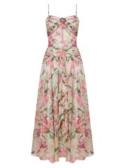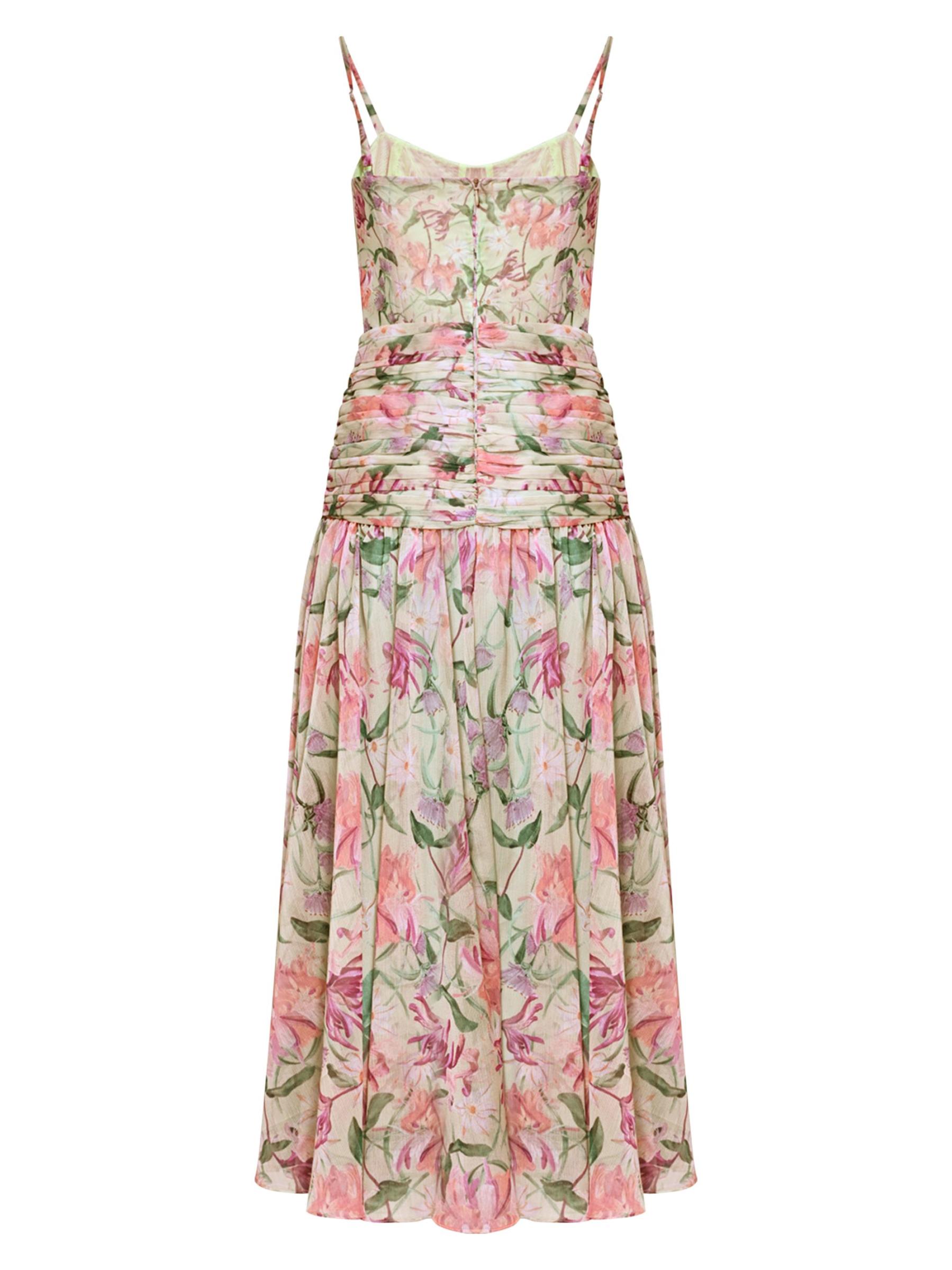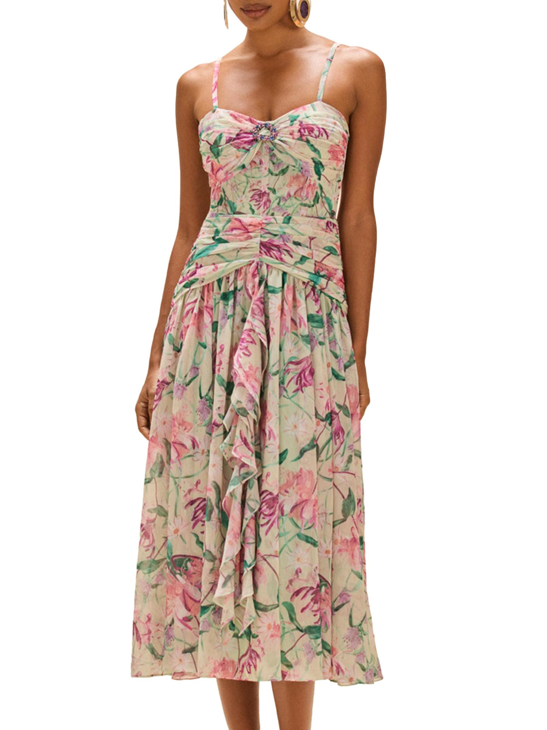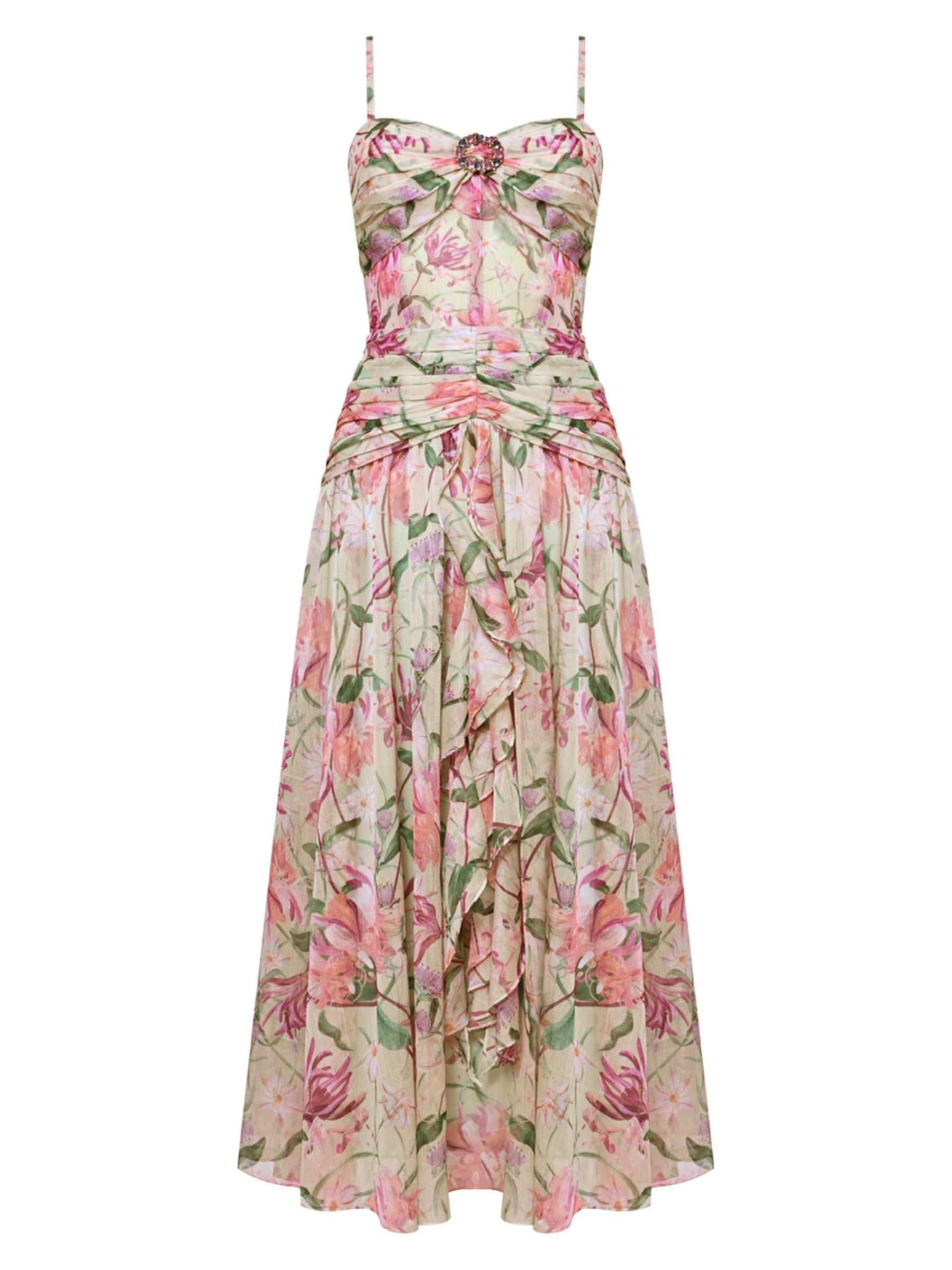 يُظهر فستان Honey Flower المتوسط من PatBo، المصنوع من الشيفون الخفيف، زخارف نباتية ساحرة. تتميّز هذه القطعة، المُجمّعة عند الصدر والخصر المنخفض، بتفاصيل بروش، وأحزمة قابلة للتعديل، وياقة على شكل قلب.