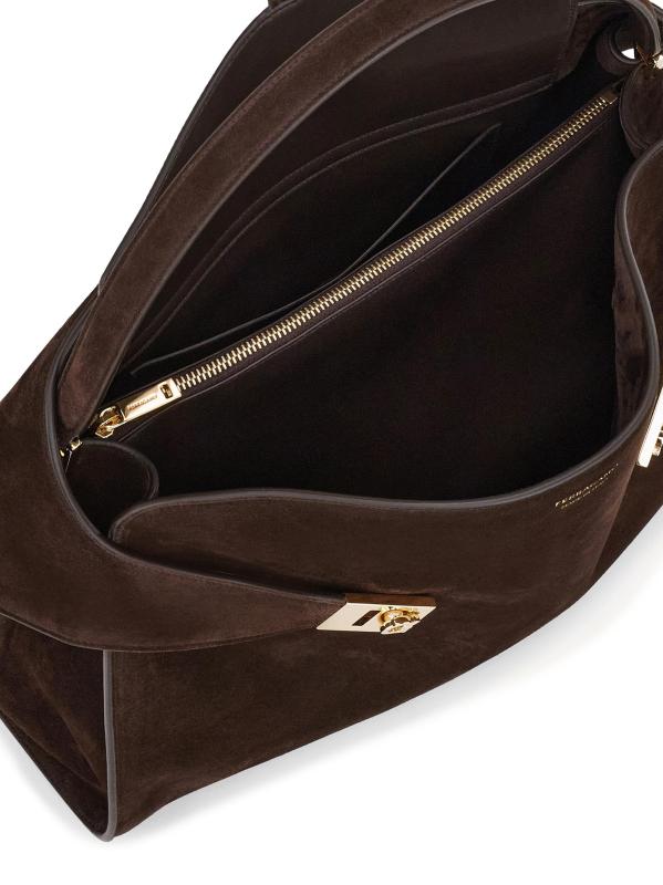 صُنعت حقيبة الكتف Hug من FERRAGAMO في إيطاليا من الجلد المدبوغ ومزينة بأجزاء صلبة ذهبية اللون.حزام يلتف حول الجسم قابل للإزالة حزام للكتف الجزء الداخلي: جيب واحد بسحّاب جلد سويدي بطانة جلدية أقدام معدنية صُنع في إيطاليا