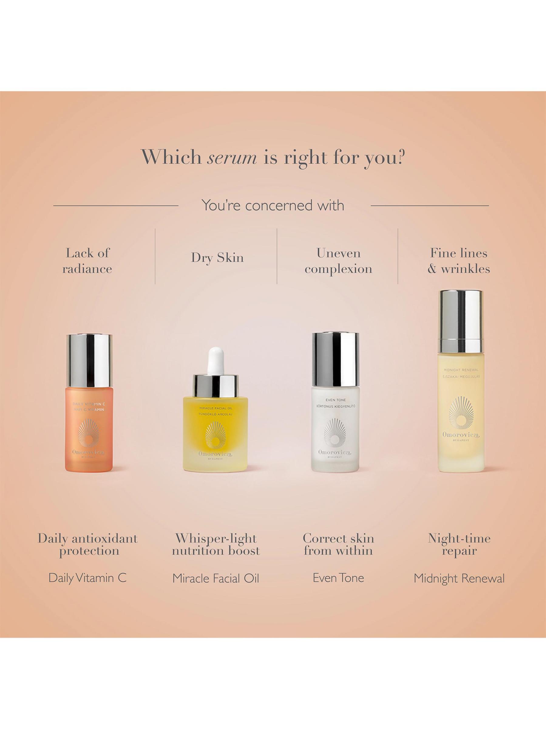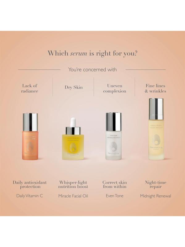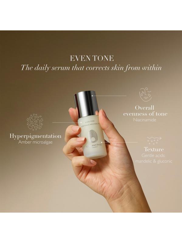 من مجموعة الهيدرومينيرال. يعمل مصل Even Tone اليومي على إعادة ضبط البشرة من الداخل. مناسب لجميع ألوان البشرة، فهو يصحح التصبغ غير المتكافئ، بما في ذلك البقع الداكنة وأضرار أشعة الشمس وعلامات ما بعد الشوائب، مع الكشف عن توهج فوري. تستهدف الطحالب الدقيقة الكهرمانية فرط التصبغ بينما يعمل حمض المندليك والنياسيناميد على تنعيم البشرة وإعادة تسطيحها وإشراقها. للحصول على أفضل النتائج، ضعيه ليلًا أو نهارًا على بشرة نظيفة، ثم مرطب. 1 أونصة، صُنع في سويسرا.