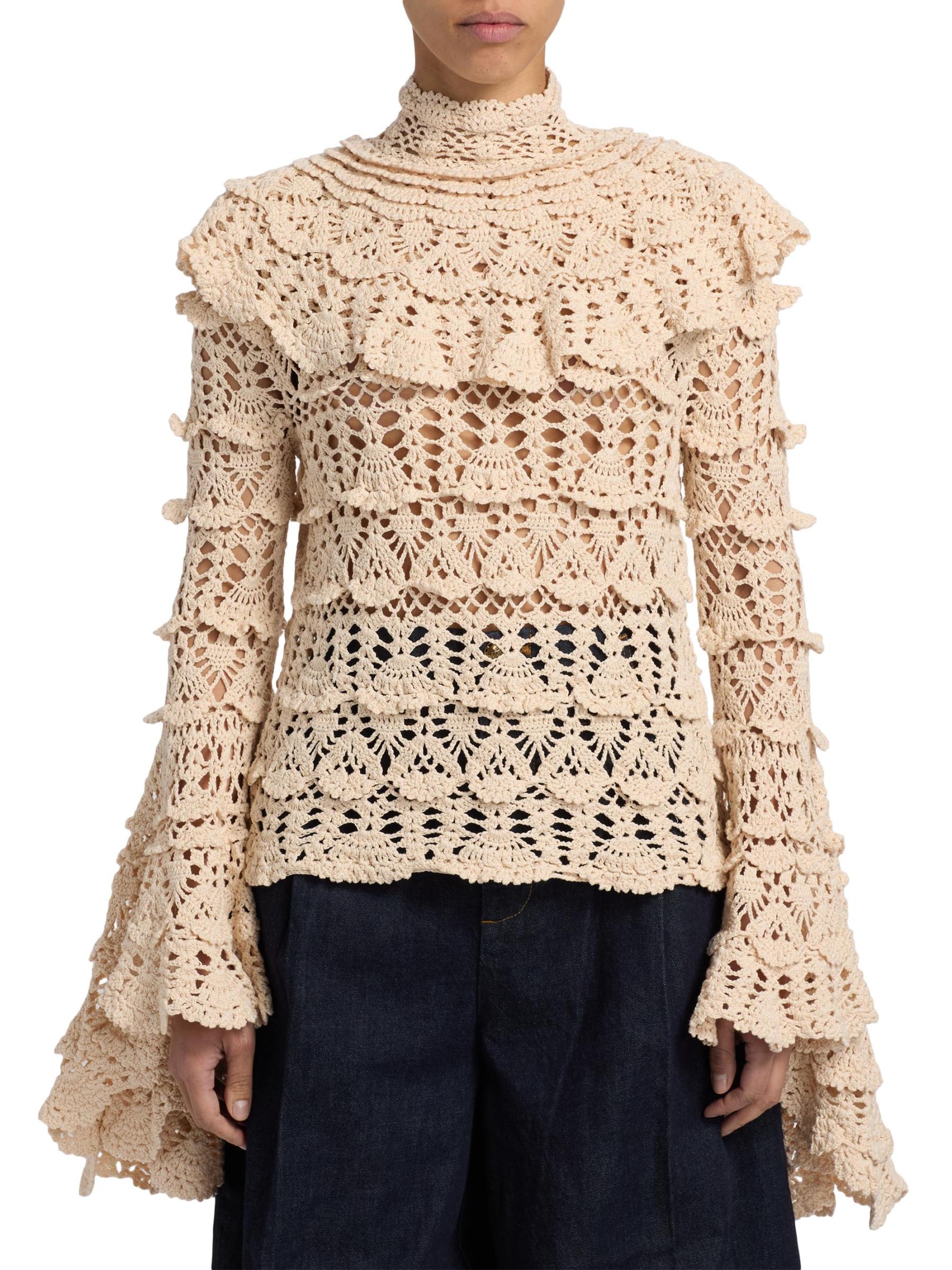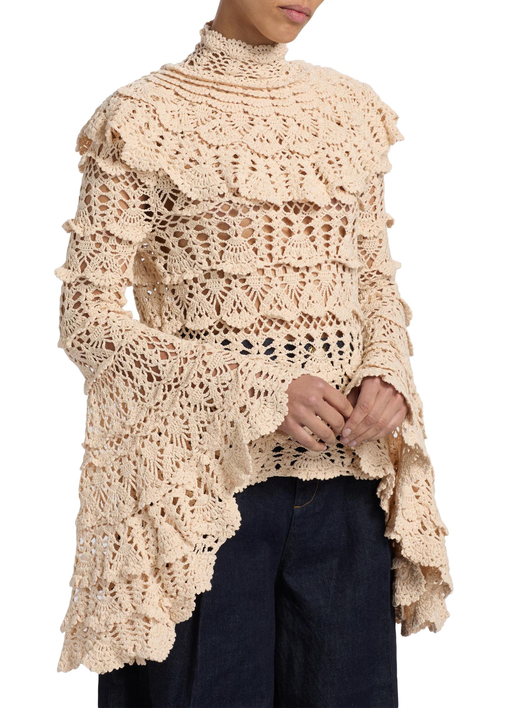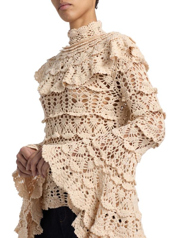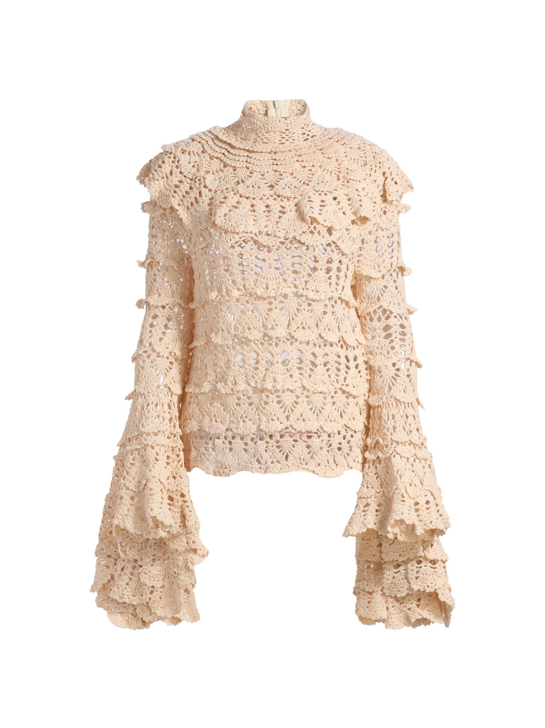 تتميز سترة الكروشيه Hypnotic المصنوعة يدويًا من Zimmermann بكشكشة متتالية وأساور مخددة مبالغ فيها للحصول على صورة بوهيمية فريدة.
