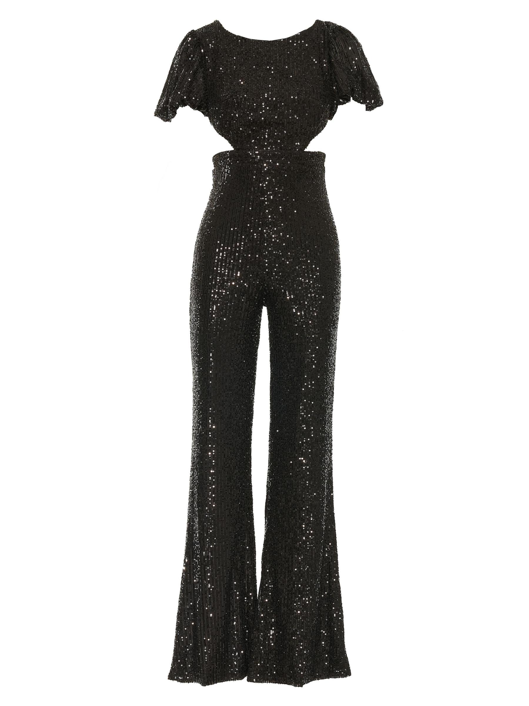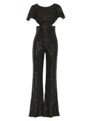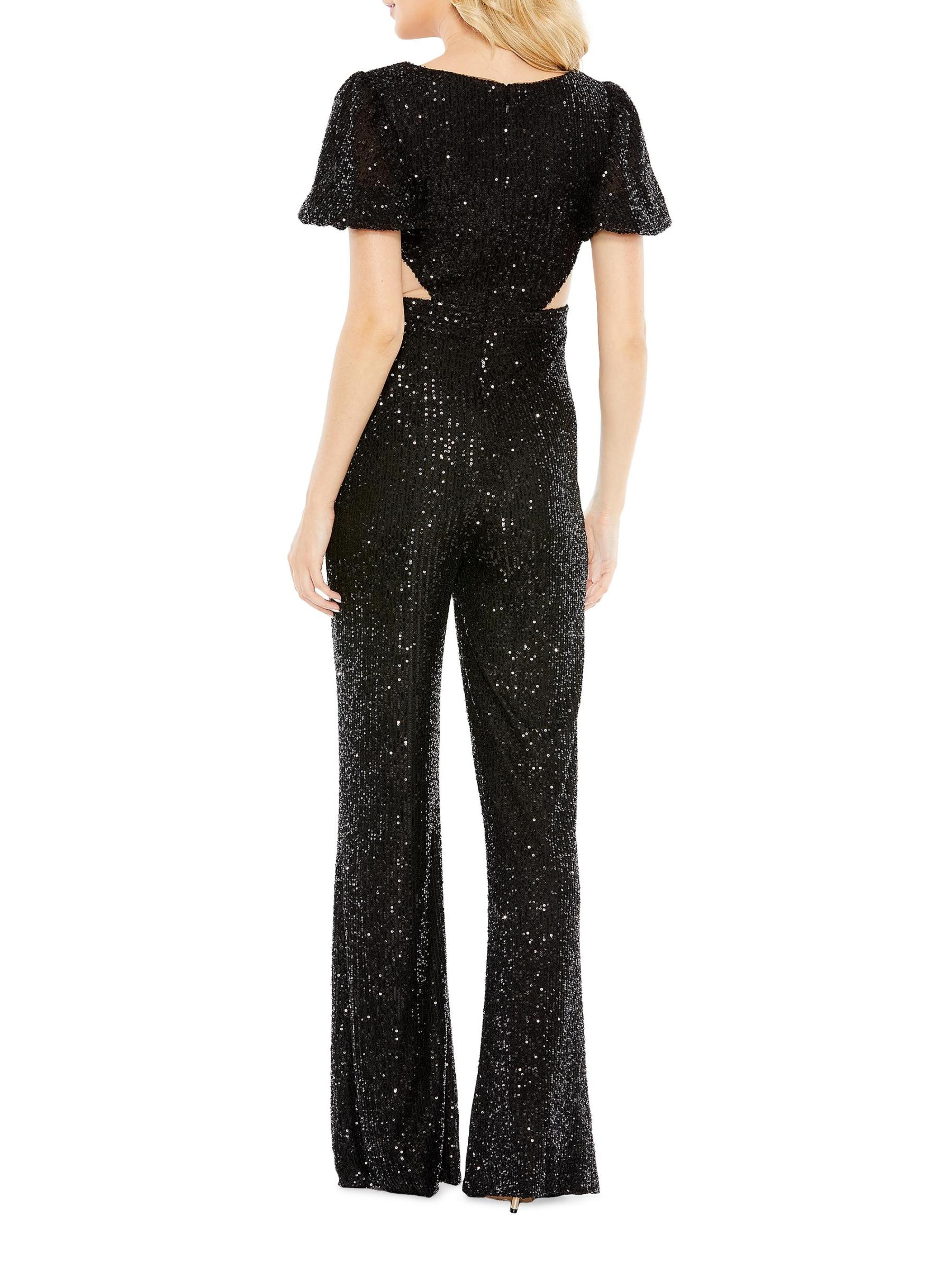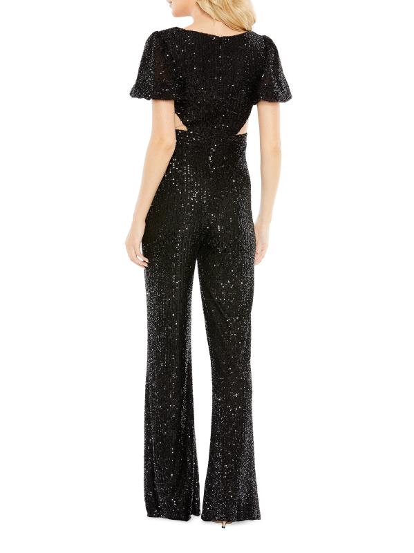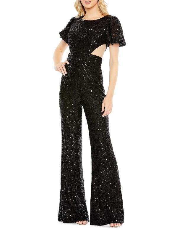 من مجموعة إيرينا. يتميز جمبسوت Mac Duggal الساحر بالترتر اللامع وتفاصيل فتحات الخصر.رقبة مستديرة أكمام قصيرة إغلاق بسحّاب خلفي 100% بوليستر تنظيف البقع مستوردة