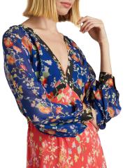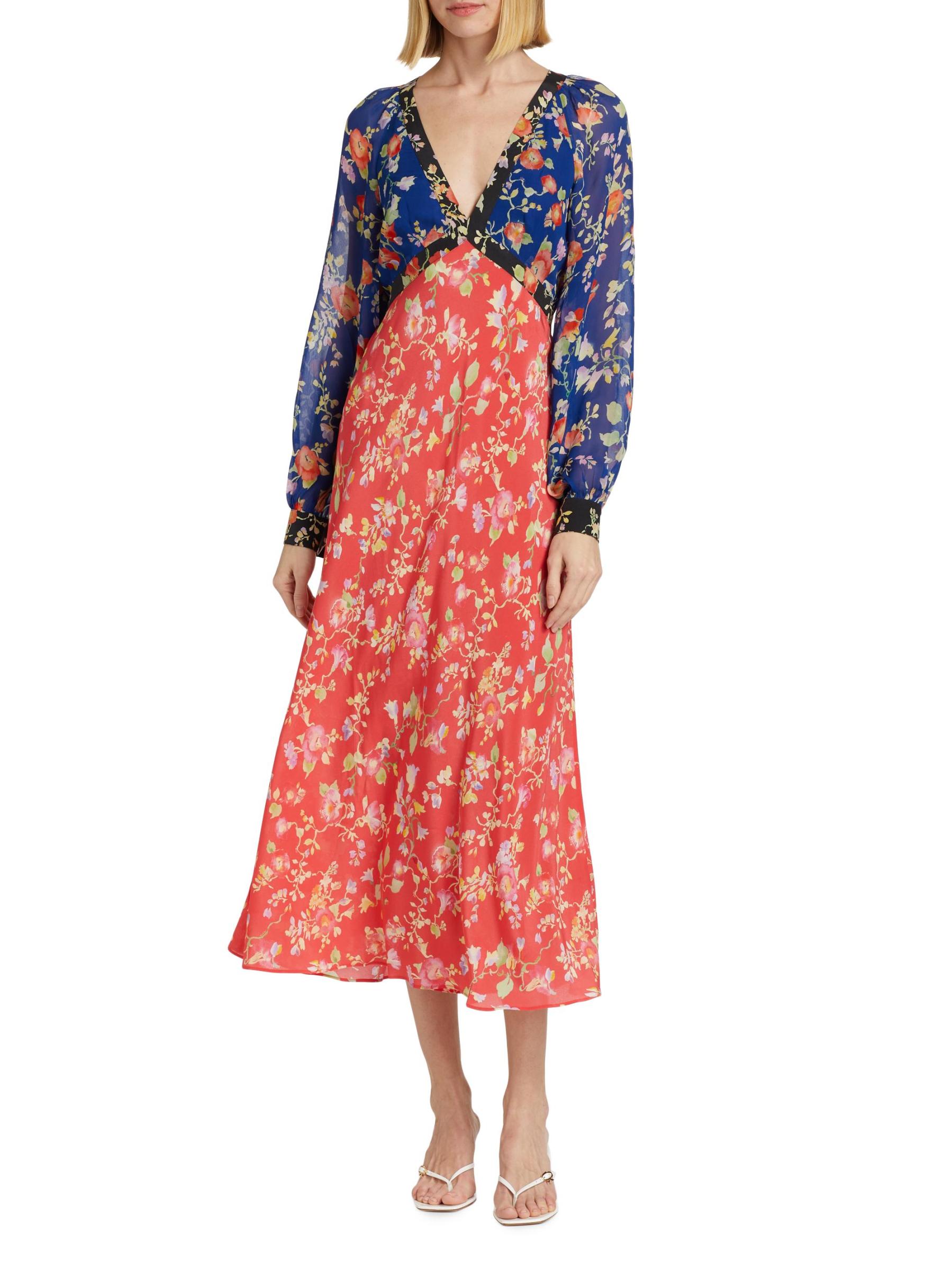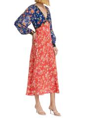 من مجموعة إن ذا سبيريت أوف بالم بيتش. يتميز فستان Ayla المتوسط برقبة على شكل حرف v من Rixo بأكمام بلوزة طويلة مستوحاة من أسلوب السبعينيات. تم رسم طبعة هذه القطعة يدويًا على اسم المؤسس المشارك لشركة Rixo، Orlagh.