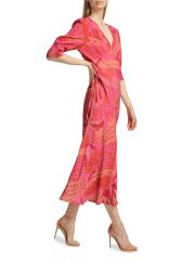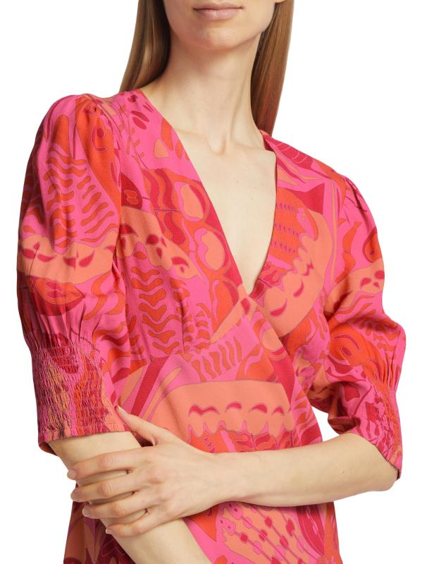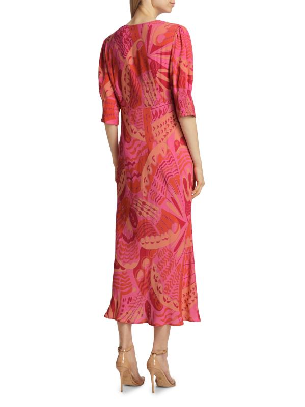من مجموعة إن ذا سبيريت أوف بالم بيتش. فستان Zadie هو فستان ريكسو ميدي الأيقوني الذي يتميز برقبة على شكل حرف V منحازة، وأكمام فضفاضة قليلاً، وأساور مكشكشة جزئيًا، مزينة بطبعة الفراشة التجريدية المرسومة يدويًا.