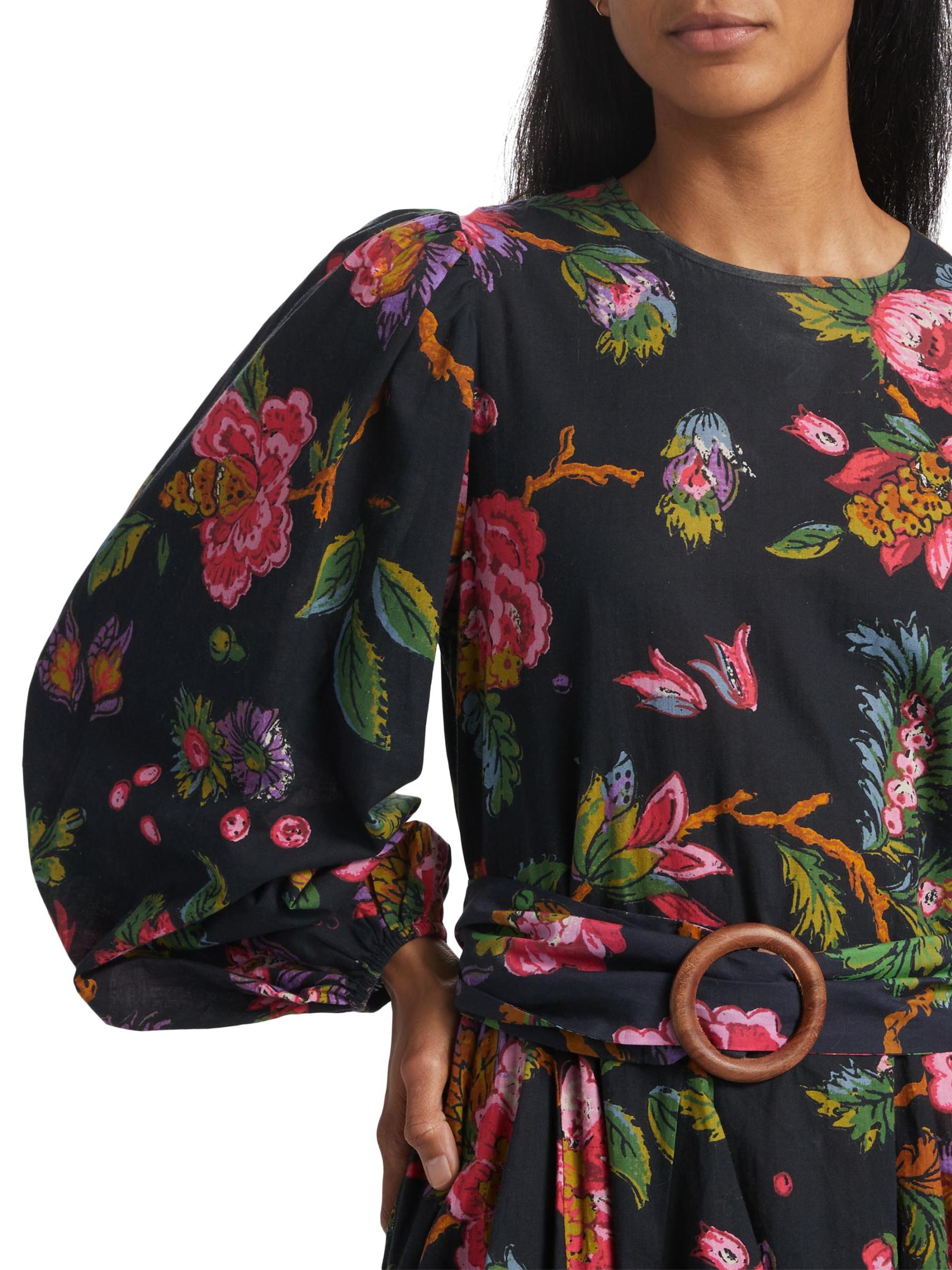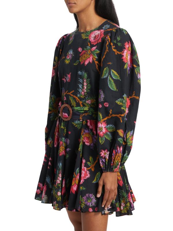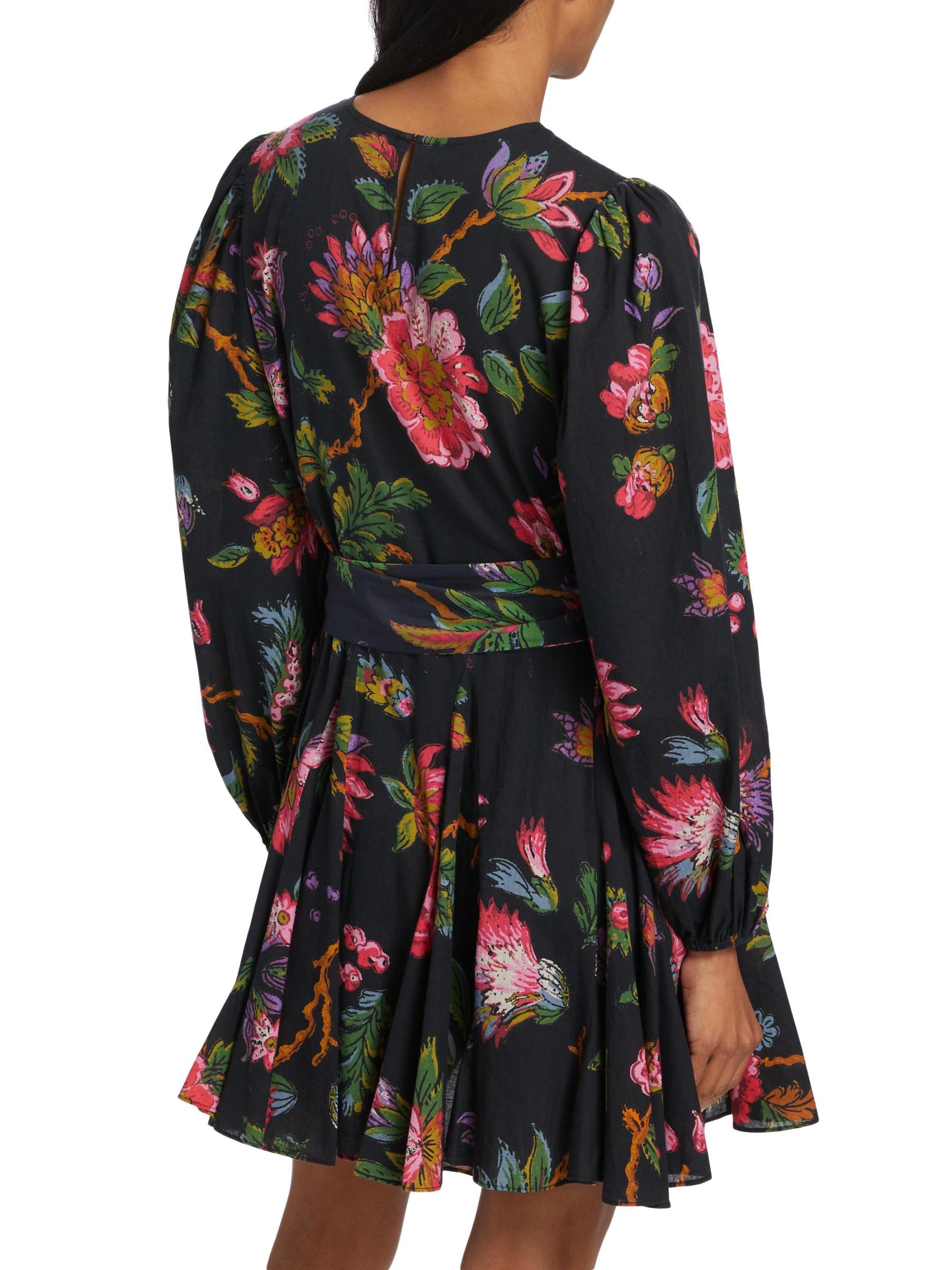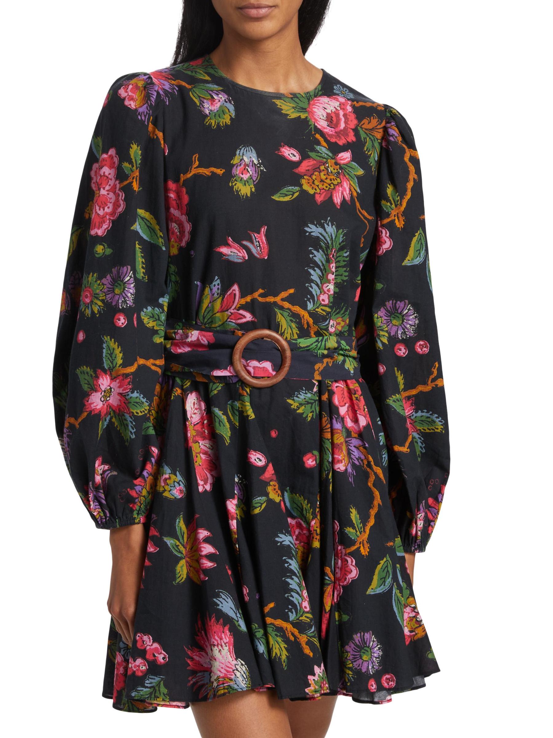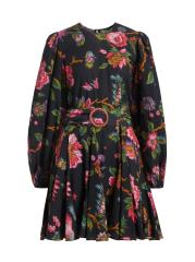 من مجموعة إنك فلور غراندي. فستان Rhode Jenny مصنوع من القطن الزهري. يتميز الطول الصغير بحزام ذاتي لتشكيل الخصر وتنورة دائرية منتفخة.