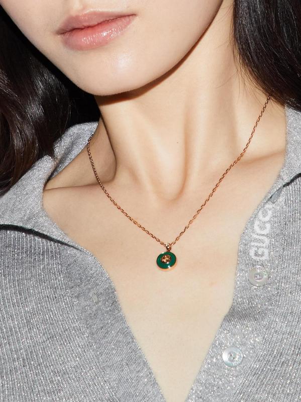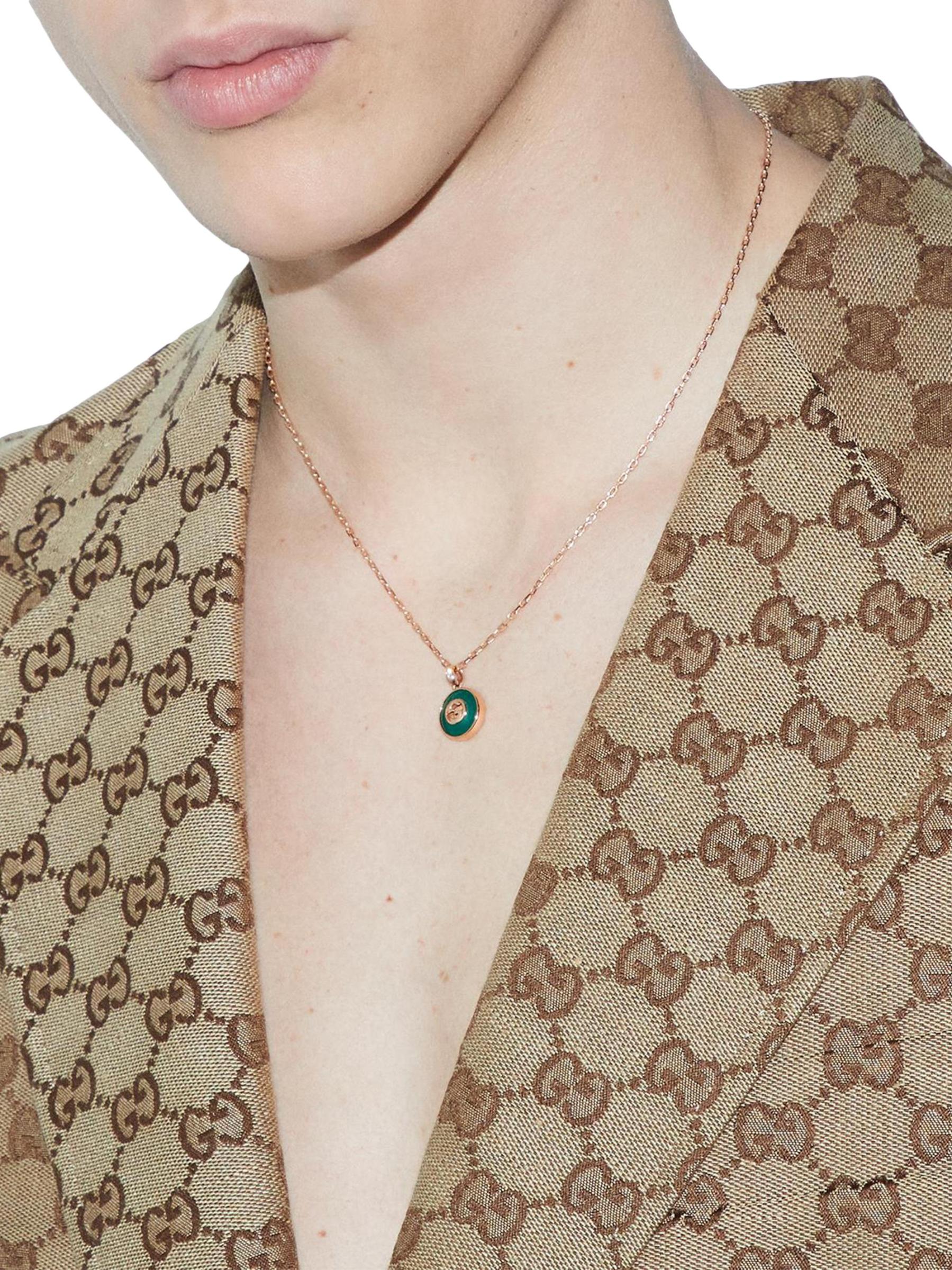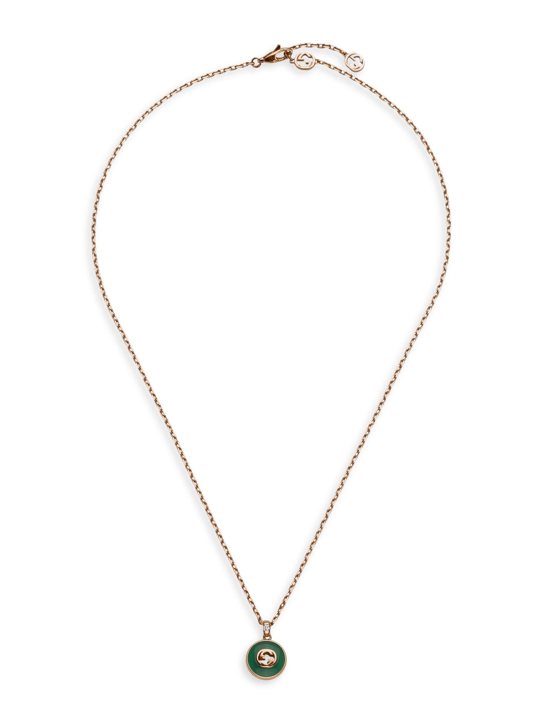 من مجموعة جي المتشابكة. تتميّز قلادة غوتشي المصنوعة من الذهب الوردي عيار 18 قيراطًا بقلادة G المتشابكة المرصعة بالعقيق الأخضر. تضيف ماسة صغيرة مستديرة لمسة من التألق إلى هذا الإكسسوار الأنيق.