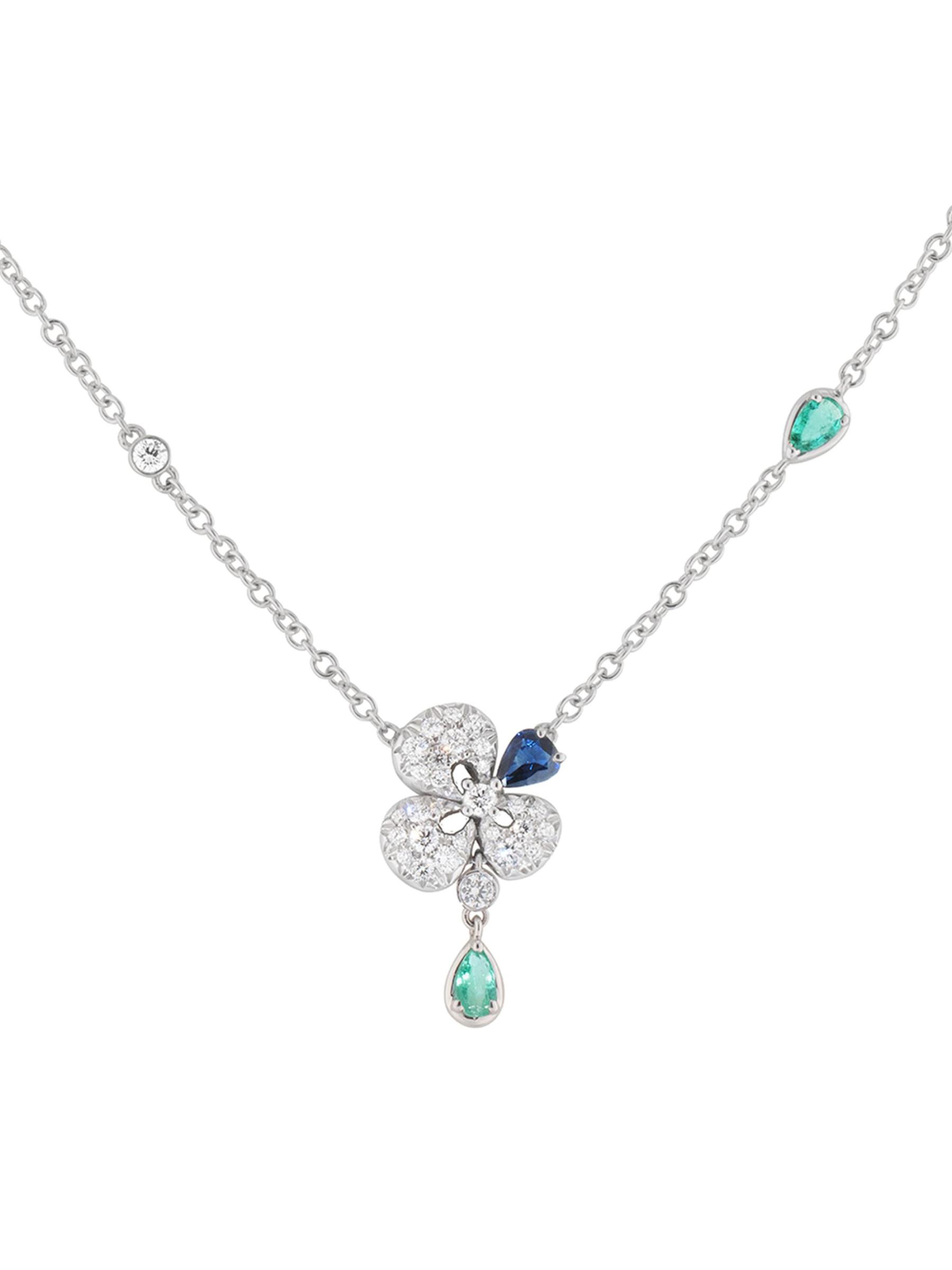 من مجموعة إيشيا. قلادة Miseno الأنيقة المصنوعة يدويًا من الذهب الأبيض عيار 18 قيراطًا تتلألأ بالألماس المرصوف وزمردين مقطوعين على شكل كمثرى وياقوت أزرق واحد.