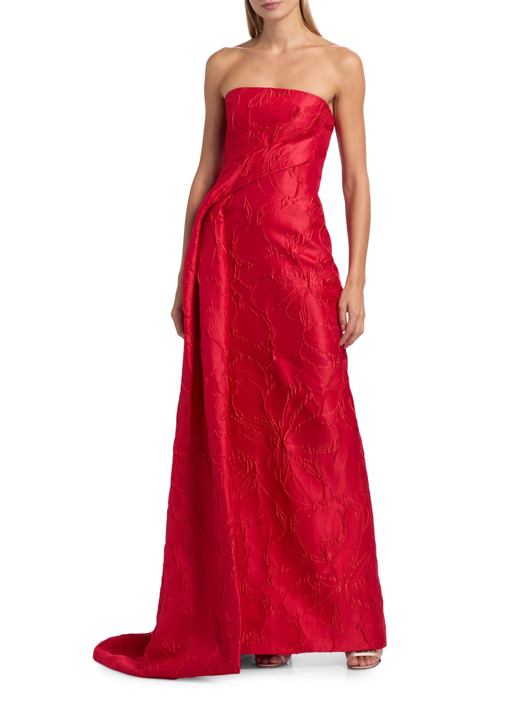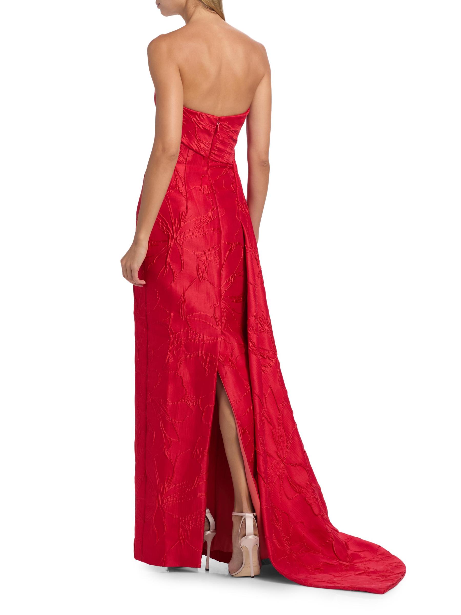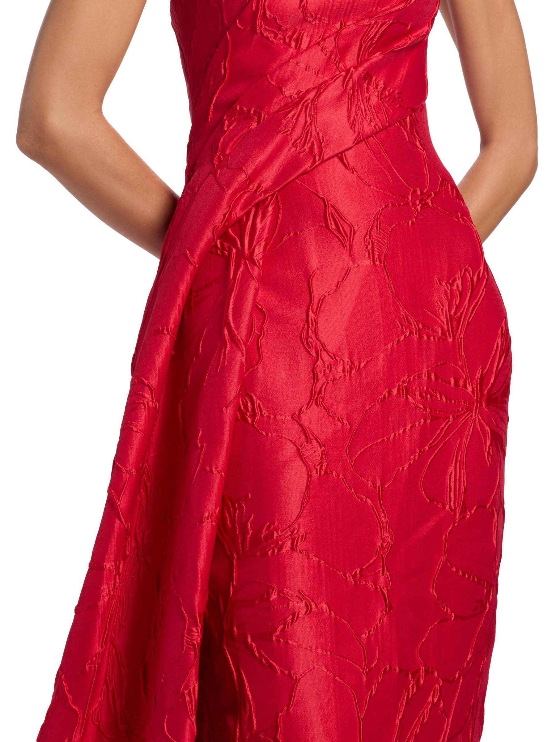 يتميّز فستان Monique Lhuillier الدرامي المُزين بنقشة زهور الجاكار، ويلتف حول الصدّار في شكل ذيل ديناميكي.خط رقبة مستقيم بدون حمالات إغلاق بسحّاب خلفي مخفي 76% بوليستر/ 14% حرير/ 10% بولياميد البطانة: 100% حرير تنظيف جاف صُنع في الولايات المتحدة الأمريكية من قماش إيطالي