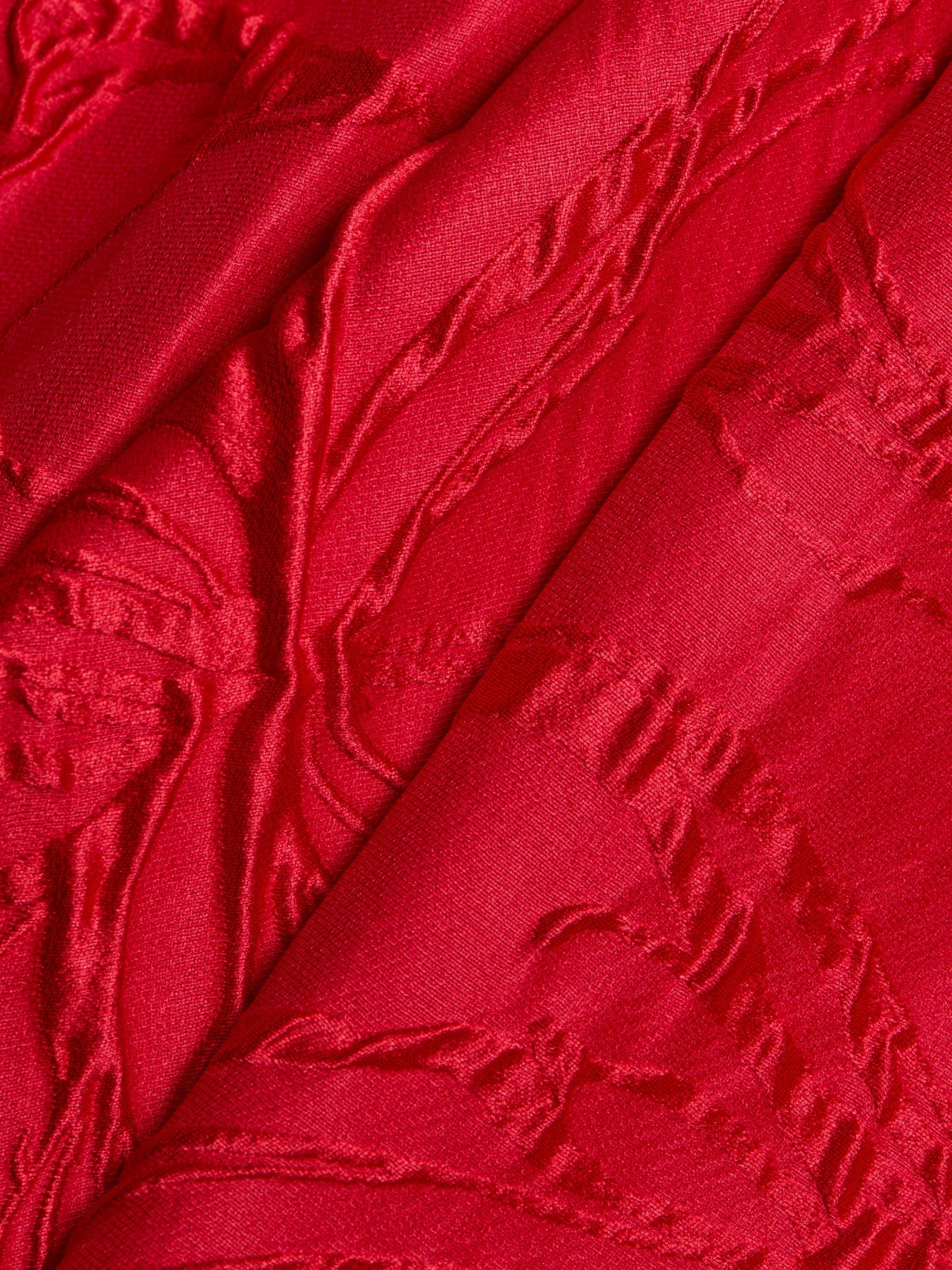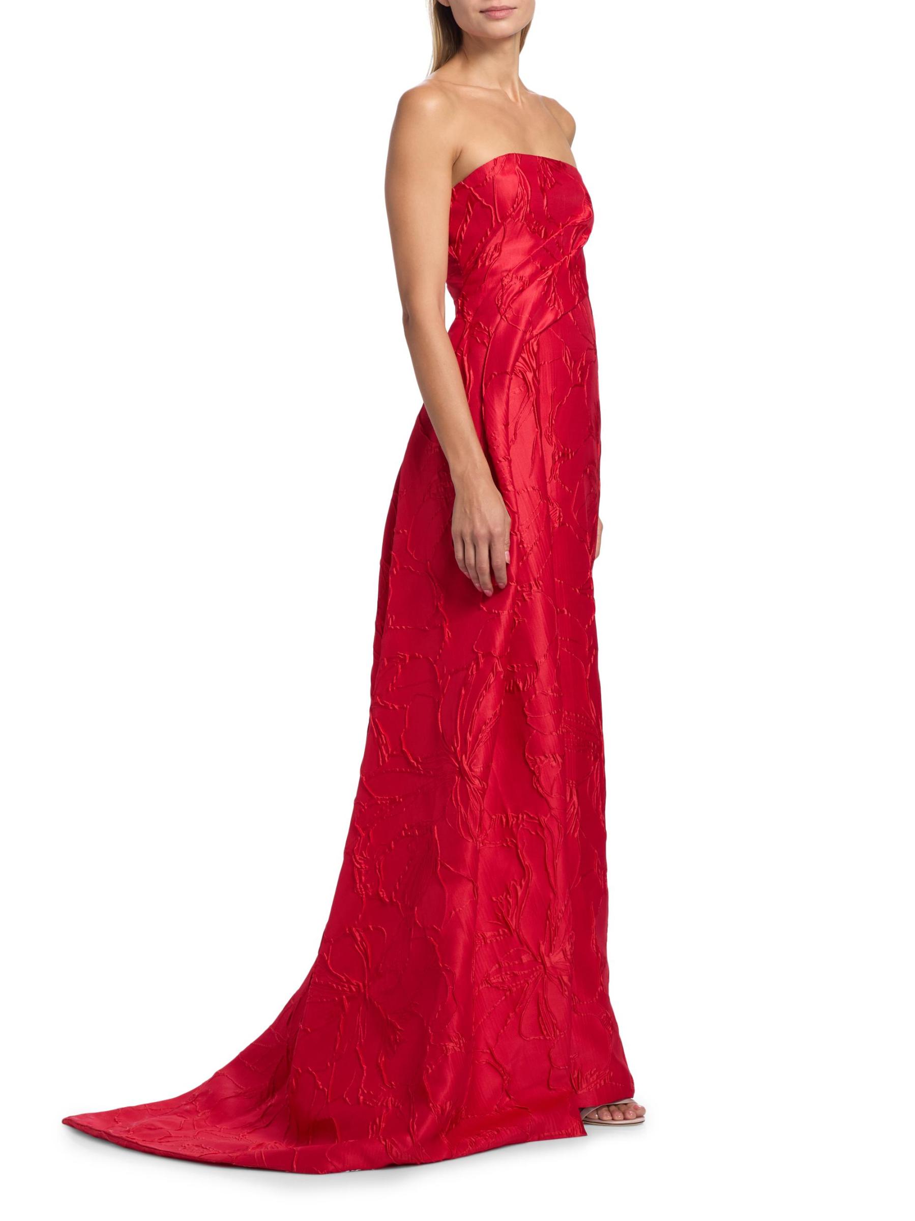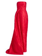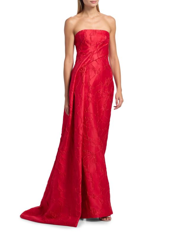 يتميّز فستان Monique Lhuillier الدرامي المُزين بنقشة زهور الجاكار، ويلتف حول الصدّار في شكل ذيل ديناميكي.خط رقبة مستقيم بدون حمالات إغلاق بسحّاب خلفي مخفي 76% بوليستر/ 14% حرير/ 10% بولياميد البطانة: 100% حرير تنظيف جاف صُنع في الولايات المتحدة الأمريكية من قماش إيطالي