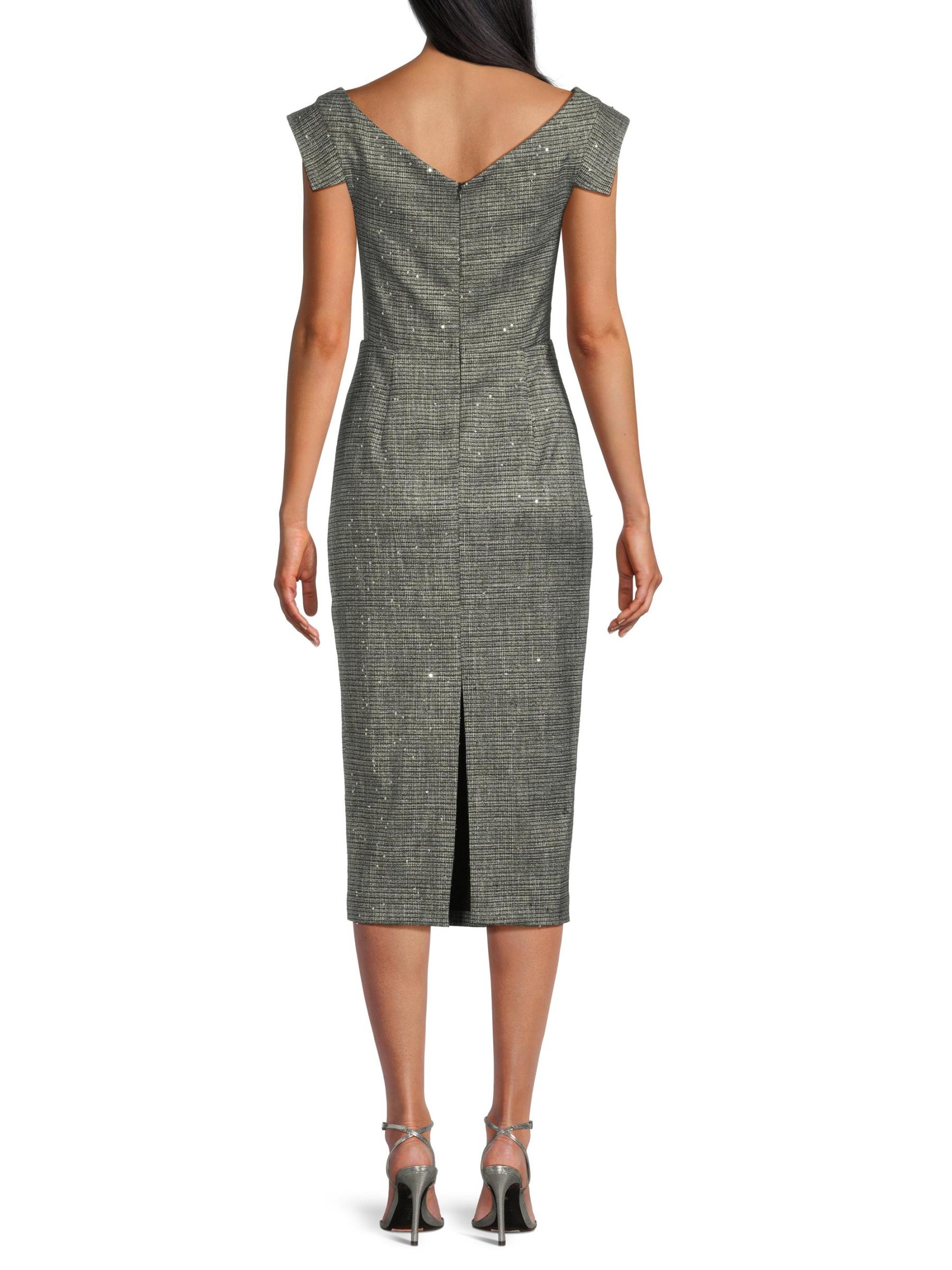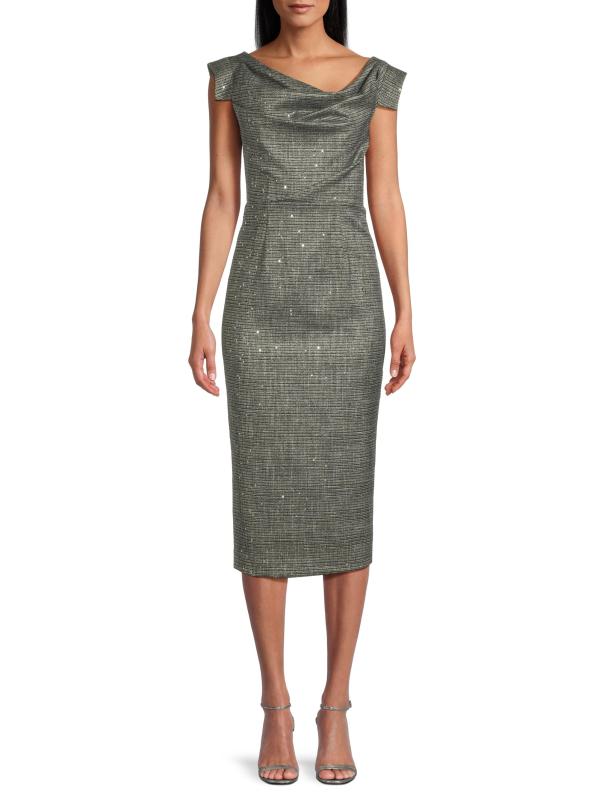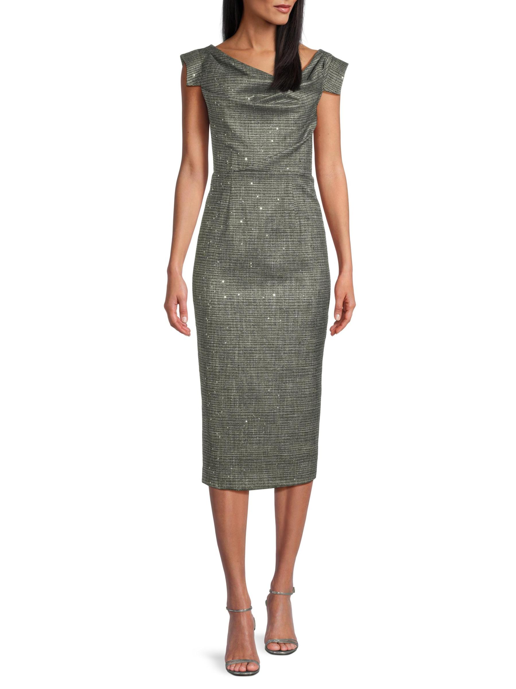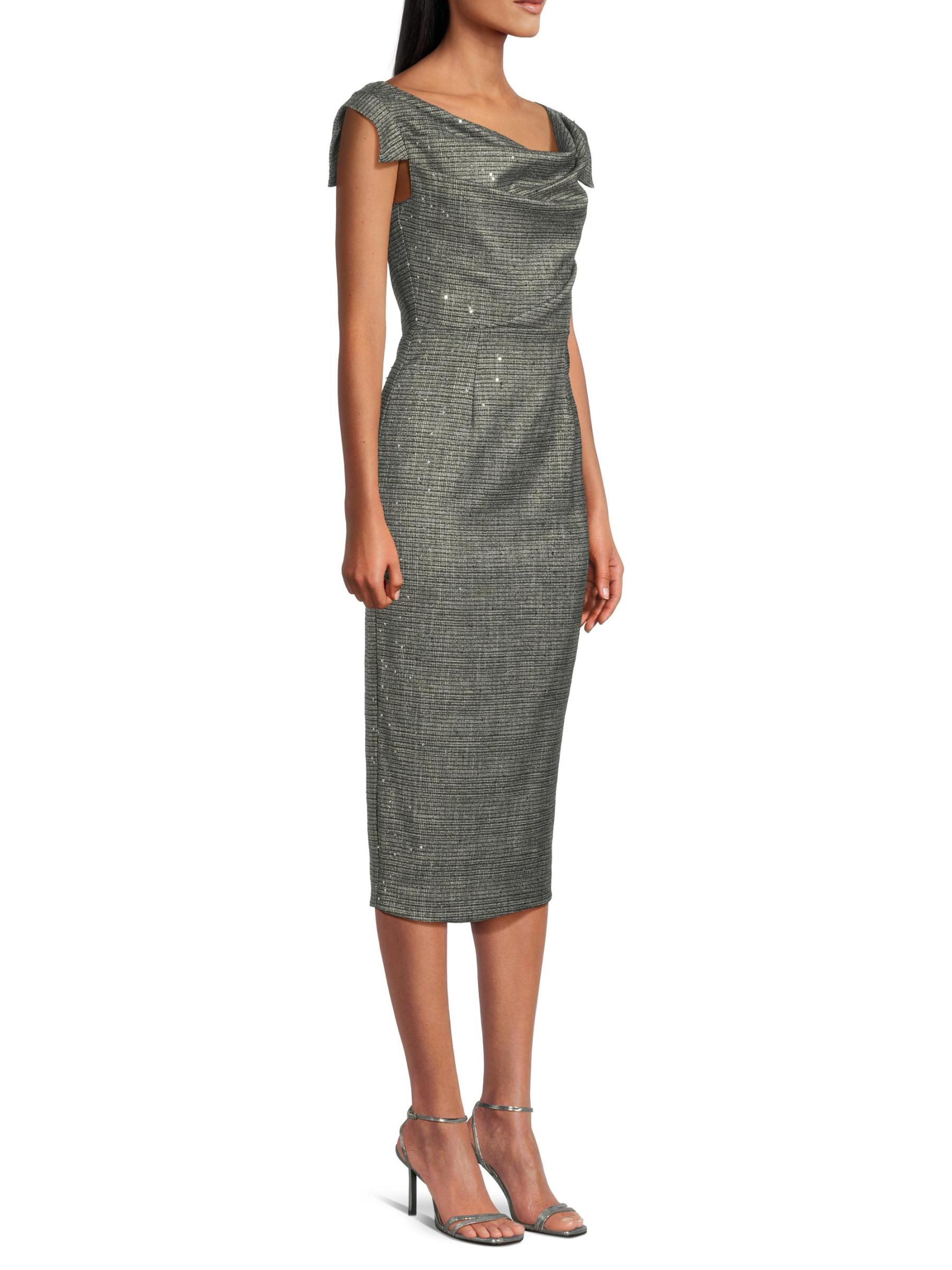 يتميّز فستان جاكلين المتوسّط من بلاك هالو، المصنوع من بدلة منقوشة مطرّزة بالترتر، بتقويرة منسدلة على شكل قلنسوة مكشوفّة على الكتف وأكمام مفتوحة وتنورة ضيقة بقلم رصاص. هذه القطعة مبطنة بالكامل وتتضمن تفاصيل صدرية مطوية.رقبة على شكل قارب بأكتاف مكشوفة أكمام بطبعة صدرية مطوية خصر منفوش شق خلفي إغلاق بسحّاب خلفي مخفي 59% بولي أميد/ 35% فيسكوز/ 3% إيلاستين/ 3% ألياف معدنية البطانة: 96% بولياميد/ 4% إليستين تنظيف جاف صُنع في الولايات المتحدة الأمريكية من قماش مستورد