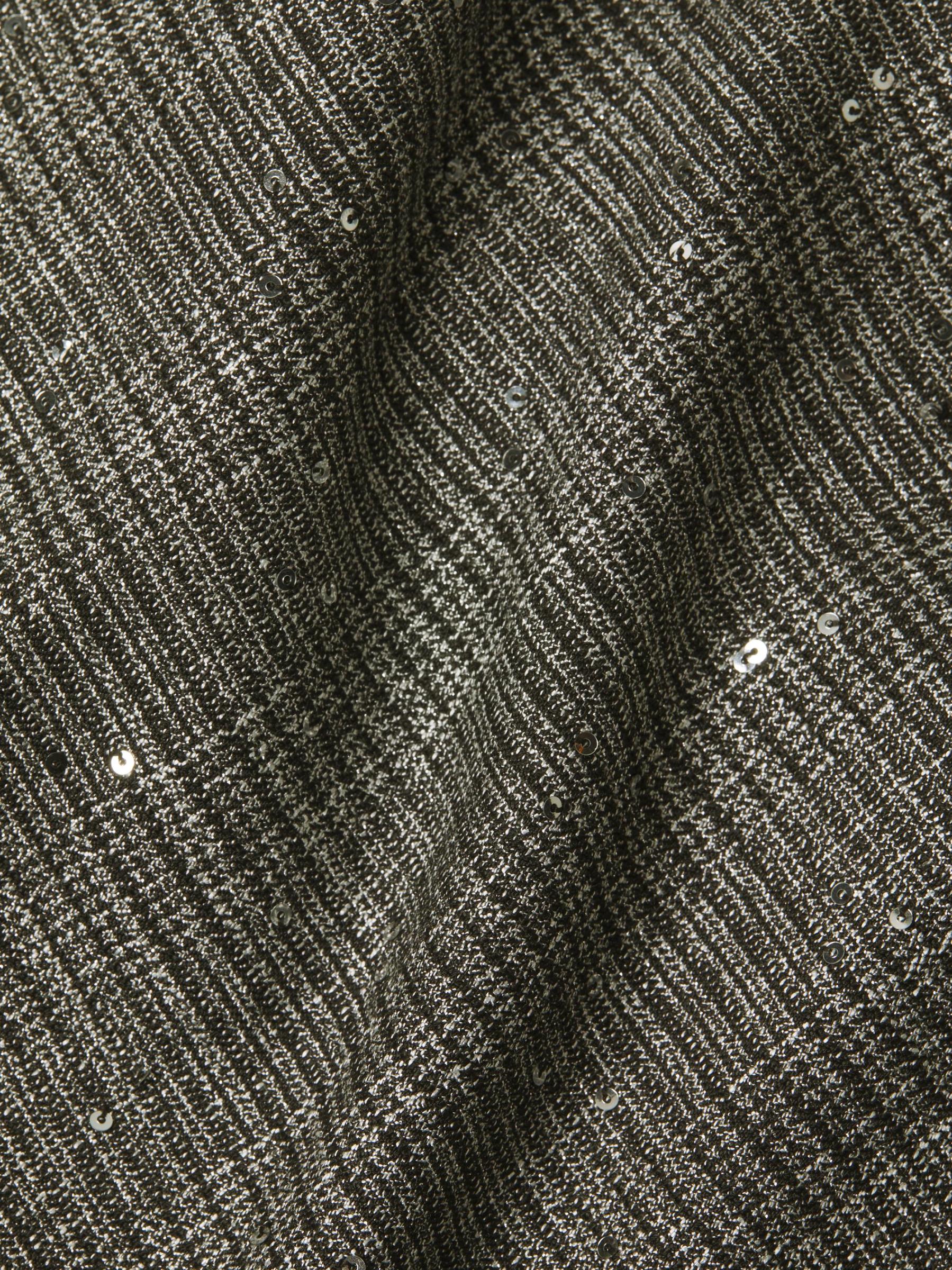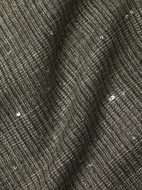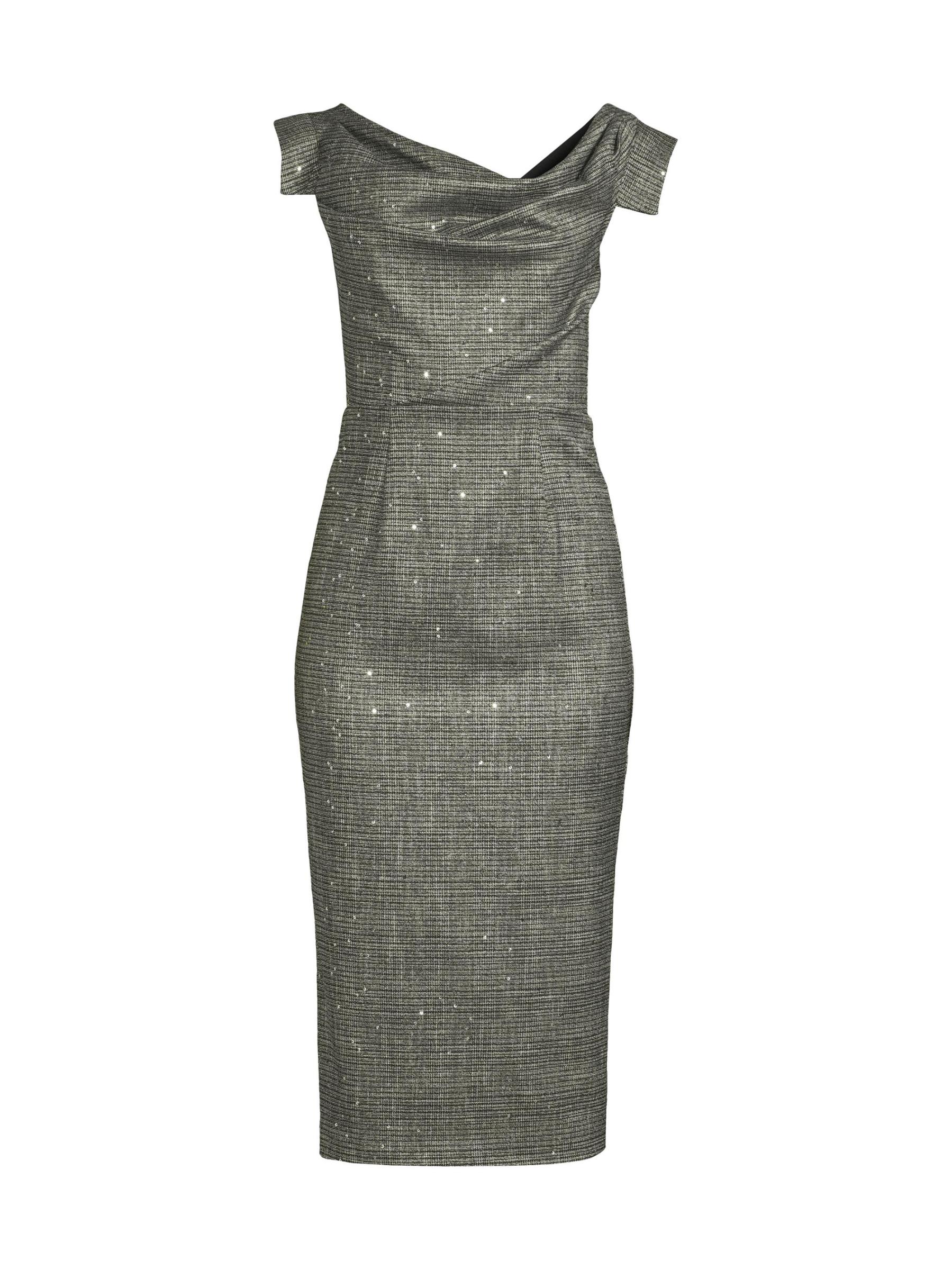 يتميّز فستان جاكلين المتوسّط من بلاك هالو، المصنوع من بدلة منقوشة مطرّزة بالترتر، بتقويرة منسدلة على شكل قلنسوة مكشوفّة على الكتف وأكمام مفتوحة وتنورة ضيقة بقلم رصاص. هذه القطعة مبطنة بالكامل وتتضمن تفاصيل صدرية مطوية.