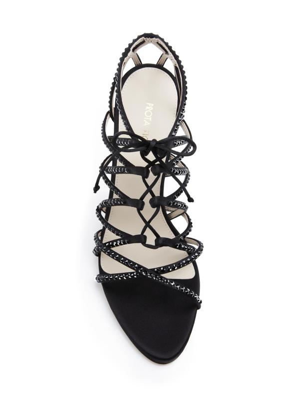 تم تصميم صندل Jamesia من بروتا فيوري في شكل قفص. صُنع هذا الحذاء يدويًا في إيطاليا من الحرير المستدام والأنيق، وهو مُعزّز بكعب خنجر مذهل.