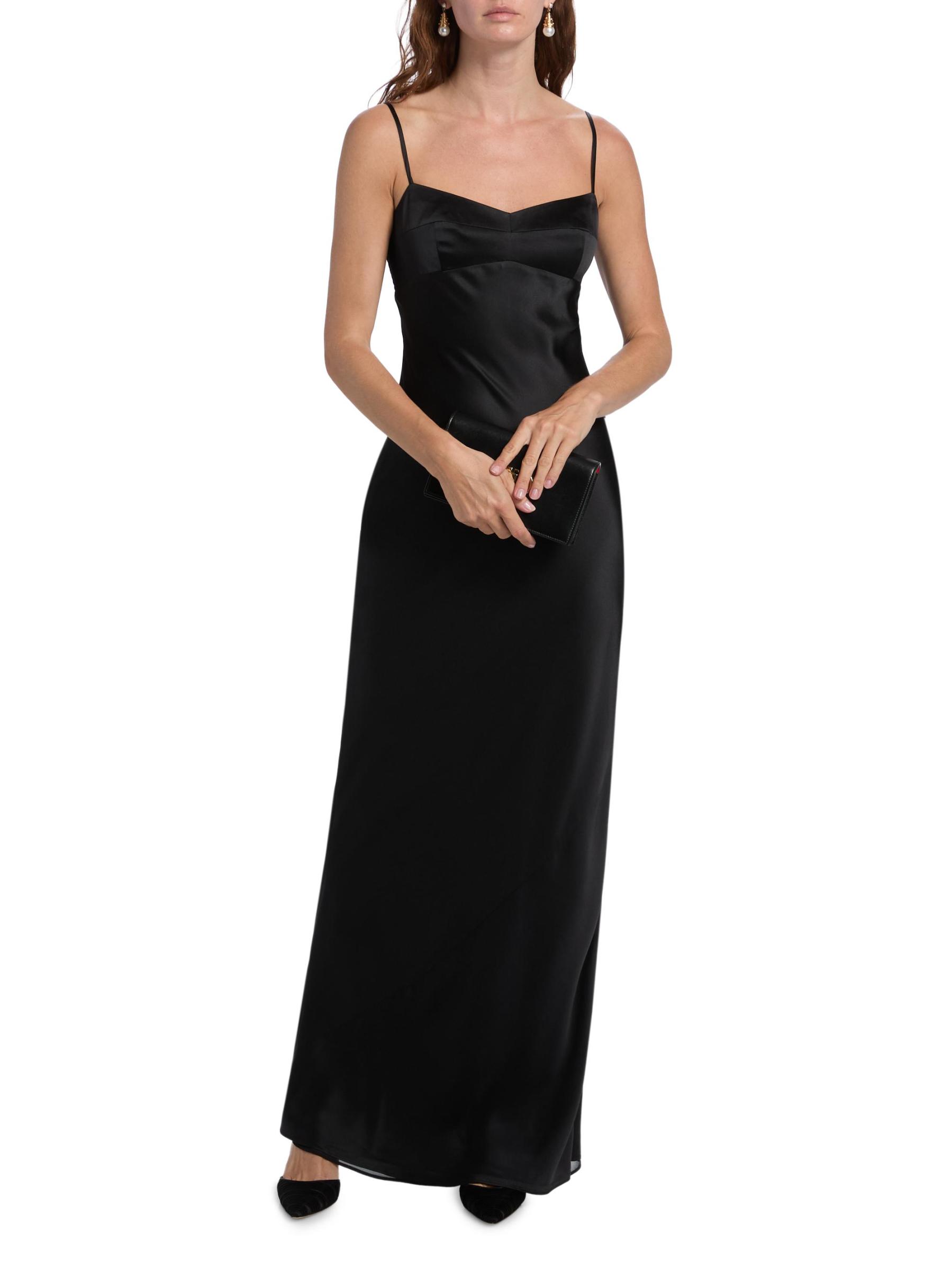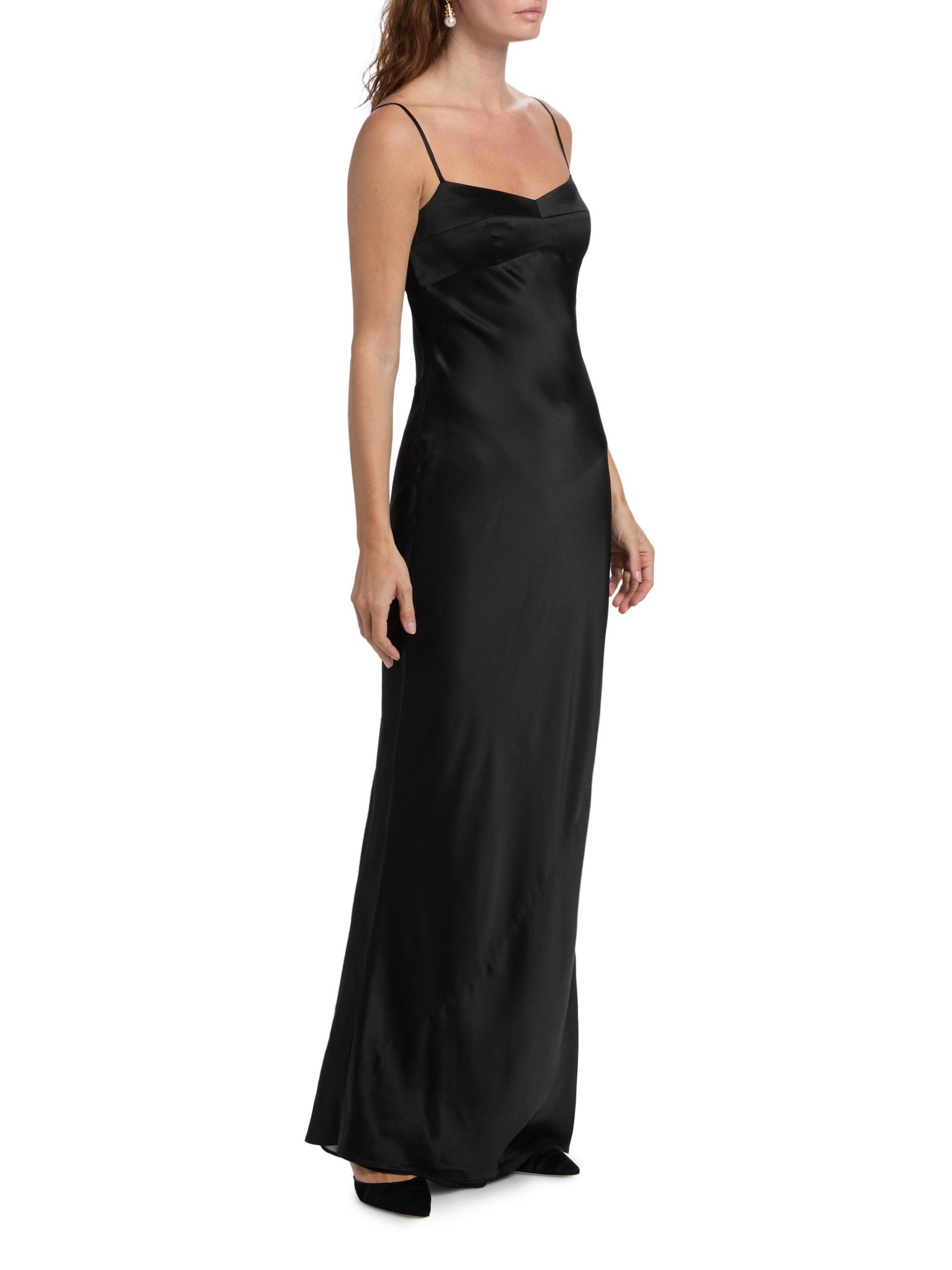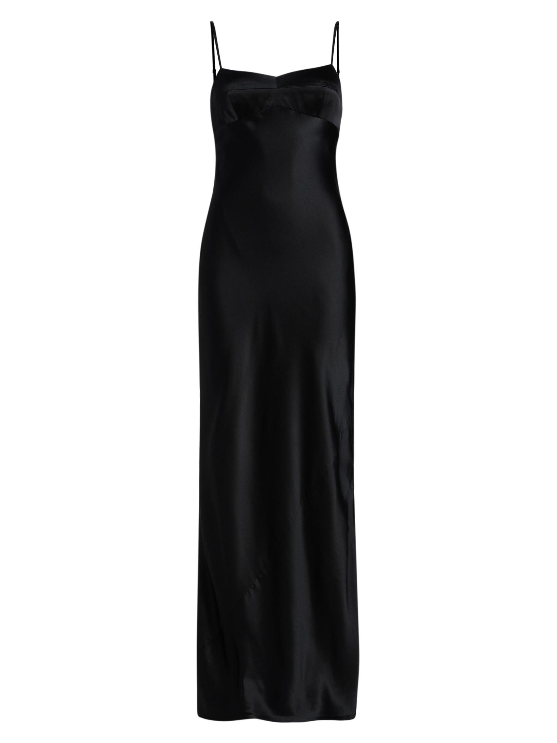 يتميّز فستان Janeiro الطويل من Amadan Uprichard، المصنوع من حرير الساتان الفاخر، بتقويرة رومنسية محاطة بأحزمة سباغيتي قابلة للتعديل. يُبرز هذا التصميم المنزلق الجزء الخلفي بتفاصيل جذابة.