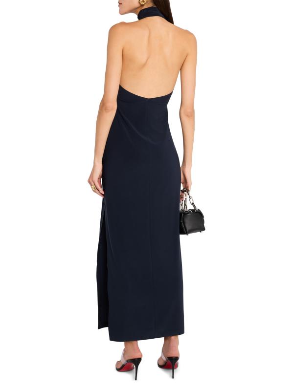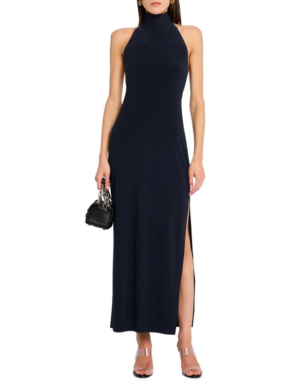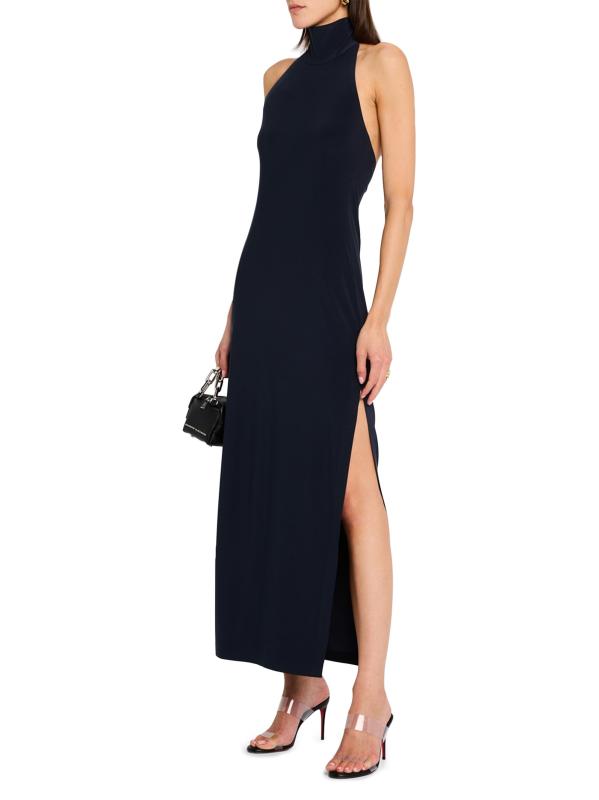 صُمم فستان نورما كامالي الأنيق هذا من الجيرسيه اللامع القابل للتمدد بأربعة اتجاهات، ويتميز برقبة رسن مخططة وظهر مكشوف وشق جانبي جريء يصل إلى الفخذ.