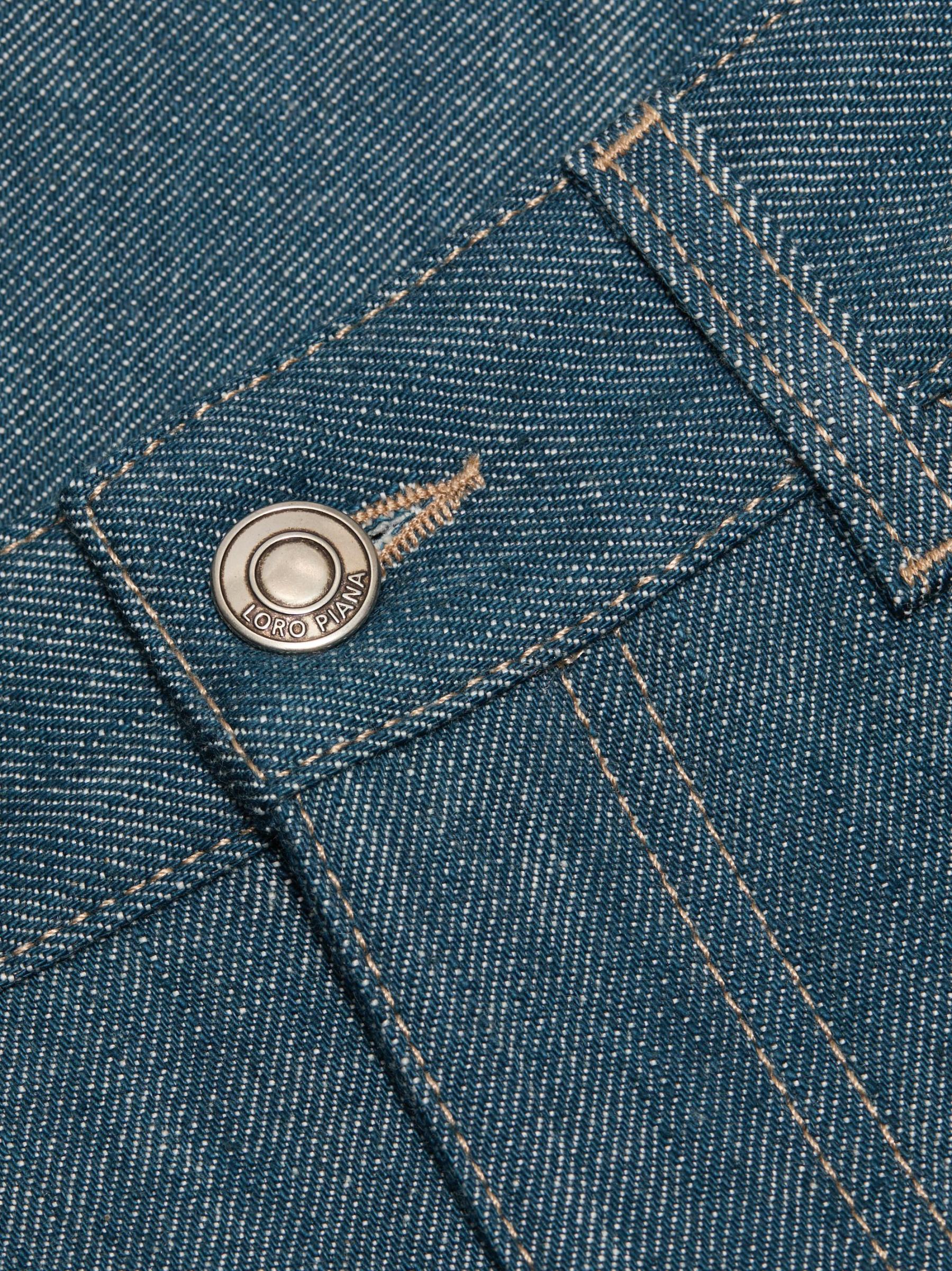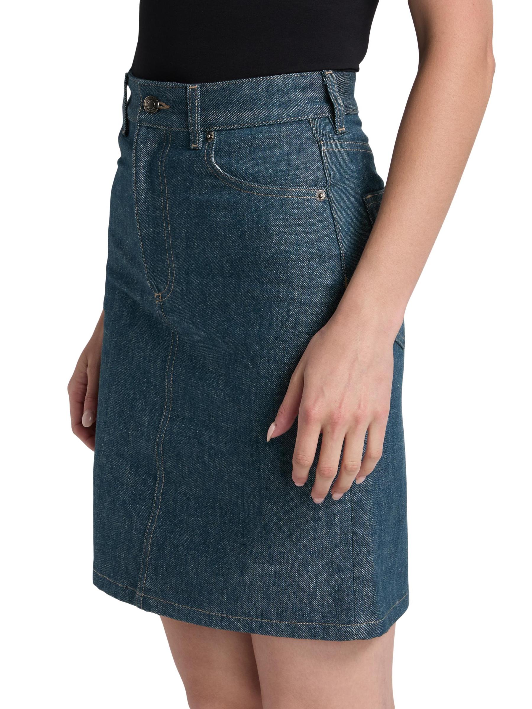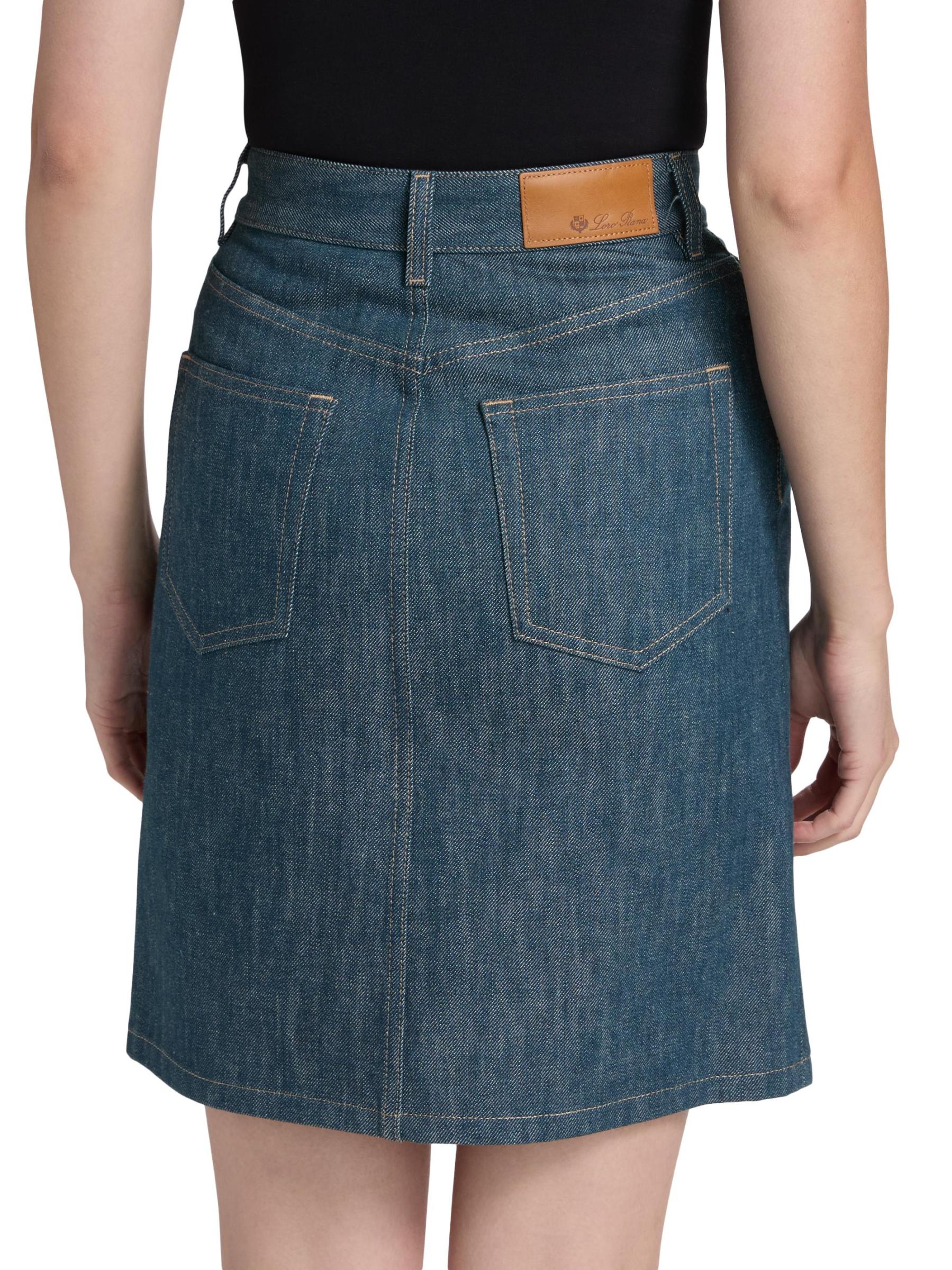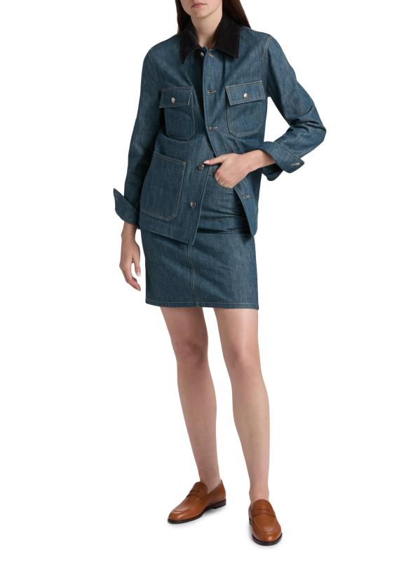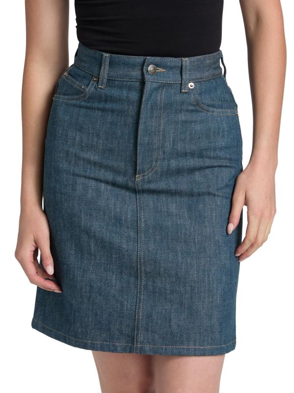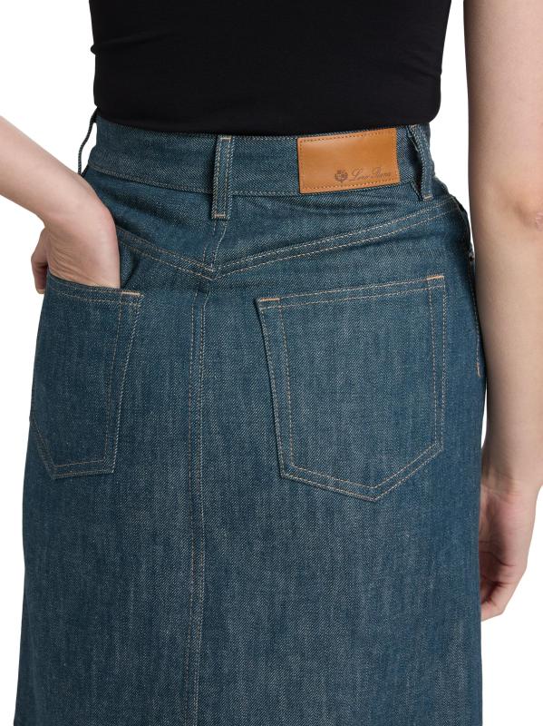 صُممت تنورة Joanne من Loro Piana المصنوعة من الدنيم الأوستيني لتتوافق مع التصميم الهرمي المصمم خصيصًا مع تصميم كلاسيكي بخمسة جيوب.