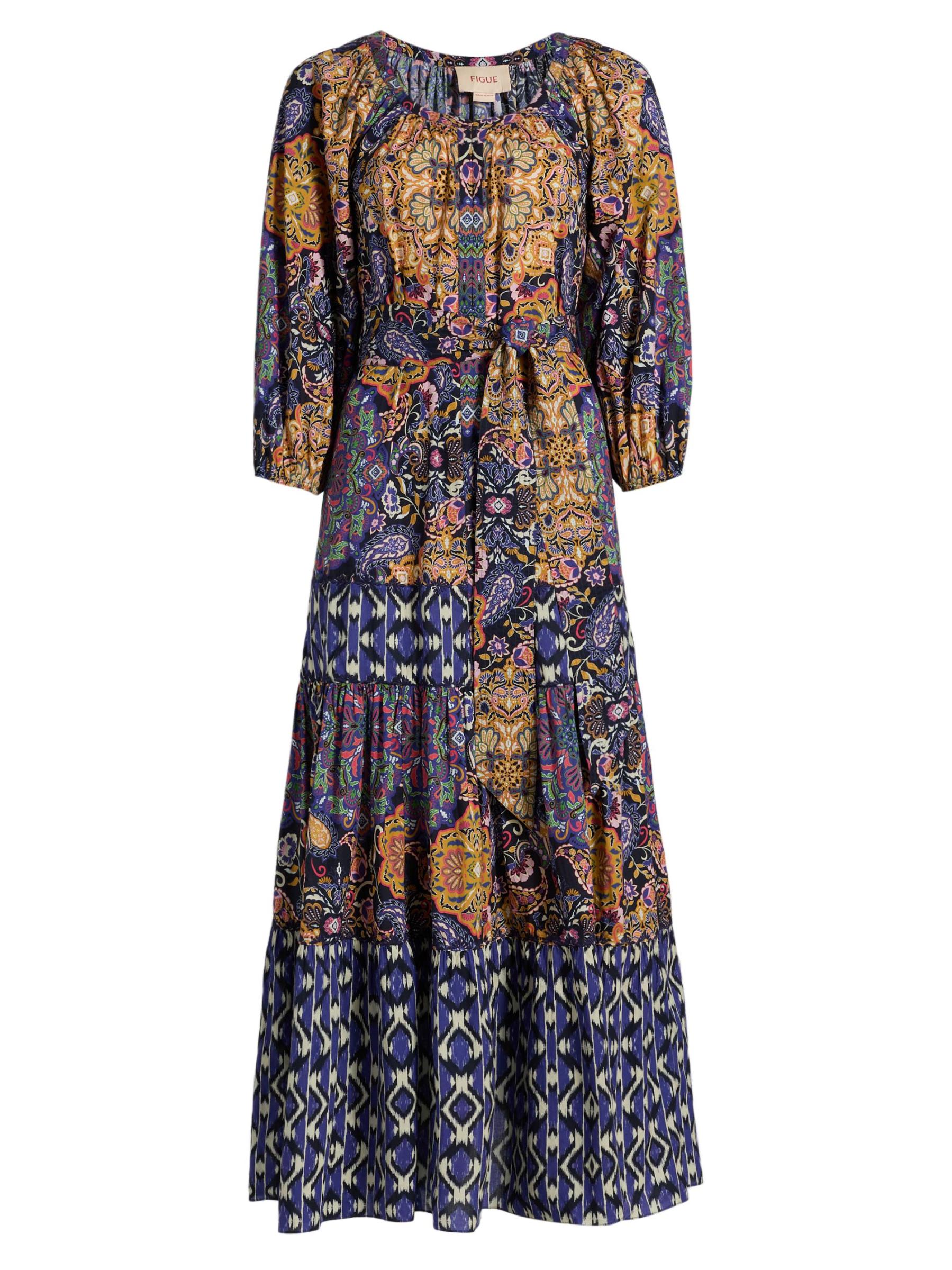 يتميز فستان Johanna maxi من Figue المصنوع من القطن بطبعات متعددة، بما في ذلك الأنماط المستوحاة من البيزلي وإيكات، وتنورة متدرجة متوسطة الطول.رقبة منقسمة أكمام بطول ثلاثة أرباع حزام ربط ذاتي تسحب قطن بنسبة 100% تنظيف جاف مستوردة