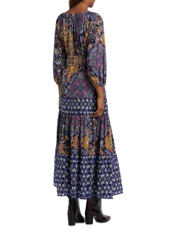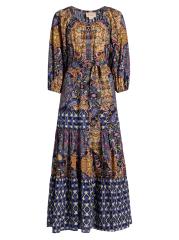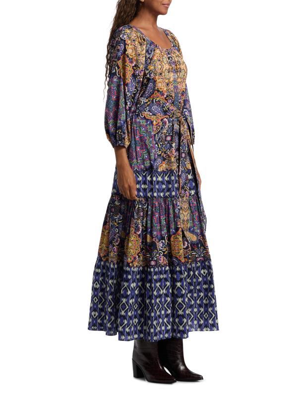 يتميز فستان Johanna maxi من Figue المصنوع من القطن بطبعات متعددة، بما في ذلك الأنماط المستوحاة من البيزلي وإيكات، وتنورة متدرجة متوسطة الطول.